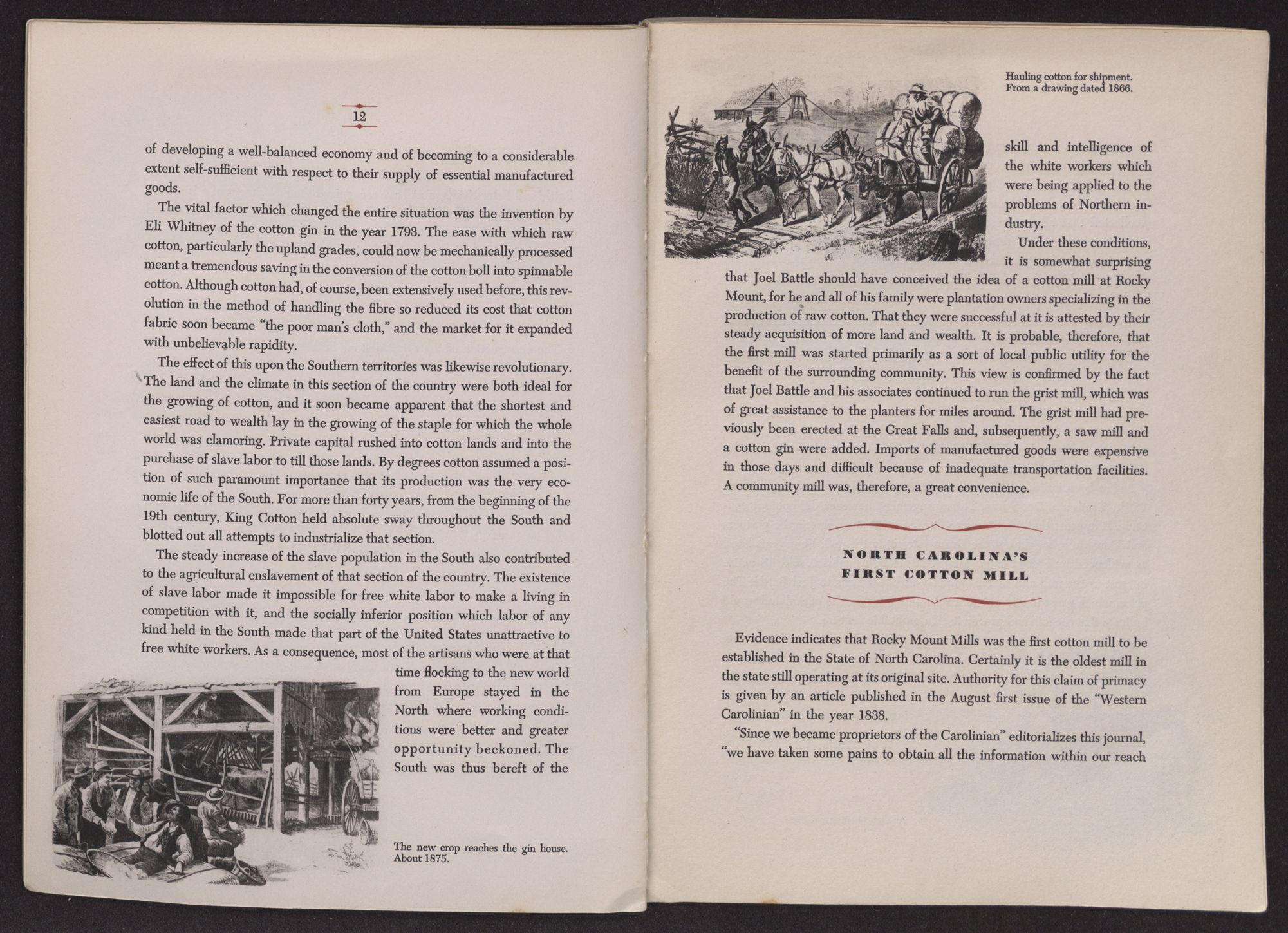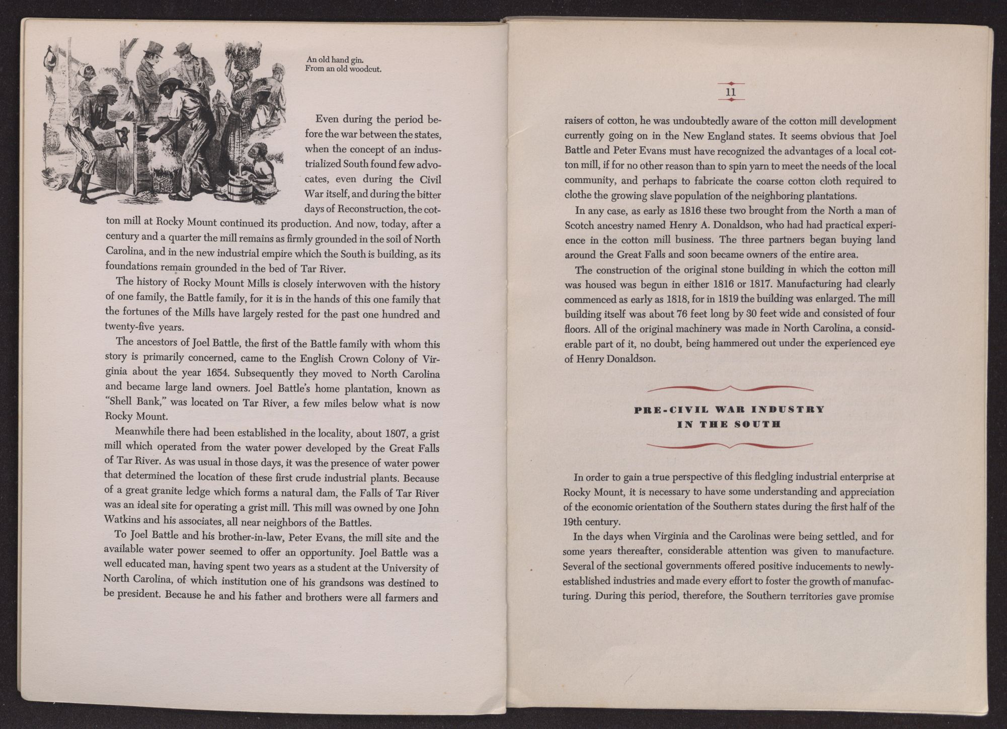 Twelve feet deep, at high water, beneath the turbulent current at the Falls of Tar River, the solid rock foundations of the first Rocky Mount cotton mill stand today as firm and massive as they were when first they were laid and pointed up back in 1817 by plantation owner Joel Battle's negro slaves. There is no indication in this rugged bit of construction of the inefficiency of slave labor; nor is there any indication in the history of Rocky Mount Mills of the “decadence” of the old South, slave itself to King Cotton and to the unbalanced economy of that bygone era.