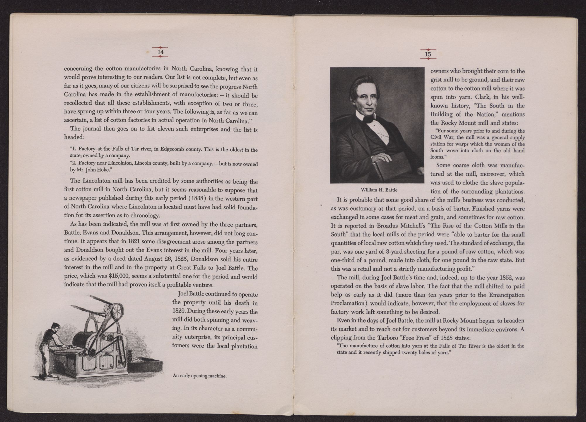 James Smith Battle, who with his son acquired control of Rocky Mount Mills in 1847, was one of the largest plantation owners in North Carolina. At the time of his death, he owned about 20,000 acres of rich river land especially suitable for cotton raising, and was the master of some 500 slaves. At then current values, this slave holding was itself worth more than $300,000.