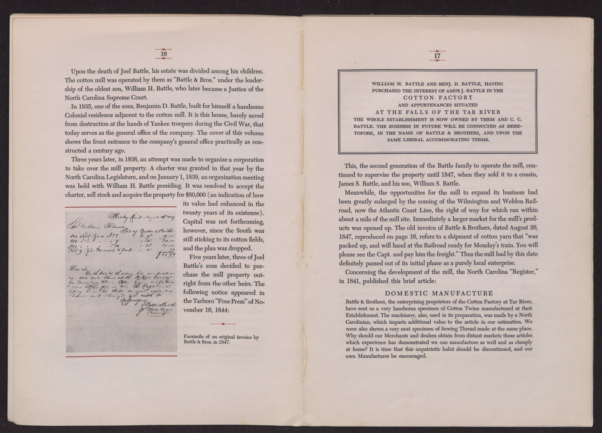 Meanwhile, the opportunities for the mill to expand its business had been greatly enlarged by the coming of the Wilmington and Weldon Railroad, now the Atlantic Coast Line, the right of way for which ran within about a mile of the mill site. Immediately a larger market for the mill's products was opened up. The old invoice of Battle & Brothers, dated August 26, 1847, reproduced on page 16, refers to a shipment of cotton yarn that “was packed up, and will hand at the Railroad ready for Monday's train. You will please see the Capt. and pay him the freight.” Thus the mill had by this date definitely passed out of its initial phase as a purely local enterprise.