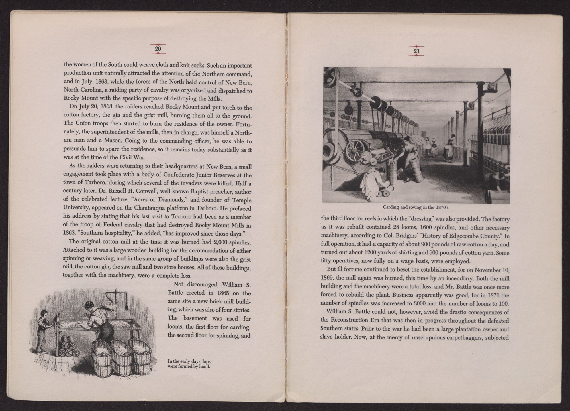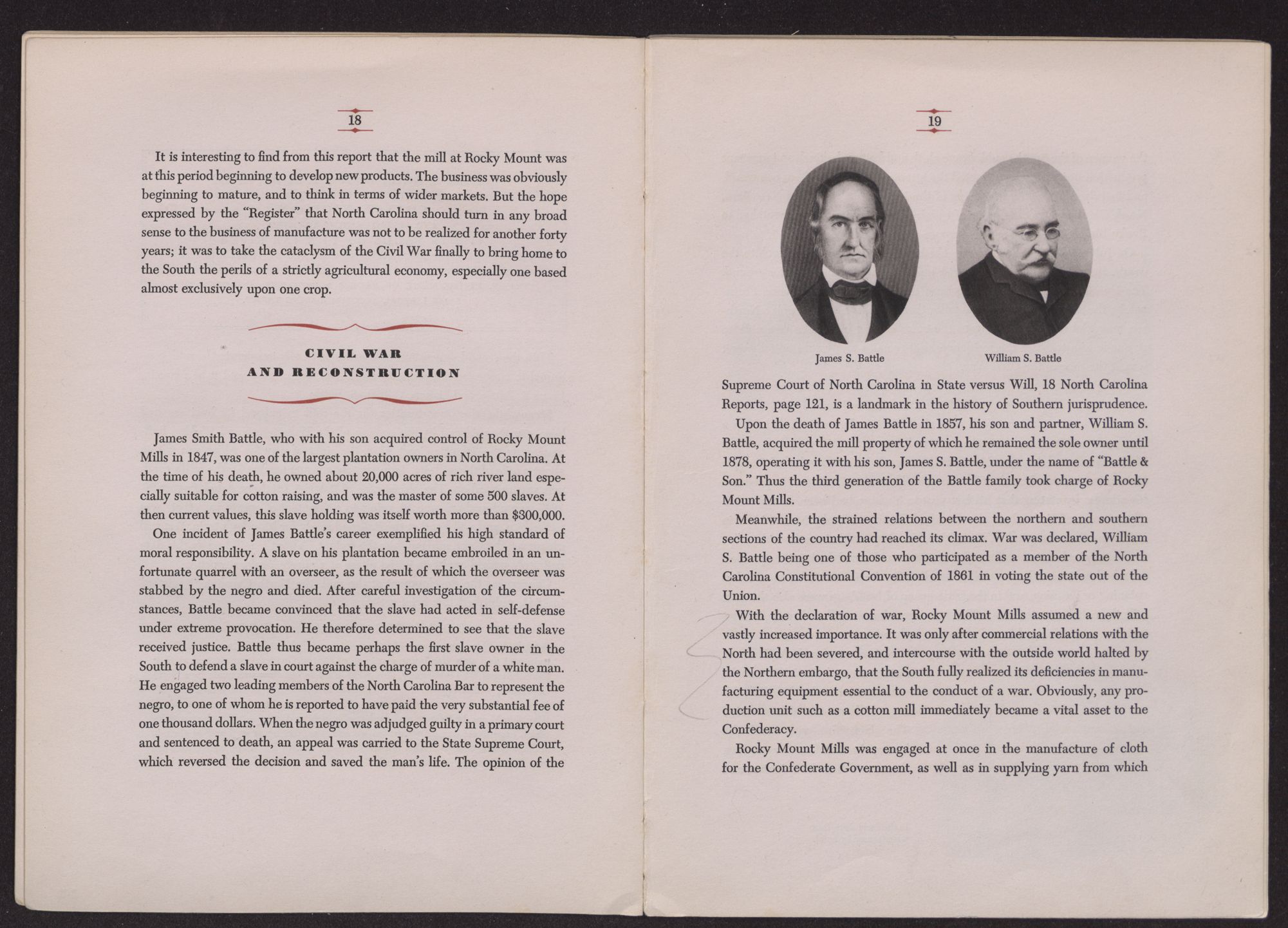 Even during the period before the war between the states, when the concept of an industrialized South found few advocates, even during the Civil War itself, and during the bitter days of Reconstruction, the cotton mill at Rocky Mount continued its production. And now, today, after a century and a quarter the mill remains as firmly grounded in the soil of North Carolina, and in the new industrial empire which the South is building, as its foundations remain grounded in the bed of Tar River.