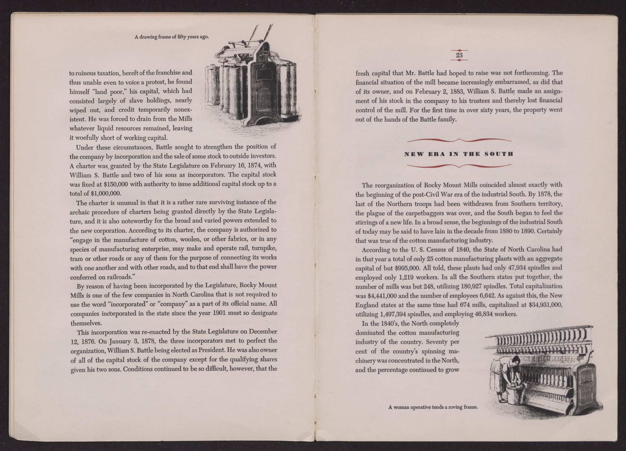 The story of Rocky Mount Mills is significant, also, because it symbolizes the beginning and the growth of the industrial South. As the first cotton mill to be established in the State of North Carolina and one of the first such enterprises to be established below the Mason and Dixon line, Rocky Mount Mills has its place in the industrial history of that great section of the United States which is today, after many vicissitudes, realizing its full potentialities as a contributor to the nation's wealth and economic strength.