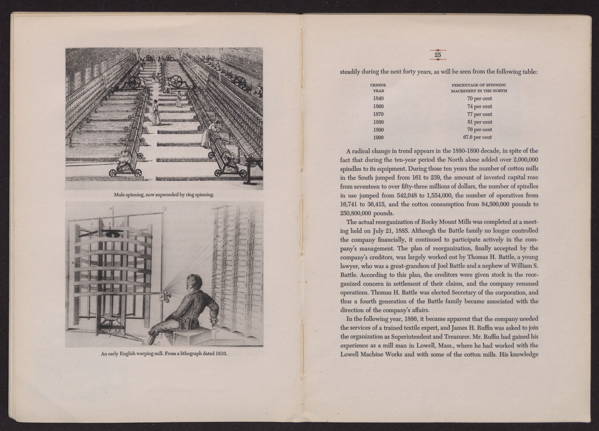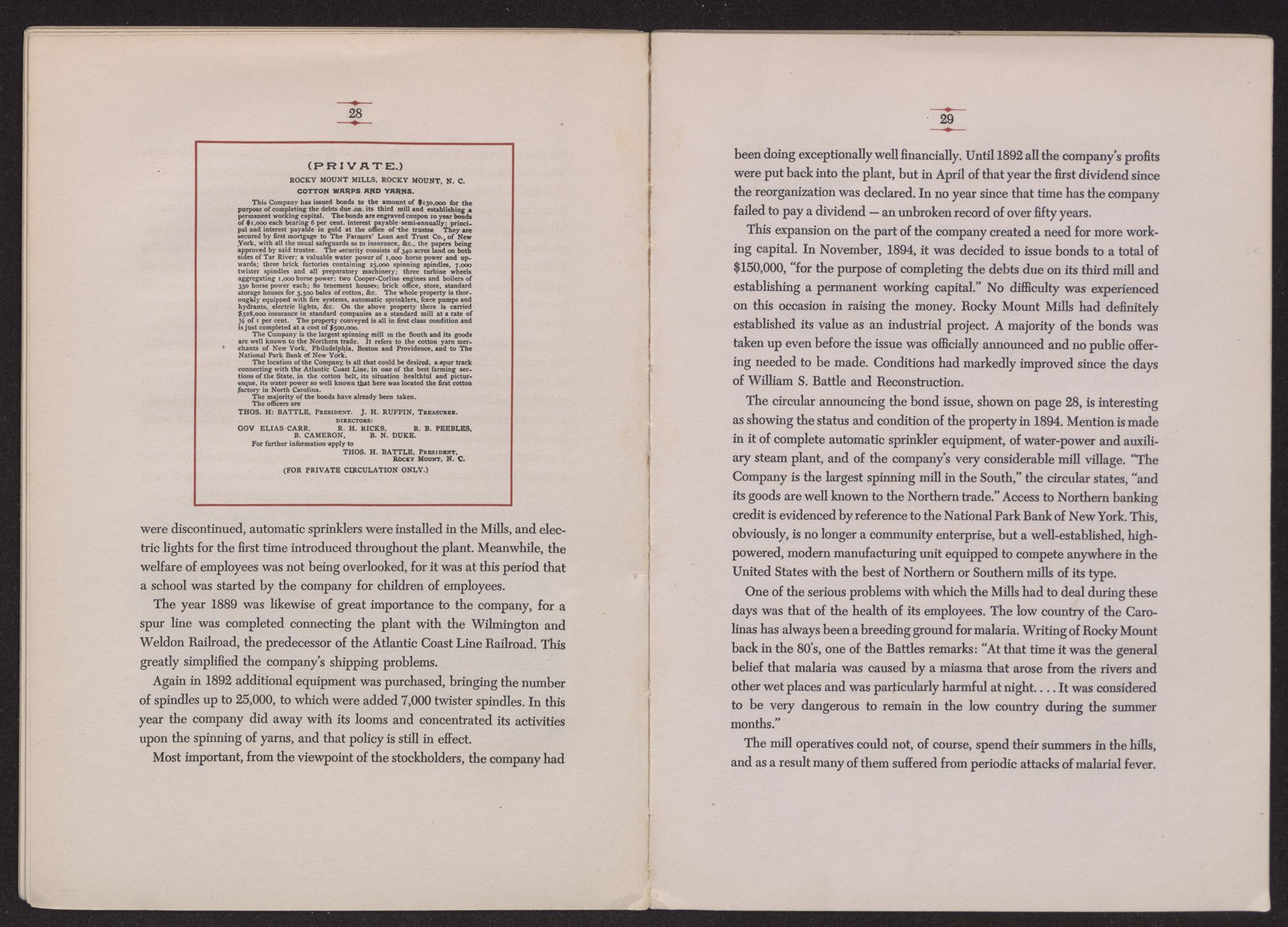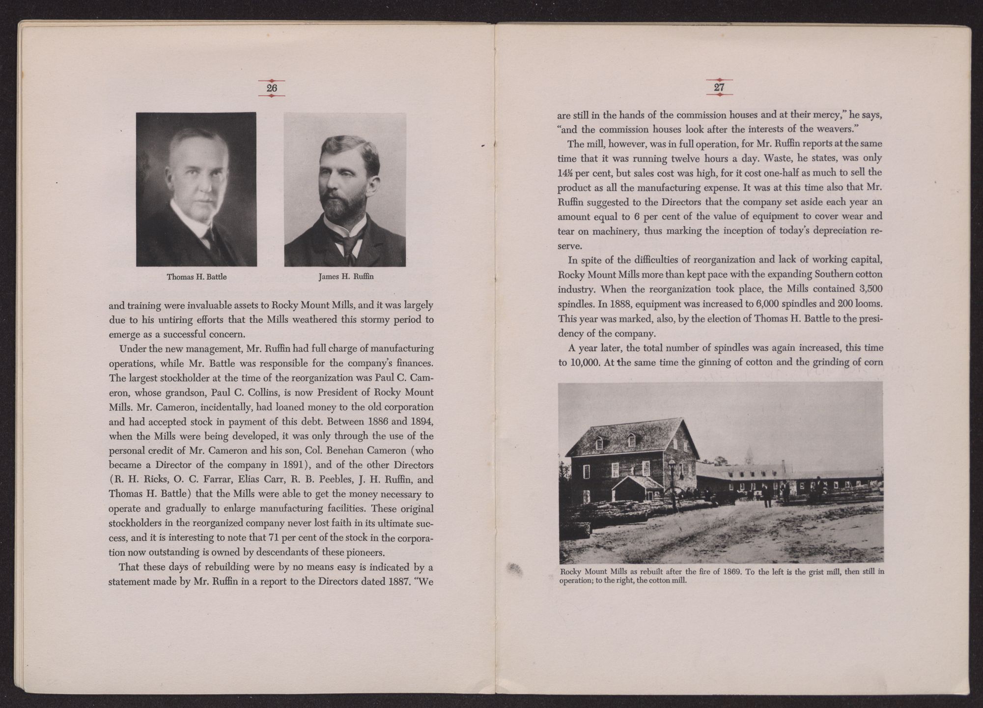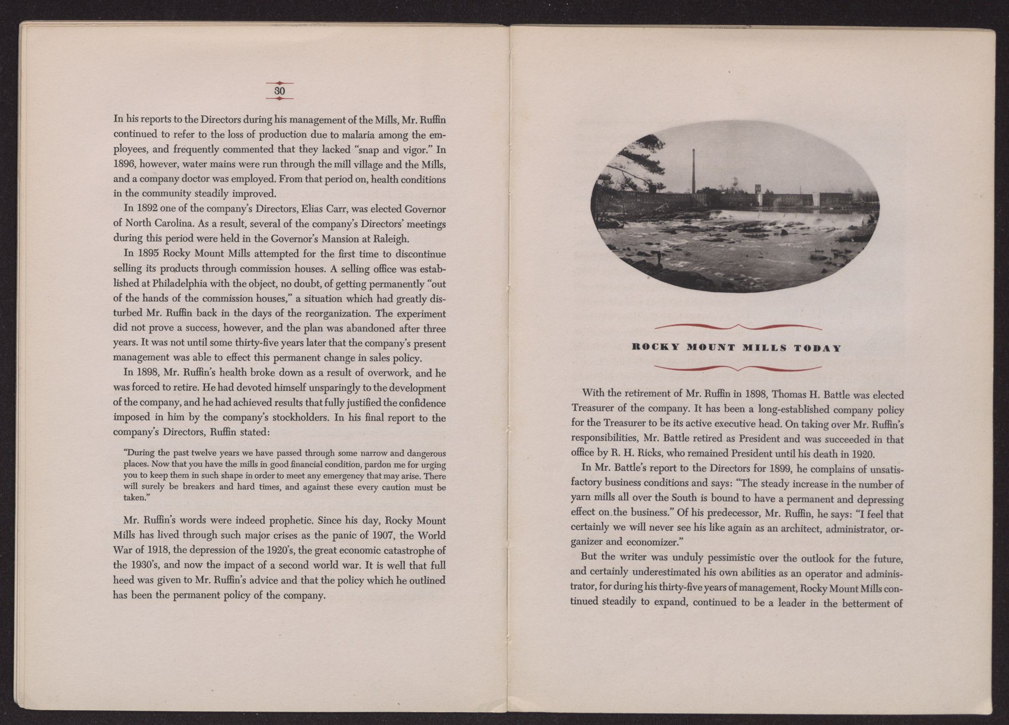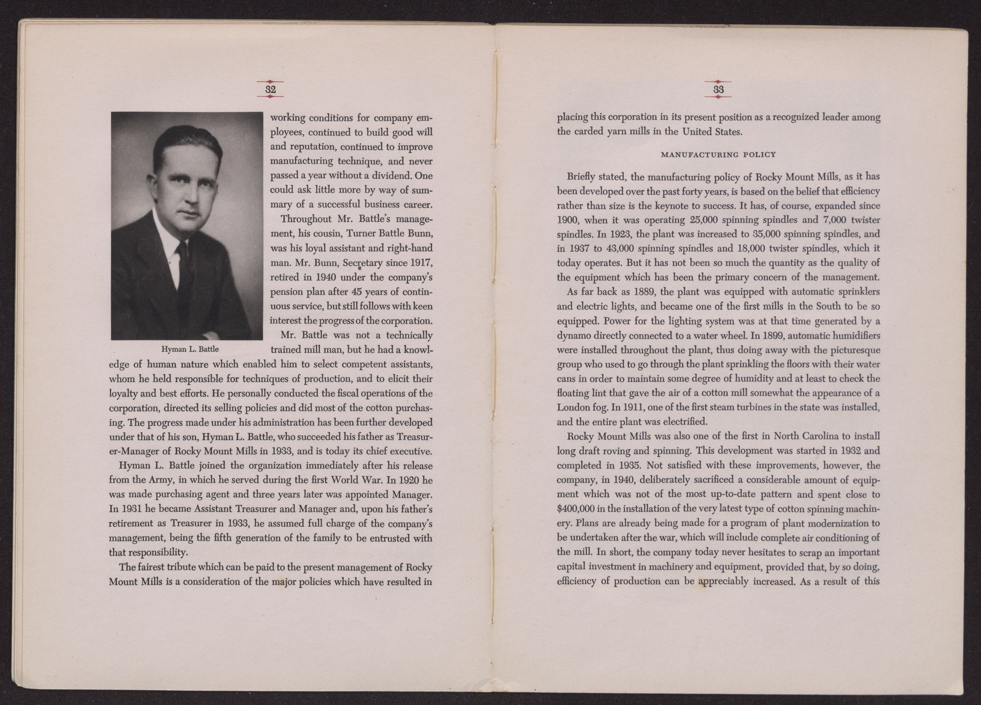 The history of Rocky Mount Mills is closely interwoven with the history of one family, the Battle family, for it is in the hands of this one family that the fortunes of the Mills have largely rested for the past one hundred and twenty-five years.