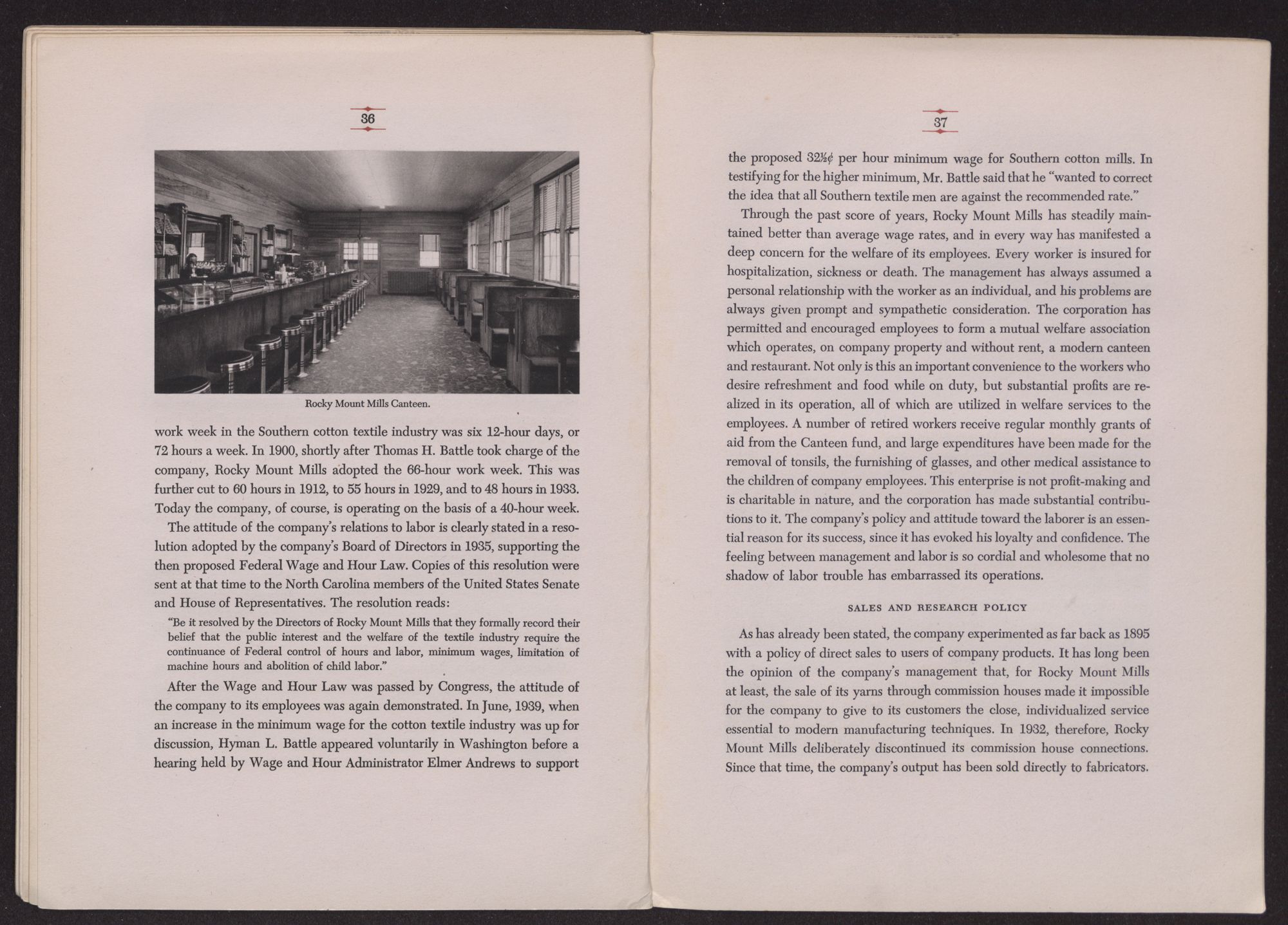 After the Wage and Hour Law was passed by Congress, the attitude of the company to its employees was again demonstrated. In June, 1939, when an increase in the minimum wage for the cotton textile industry was up for discussion, Hyman L. Battle appeared voluntarily in Washington before a hearing held by Wage and Hour Administrator Elmer Andrews to support