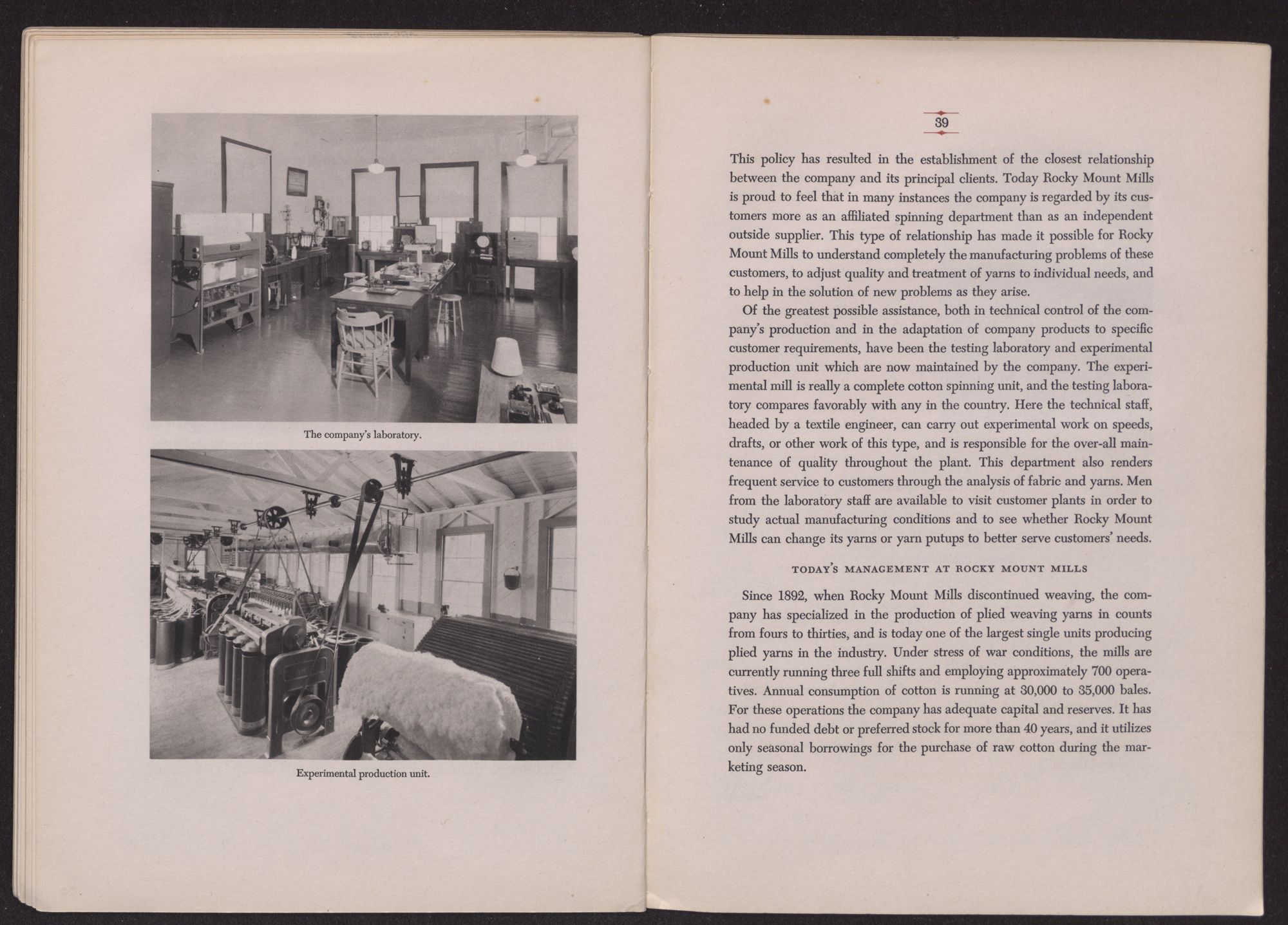 TODAY'S MANAGEMENT AT ROCKY MOUNT MILLSSince 1892, when Rocky Mount Mills discontinued weaving, the company has specialized in the production of plied weaving yarns in counts from fours to thirties, and is today one of the largest single units producing plied yarns in the industry. Under stress of war conditions, the mills are currently running three full shifts and employing approximately 700 operatives. Annual consumption of cotton is running at 30,000 to 35,000 bales. For these operations the company has adequate capital and reserves. It has had no funded debt or preferred stock for more than 40 years, and it utilizes only seasonal borrowings for the purchase of raw cotton during the marketing season.