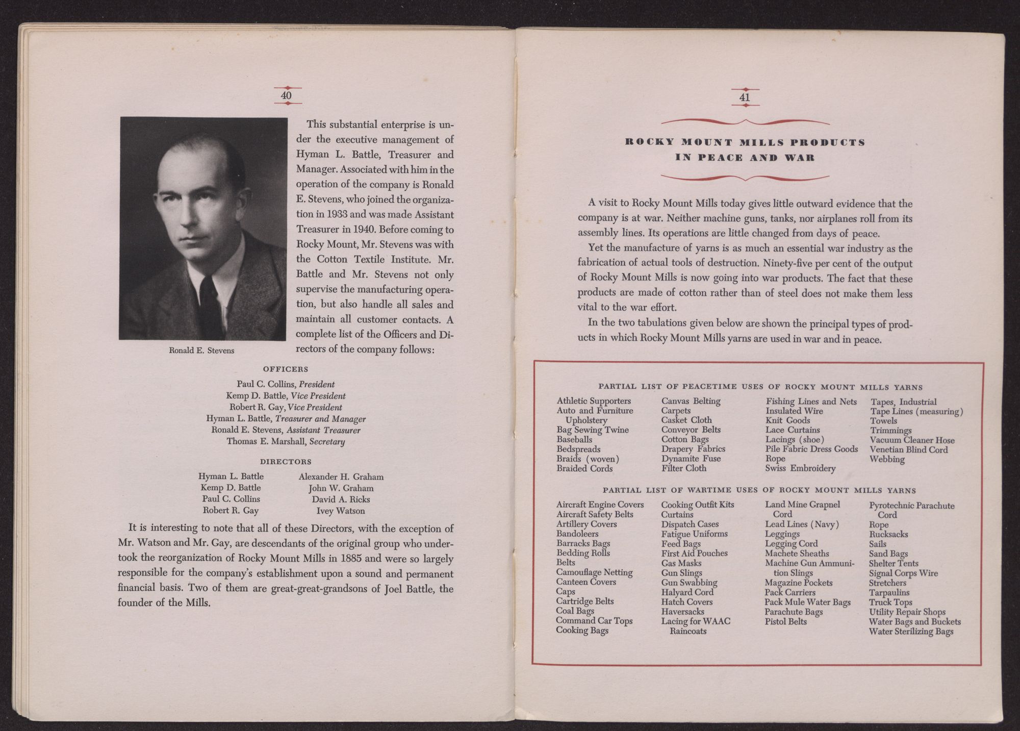 This substantial enterprise is under the executive management of Hyman L. Battle, Treasurer and Manager. Associated with him in the operation of the company is Ronald E. Stevens, who joined the organization in 1933 and was made Assistant Treasurer in 1940. Before coming to Rocky Mount, Mr. Stevens was with the Cotton Textile Institute. Mr. Battle and Mr. Stevens not only supervise the manufacturing operation, but also handle all sales and maintain all customer contacts. A complete list of the Officers and Directors of the company follows: