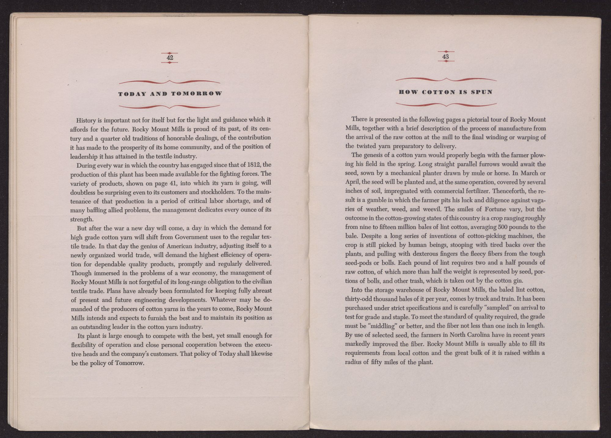 But after the war a new day will come, a day in which the demand for high grade cotton yarn will shift from Government uses to the regular textile trade. In that day the genius of American industry, adjusting itself to a newly organized world trade, will demand the highest efficiency of operation for dependable quality products, promptly and regularly delivered. Though immersed in the problems of a war economy, the management of Rocky Mount Mills is not forgetful of its long-range obligation to the civilian textile trade. Plans have already been formulated for keeping fully abreast of present and future engineering developments. Whatever may be demanded of the producers of cotton yarns in the years to come, Rocky Mount Mills intends and expects to furnish the best and to maintain its position as an outstanding leader in the cotton yarn industry.