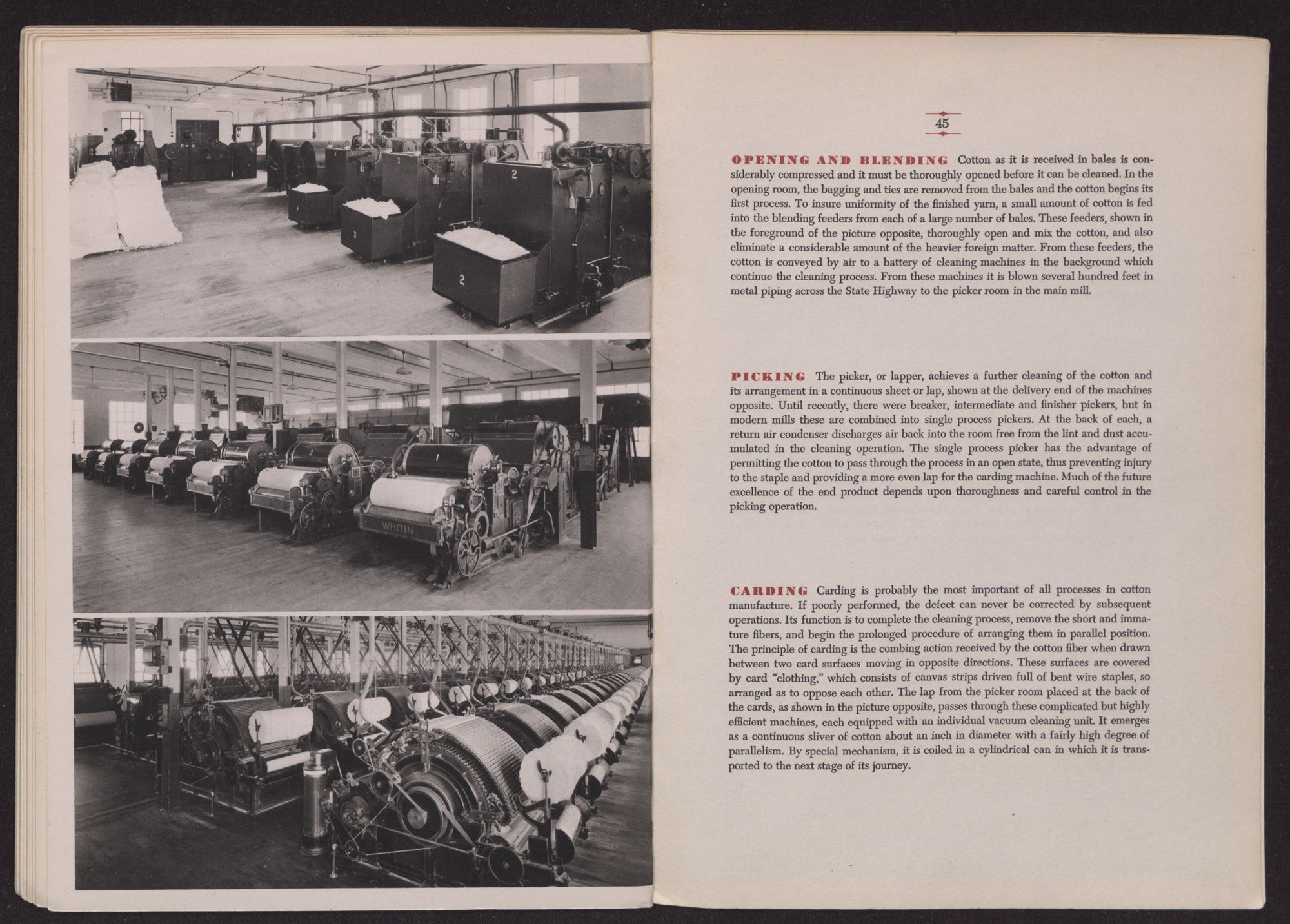 OPENING AND BLENDING Cotton as it is received in bales is considerably compressed and it must be thoroughly opened before it can be cleaned. In the opening room, the bagging and ties are removed from the bales and the cotton begins its first process. To insure uniformity of the finished yarn, a small amount of cotton is fed into the blending feeders from each of a large number of bales. These feeders, shown in the foreground of the picture opposite, thoroughly open and mix the cotton, and also eliminate a considerable amount of the heavier foreign matter. From these feeders, the cotton is conveyed by air to a battery of cleaning machines in the background which continue the cleaning process. From these machines it is blown several hundred feet in metal piping across the State Highway to the picker room in the main mill.