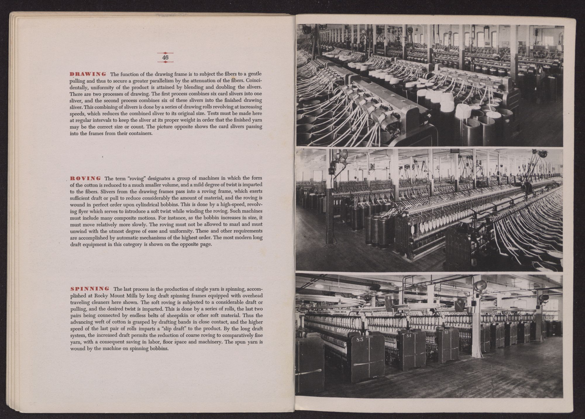 SPINNING The last process in the production of single yarn is spinning, accomplished at Rocky Mount Mills by long draft spinning frames equipped with overhead traveling cleaners here shown. The soft roving is subjected to a considerable draft or pulling, and the desired twist is imparted. This is done by a series of rolls, the last two pairs being connected by endless belts of sheepskin or other soft material. Thus the advancing weft of cotton is grasped by drafting bands in close contact, and the higher speed of the last pair of rolls imparts a “slip draft” to the product. By the long draft system, the increased draft permits the reduction of coarse roving to comparatively fine yarn, with a consequent saving in labor, floor space and machinery. The spun yarn is wound by the machine on spinning bobbins.
