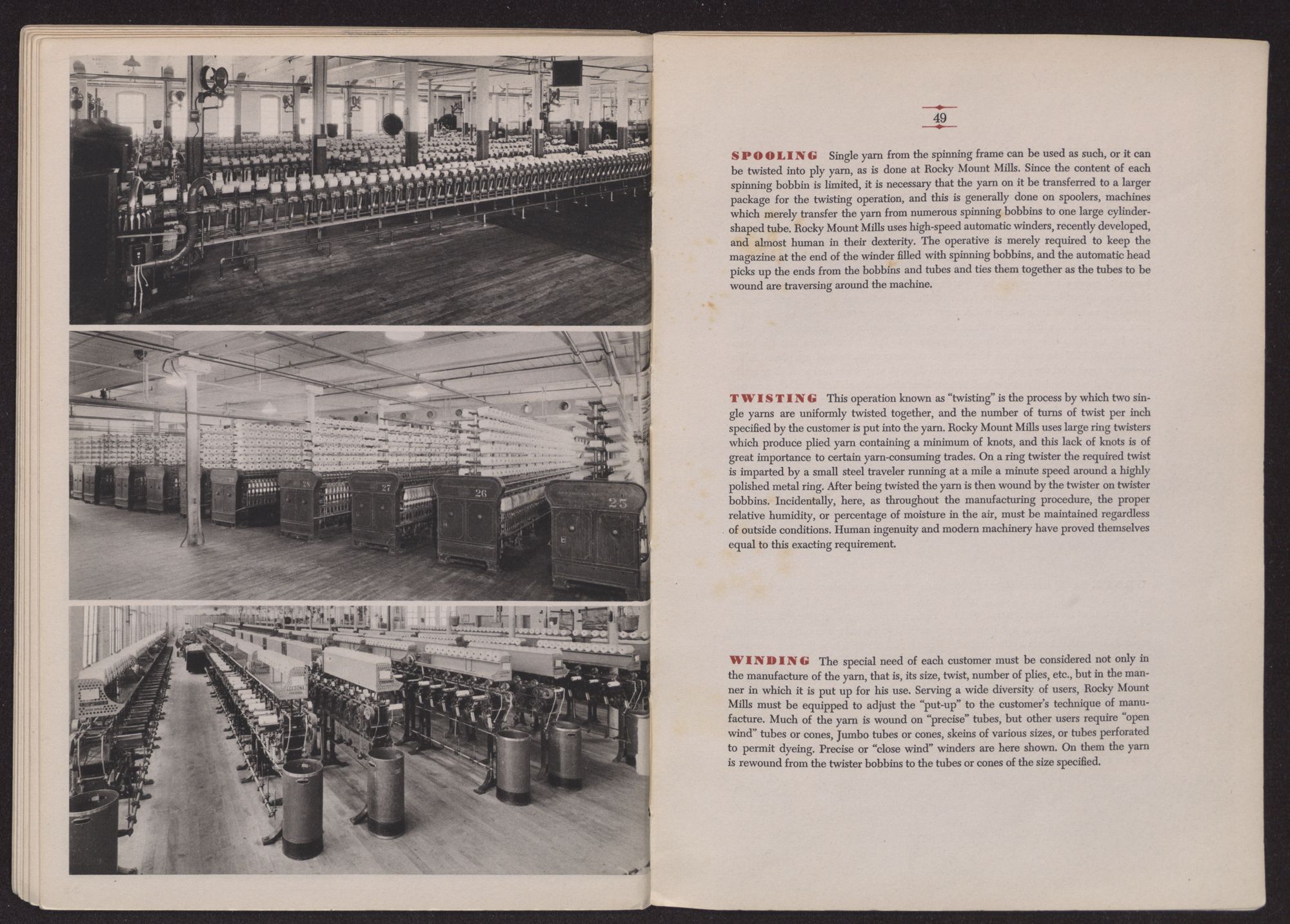 TWISTING This operation known as “twisting” is the process by which two single yarns are uniformly twisted together, and the number of turns of twist per inch specified by the customer is put into the yarn. Rocky Mount Mills uses large ring twisters which produce plied yarn containing a minimum of knots, and this lack of knots is of great importance to certain yarn-consuming trades. On a ring twister the required twist is imparted by a small steel traveler running at a mile a minute speed around a highly polished metal ring. After being twisted the yarn is then wound by the twister on twister bobbins. Incidentally, here, as throughout the manufacturing procedure, the proper relative humidity, or percentage of moisture in the air, must be maintained regardless of outside conditions. Human ingenuity and modern machinery have proved themselves equal to this exacting requirement.
