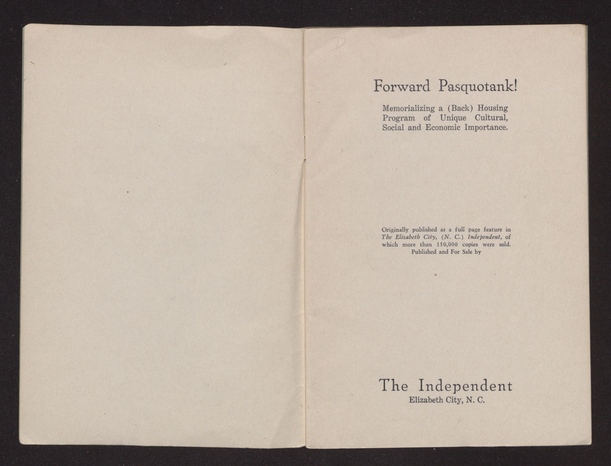 Forward Pasquotank!Memorializing a (Back) Housing Program of Unique Cultural, Social and Economic Importance. Originally published as a full page feature in The Elizabeth City, (N. C.) Independent, of which more than 150,000 copies were sold. Published and For Sale by The IndependentElizabeth City, N. C.
