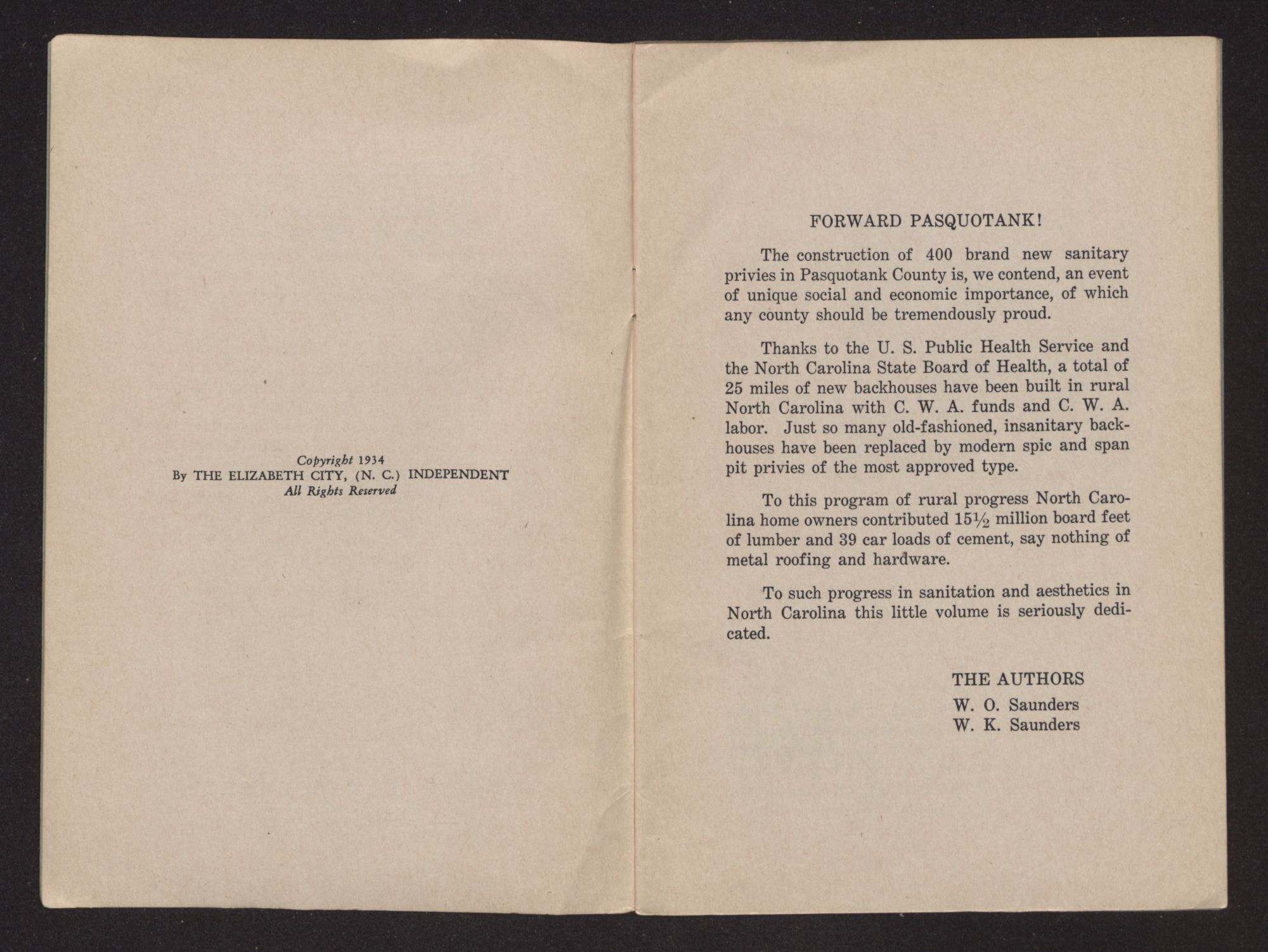 Forward Pasquotank! : memorializing a (back) housing program of unique cultural, social and economic importance / by W.O. Saunders and W.K. Saunders. Elizabeth City, N.C. : The Independent, c1934. [30] p. : ill. ; 23 cm. Contains poetry: The back house to the front. Originally published as a full page feature in The Elizabeth City, (N. C.) Independent.