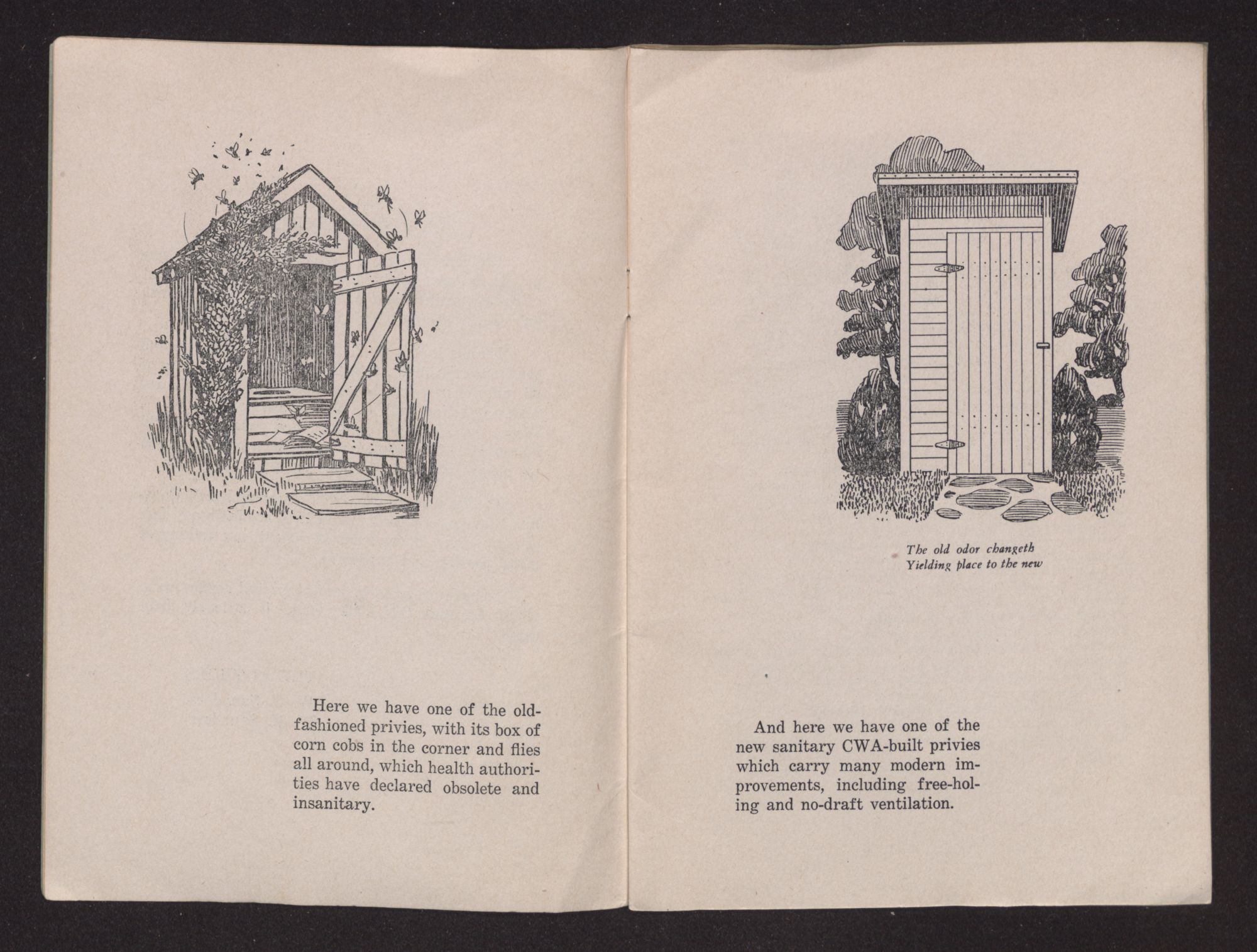 To all you carping critics who have Roosevelt on the pan,I want to call attention to his latest Privy Plan.If he never did another thing but form C. W. A.His name should live in history as the greatest of his day,For down in North Carolina he has pulled a wondrous stuntThat is bound to bring that sacred shrine,THE BACK HOUSE TO THE FRONTAnd all who cherish memories of happy childhood daysWill cheer our blessed President for preserving bygone playsAnd for benefit of all our youth who do not understandI'll explain the part the Back House played to the lowly and the grand.Long years ago ere sanitation came to be a stunt;Before the chiseling plumber charged a dollar for each grunt;Before the “prevention of cruelty bunch” proved that it was unkindTo do the things folks long had done unto their own behinds;Before they baptised nature's call by pulling on a chain,We had a good old system that in memory shall remain.’Twas just a simple little throne as plain as plain could be,But, my, what recollections it recalls to you and me.It graced the back end of the yard half camouflaged with vinesAnd built of boards and poles and tin of many different kinds.Sometimes the leaves of almanacs or books or magazinesWould decorate the little walls with interesting scenes.The throne seat built for comfort, just two feet high or more,So when you sat up on the hole your two feet touched the floor;The knotholes in the walls and door, were lookouts where you viewedThe horizon for trespassers who disturbed your solitude.And embryonic poets found real inspiring useFor every board within that shrine to register their muse,And the laughter of the children will re-echo evermoreFrom those games they played of hide and seek behind the back house door.A leveler of conventions, Ah! How well it served them all,The rich, the poor, the sinner, saint, the big ones and the small:They might desert their churches, clubs or palaces divineBut each paid daily pilgrimage unto that humble shrine.But as those golden years slid by and snobs began to rule,They brought false standards in our life, our church, our home and school;And orators with silver tongues were paid by men of wealthTo crucify the old back house as a menace to our health.They formed a “Privy Council” and had each state decreeIt was against the law to use that shrine of memory.They built new closets in the house upon real swanky plansAnd called them highfalutin names like “toilets,” “rests” and “cans”With chains that flushed the water through and tissue by the rollTo take the place of corncobs that we just threw down the hole.But we who live back in the past, who long for yesterday,Can now perk up with dignity and bless “C. W. A.”For down in North Carolina where nature reigns supremeThey're licking this depression with a “Back to Nature” scheme;They're building miles of privies on the good old squatter's planWith good old fashioned holes and things meant for the real HE man;And North Carolina's bound to be the nation's paradise,For folks who want real comfort will flock there just like flies.And as they sit and meditate, between each groan and grunt,They'll thank Roosevelt for bringingTHE OLD BACK HOUSE TO THE FRONT.CWA Builds Twenty-Five Miles