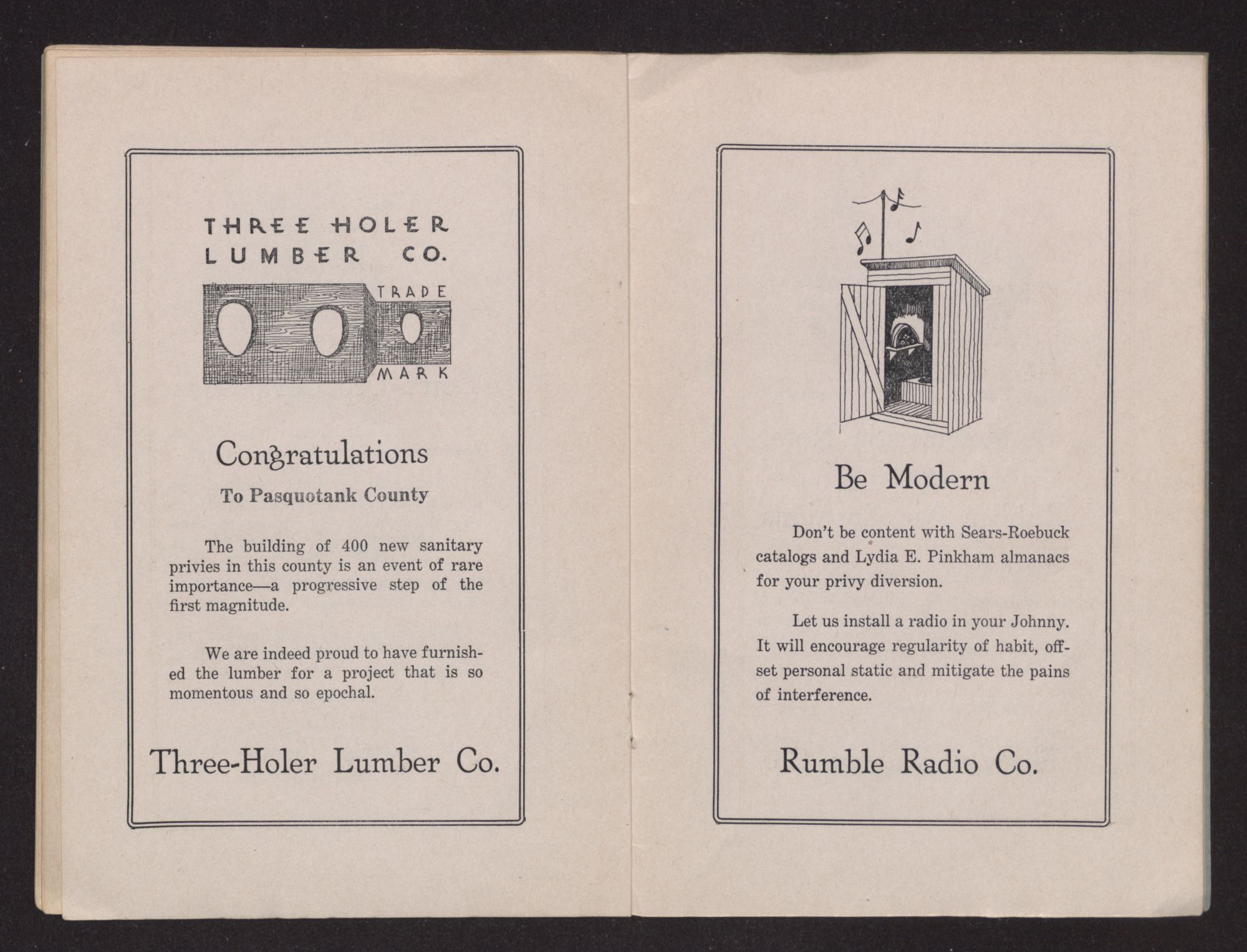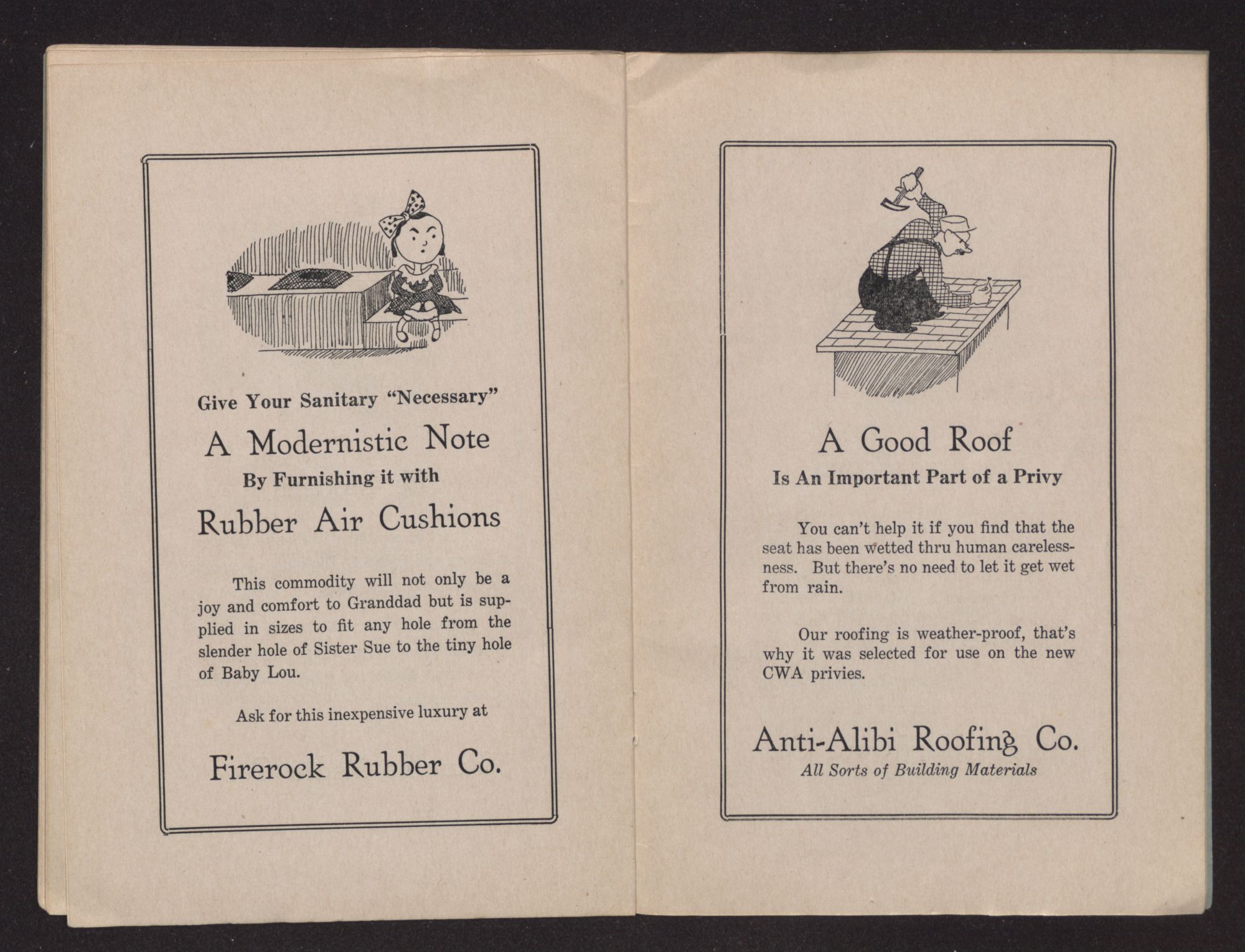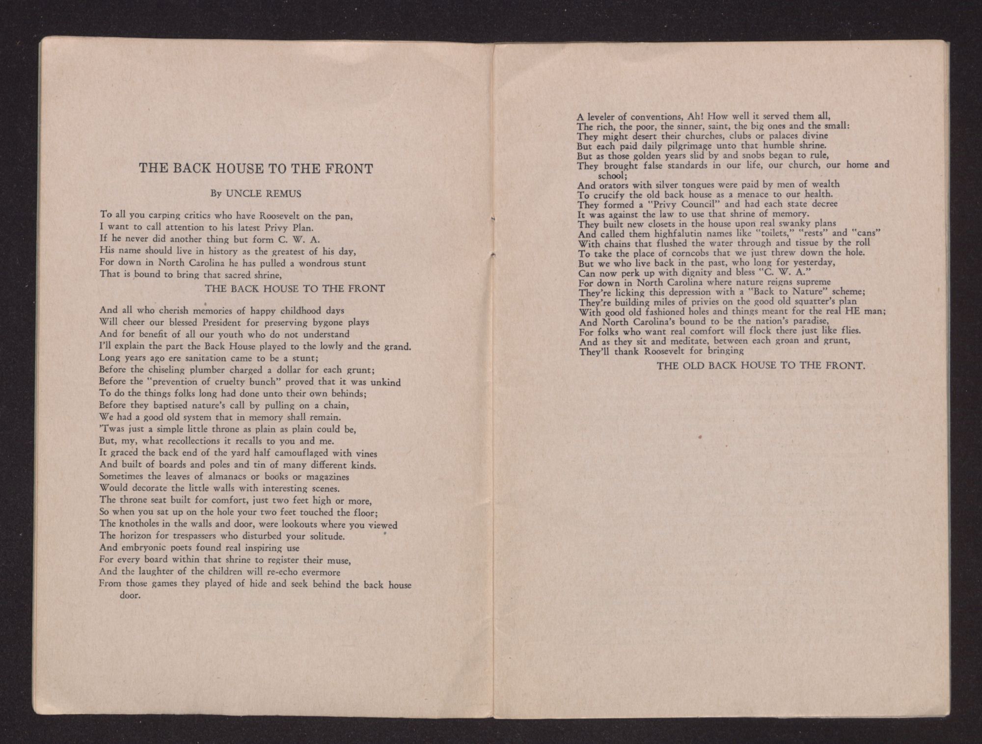 To all you carping critics who have Roosevelt on the pan,I want to call attention to his latest Privy Plan.If he never did another thing but form C. W. A.His name should live in history as the greatest of his day,For down in North Carolina he has pulled a wondrous stuntThat is bound to bring that sacred shrine,THE BACK HOUSE TO THE FRONTAnd all who cherish memories of happy childhood daysWill cheer our blessed President for preserving bygone playsAnd for benefit of all our youth who do not understandI'll explain the part the Back House played to the lowly and the grand.Long years ago ere sanitation came to be a stunt;Before the chiseling plumber charged a dollar for each grunt;Before the “prevention of cruelty bunch” proved that it was unkindTo do the things folks long had done unto their own behinds;Before they baptised nature's call by pulling on a chain,We had a good old system that in memory shall remain.’Twas just a simple little throne as plain as plain could be,But, my, what recollections it recalls to you and me.It graced the back end of the yard half camouflaged with vinesAnd built of boards and poles and tin of many different kinds.Sometimes the leaves of almanacs or books or magazinesWould decorate the little walls with interesting scenes.The throne seat built for comfort, just two feet high or more,So when you sat up on the hole your two feet touched the floor;The knotholes in the walls and door, were lookouts where you viewedThe horizon for trespassers who disturbed your solitude.And embryonic poets found real inspiring useFor every board within that shrine to register their muse,And the laughter of the children will re-echo evermoreFrom those games they played of hide and seek behind the back house door.A leveler of conventions, Ah! How well it served them all,The rich, the poor, the sinner, saint, the big ones and the small:They might desert their churches, clubs or palaces divineBut each paid daily pilgrimage unto that humble shrine.But as those golden years slid by and snobs began to rule,They brought false standards in our life, our church, our home and school;And orators with silver tongues were paid by men of wealthTo crucify the old back house as a menace to our health.They formed a “Privy Council” and had each state decreeIt was against the law to use that shrine of memory.They built new closets in the house upon real swanky plansAnd called them highfalutin names like “toilets,” “rests” and “cans”With chains that flushed the water through and tissue by the rollTo take the place of corncobs that we just threw down the hole.But we who live back in the past, who long for yesterday,Can now perk up with dignity and bless “C. W. A.”For down in North Carolina where nature reigns supremeThey're licking this depression with a “Back to Nature” scheme;They're building miles of privies on the good old squatter's planWith good old fashioned holes and things meant for the real HE man;And North Carolina's bound to be the nation's paradise,For folks who want real comfort will flock there just like flies.And as they sit and meditate, between each groan and grunt,They'll thank Roosevelt for bringingTHE OLD BACK HOUSE TO THE FRONT.