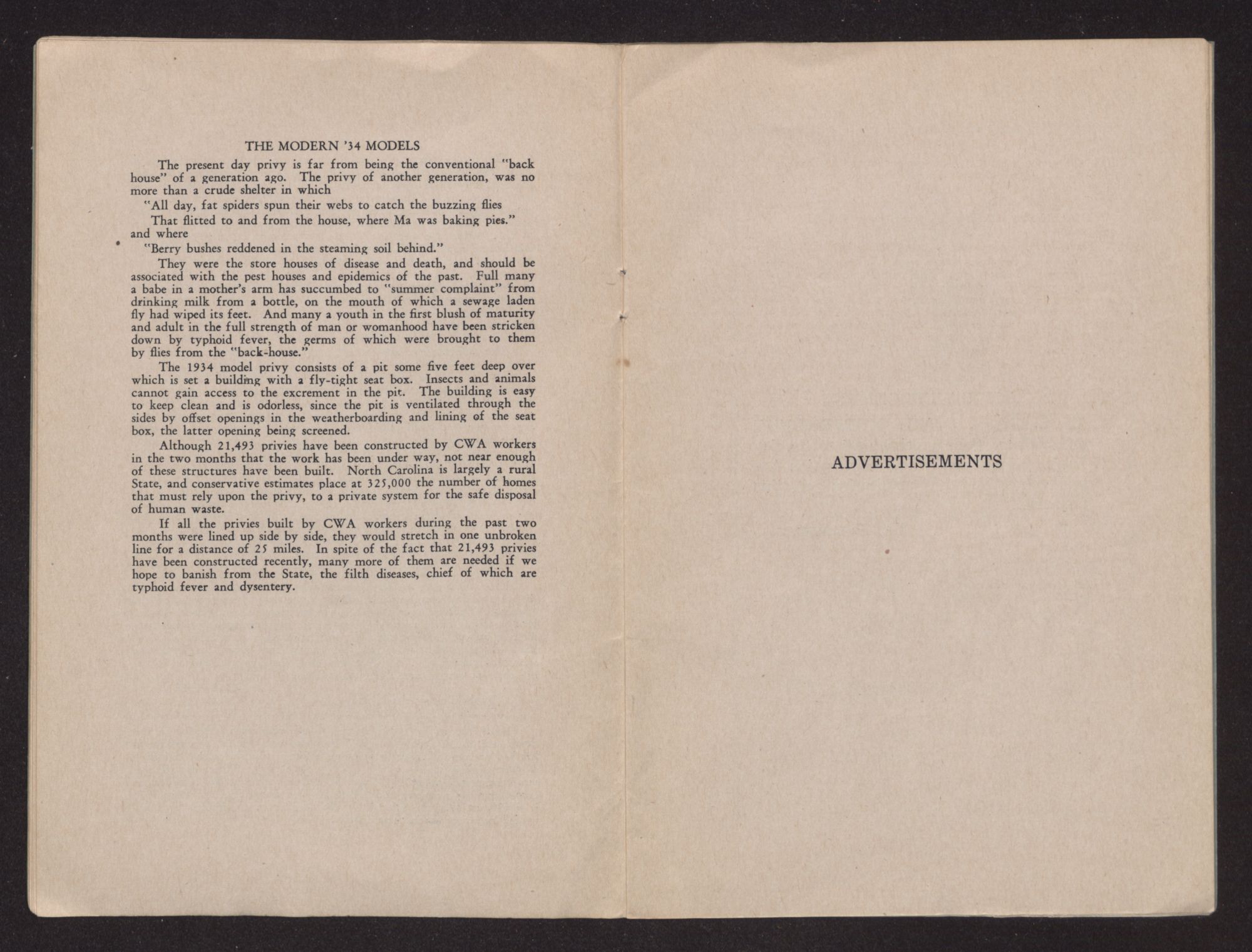 Thanks to the U. S. Public Health Service and the North Carolina State Board of Health, a total of 25 miles of new backhouses have been built in rural North Carolina with C. W. A. funds and C. W. A. labor. Just so many old-fashioned, insanitary back-houses have been replaced by modern spic and span pit privies of the most approved type.