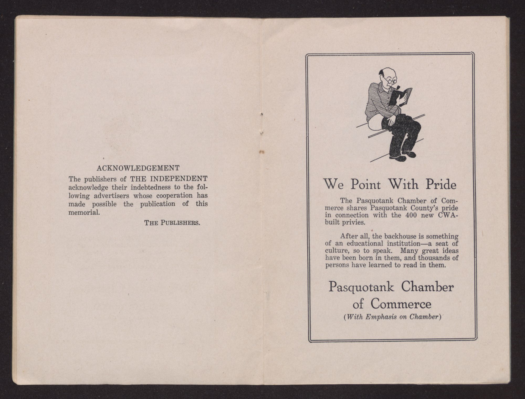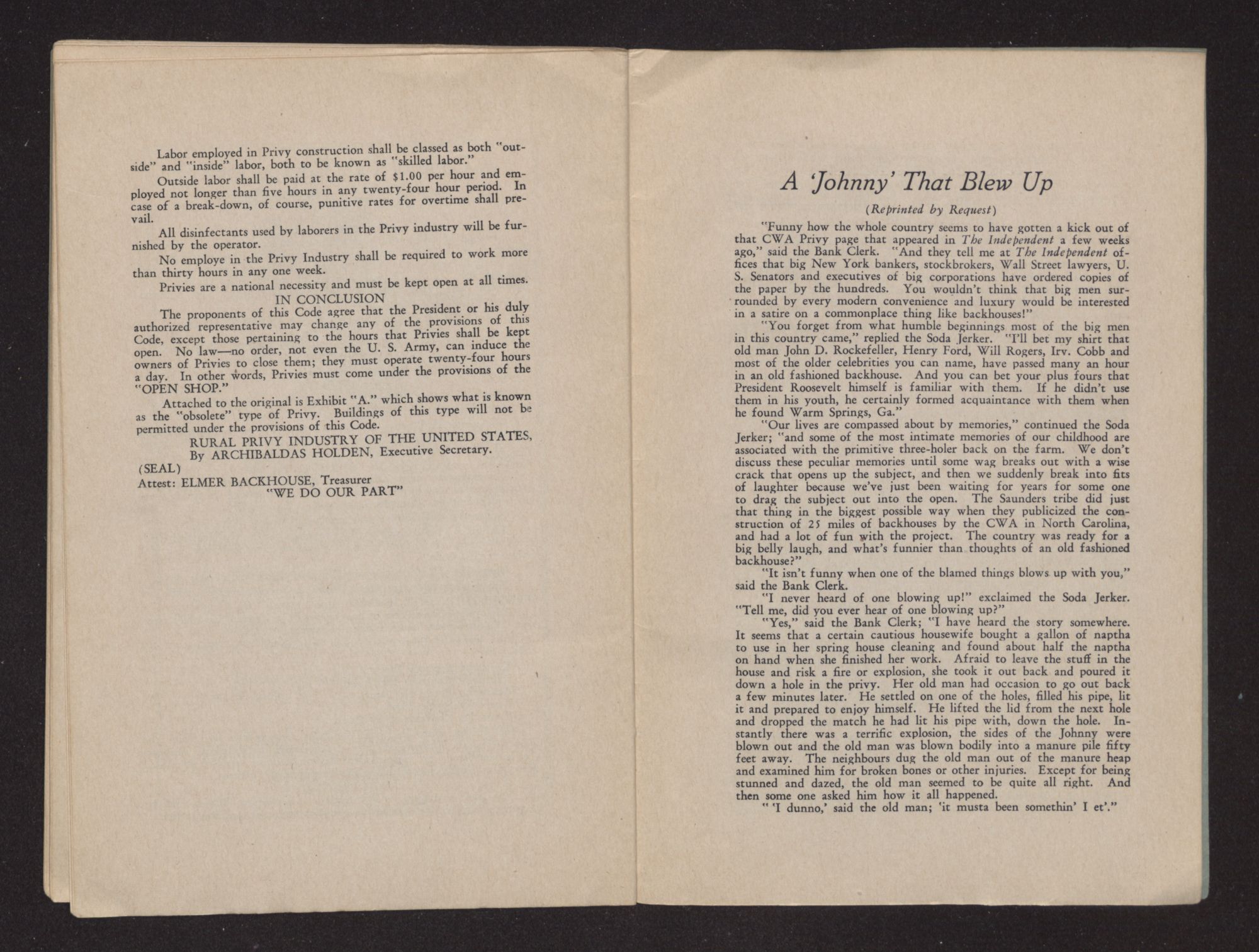 “Funny how the whole country seems to have gotten a kick out of that CWA Privy page that appeared in The Independent a few weeks ago,” said the Bank Clerk. “And they tell me at The Independent offices that big New York bankers, stockbrokers, Wall Street lawyers, U. S. Senators and executives of big corporations have ordered copies of the paper by the hundreds. You wouldn't think that big men surrounded by every modern convenience and luxury would be interested in a satire on a commonplace thing like backhouses!”