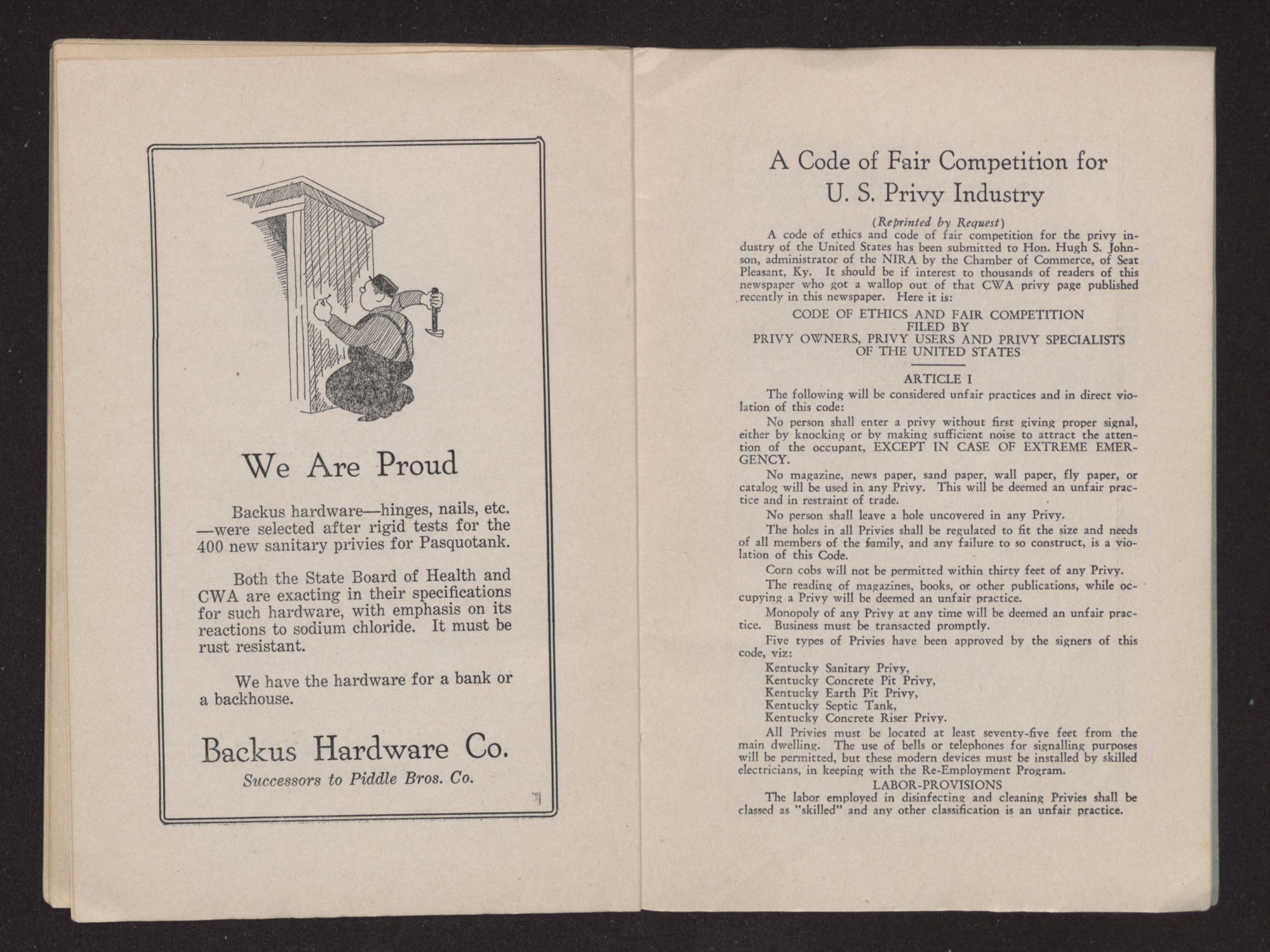 A code of ethics and code of fair competition for the privy industry of the United States has been submitted to Hon. Hugh S. Johnson, administrator of the NIRA by the Chamber of Commerce, of Seat Pleasant, Ky. It should be if interest to thousands of readers of this newspaper who got a wallop out of that CWA privy page published recently in this newspaper. Here it is: