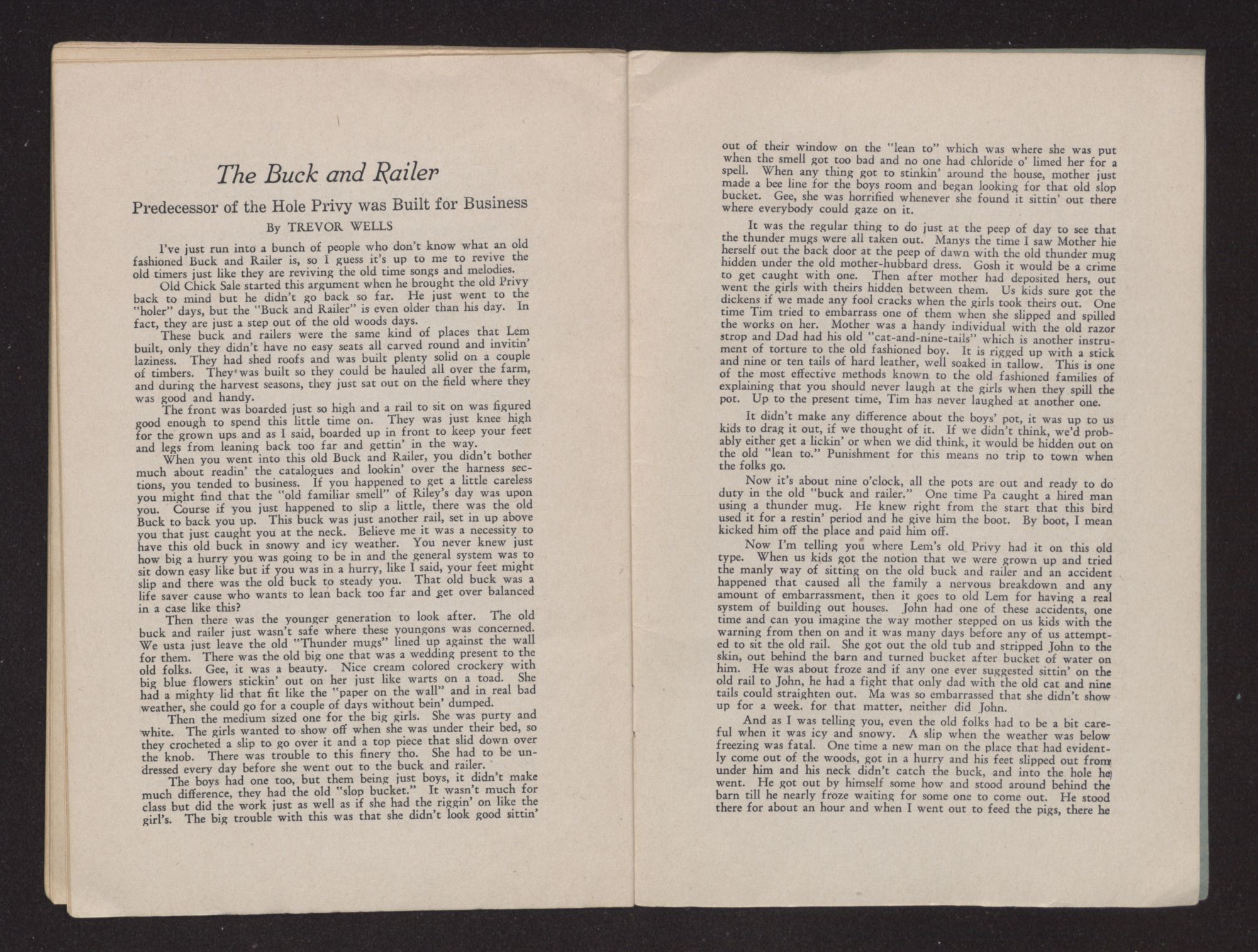 Then there was the younger generation to look after. The old buck and railer just wasn't safe where these youngons was concerned. We usta just leave the old “Thunder mugs” lined up against the wall for them. There was the old big one that was a wedding present to the old folks. Gee, it was a beauty. Nice cream colored crockery with big blue flowers stickin’ out on her just like warts on a toad. She had a mighty lid that fit like the “paper on the wall” and in real bad weather, she could go for a couple of days without bein’ dumped.