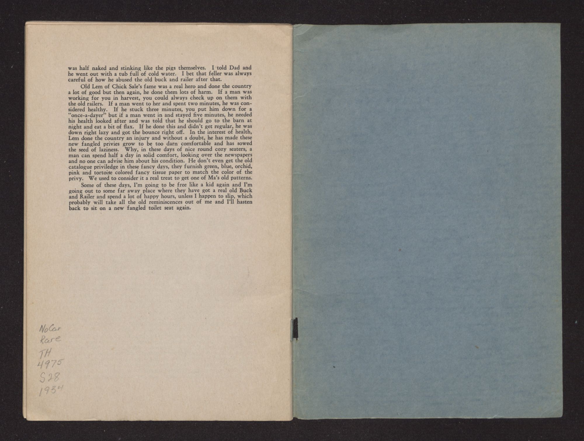 Old Lem of Chick Sale's fame was a real hero and done the country a lot of good but then again, he done them lots of harm. If a man was working for you in harvest, you could always check up on them with the old railers. If a man went to her and spent two minutes, he was considered healthy. If he stuck three minutes, you put him down for a “once-a-dayer” but if a man went in and stayed five minutes, he needed his health looked after and was told that he should go to the barn at night and eat a bit of flax. If he done this and didn't get regular, he was down right lazy and got the bounce right off. In the interest of health, Lem done the country an injury and without a doubt, he has made these new fangled privies grow to be too darn comfortable and has sowed the seed of laziness. Why, in these days of nice round cozy seaters, a man can spend half a day in solid comfort, looking over the newspapers and no one can advise him about his condition. He don't even get the old catalogue priviledge in these fancy days, they furnish green, blue, orchid, pink and tortoise colored fancy tissue paper to match the color of the privy. We used to consider it a real treat to get one of Ma's old patterns.