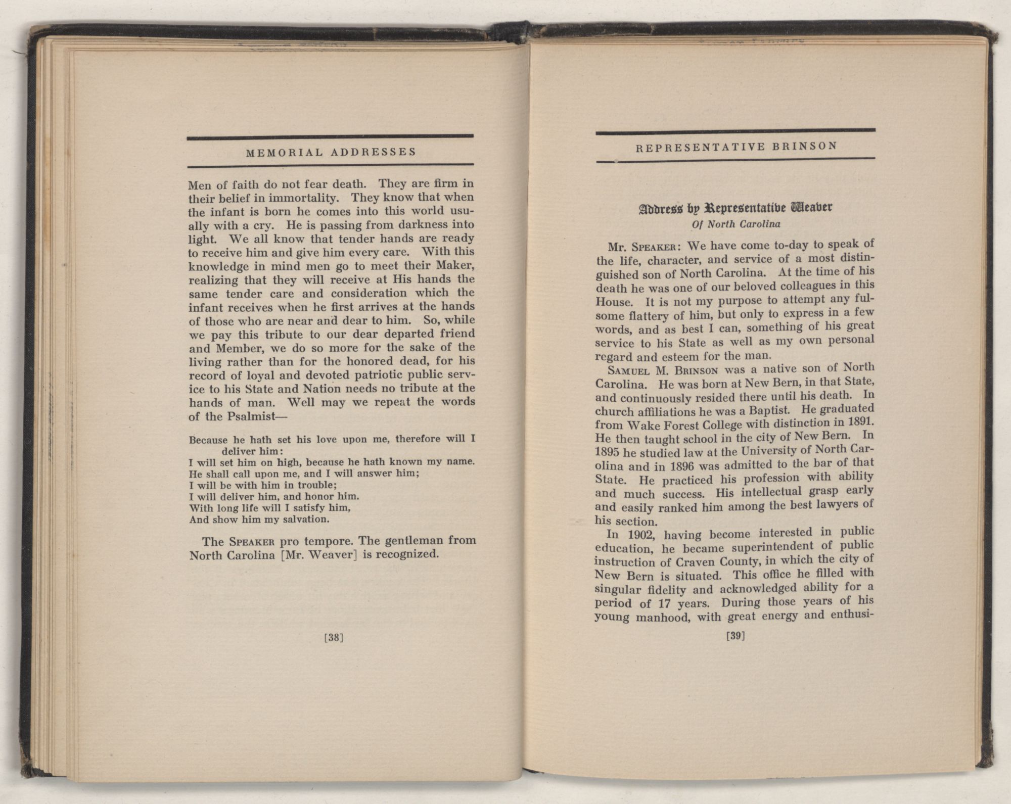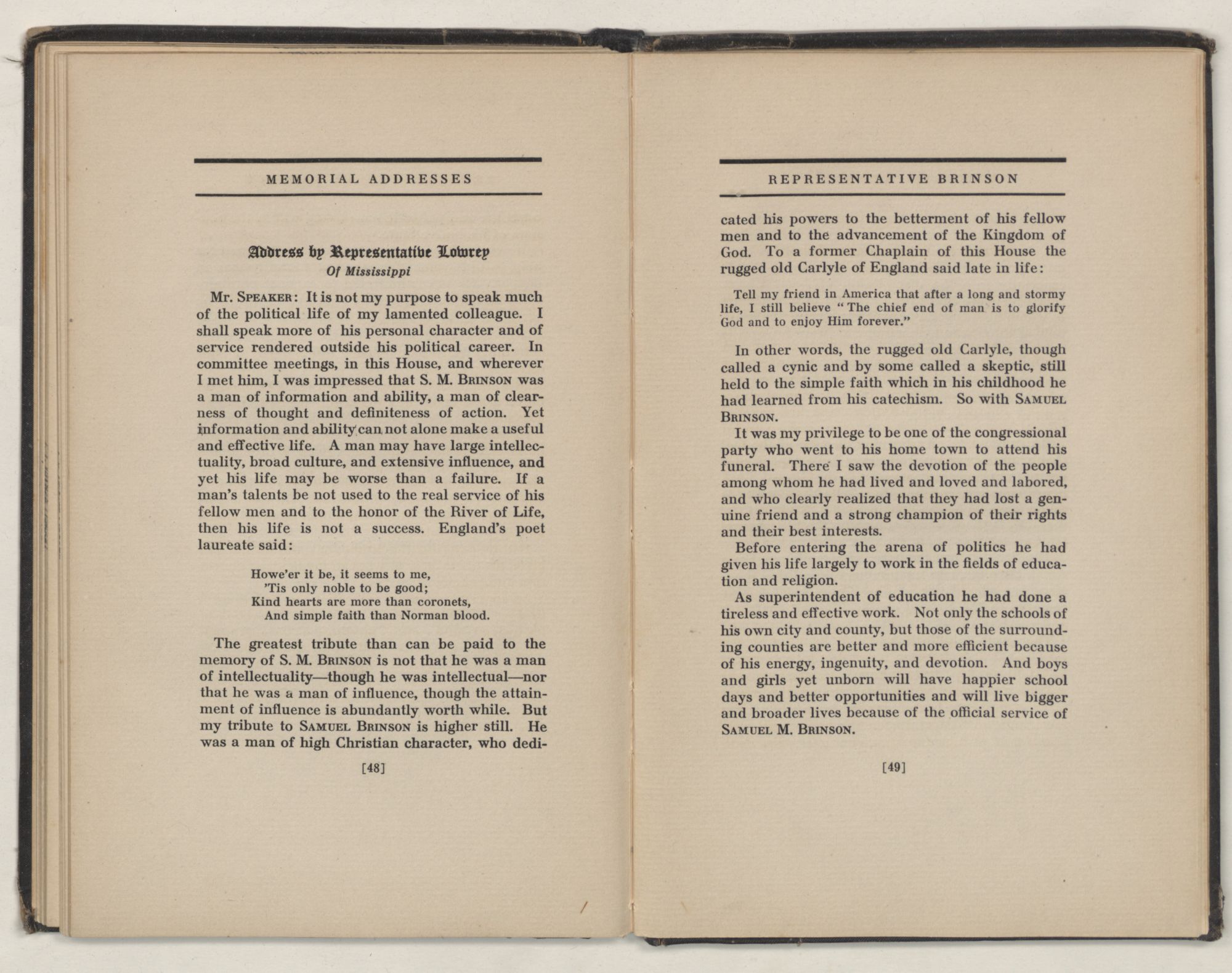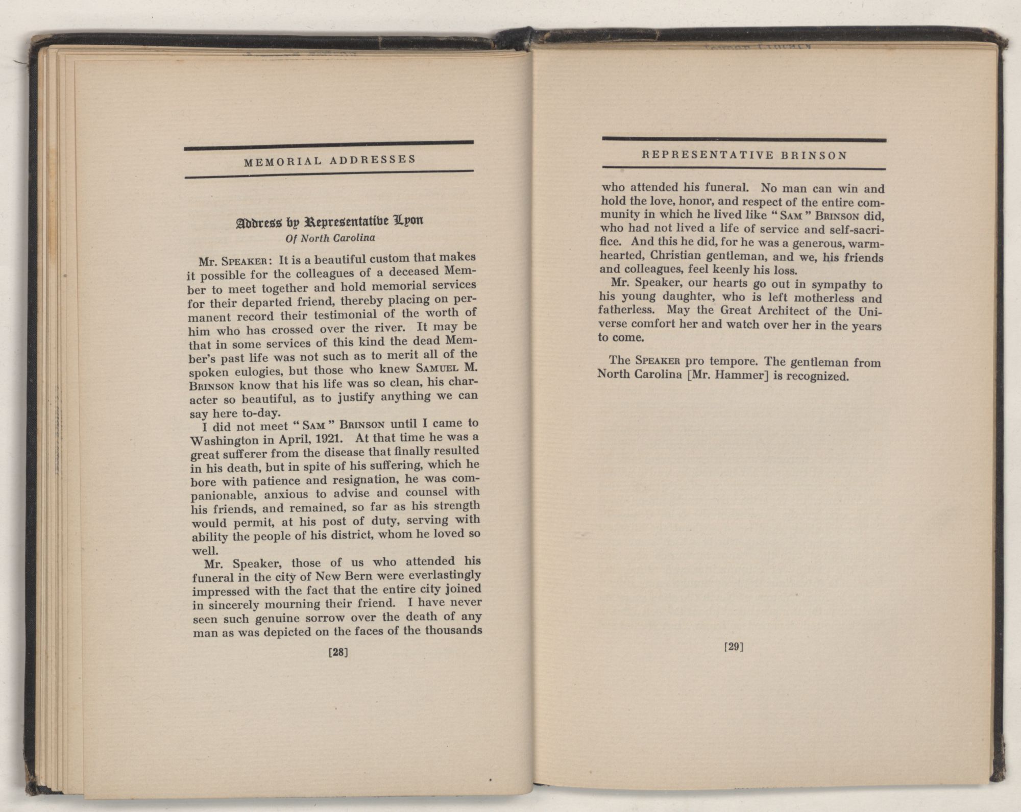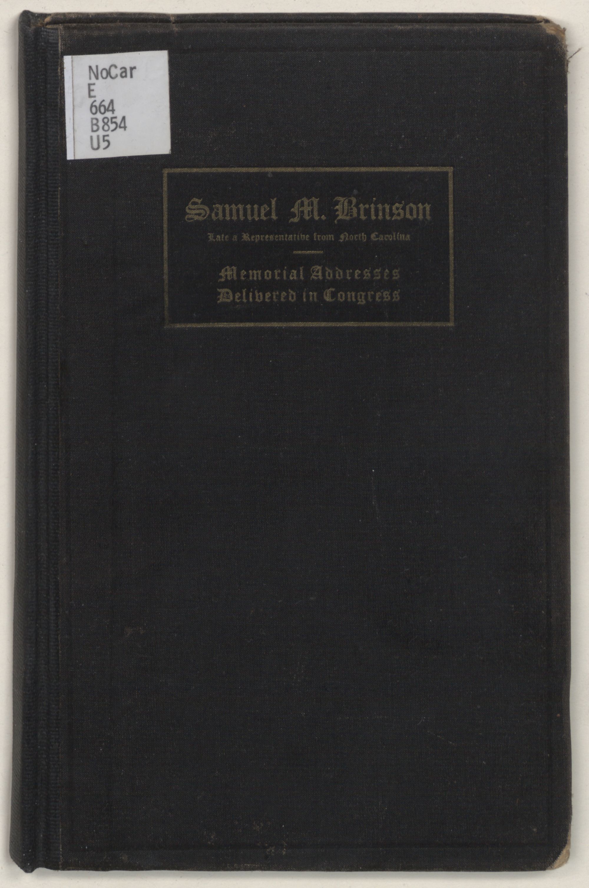 Samuel M. Brinson. Memorial addresses delivered in the House of representatives of the United States in memory of Samuel M. Brinson, late a representative from North Carolina. Sixty-seventh Congress. February 11, 1923. Washington : Govt. print. off., 1924. iii p., 1 leaf, 61, [1] p. front. (port.) 24 cm. Prepared under the direction of the Joint committee on printing. Running title: Memorial addresses: Representative Brinson.