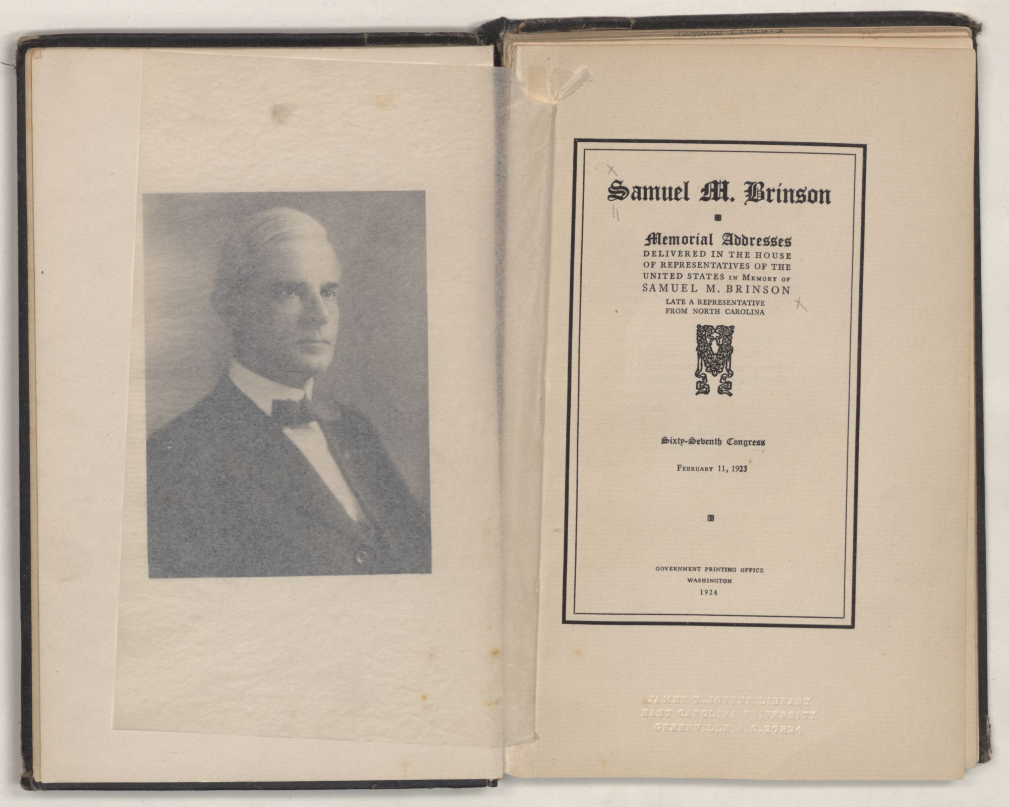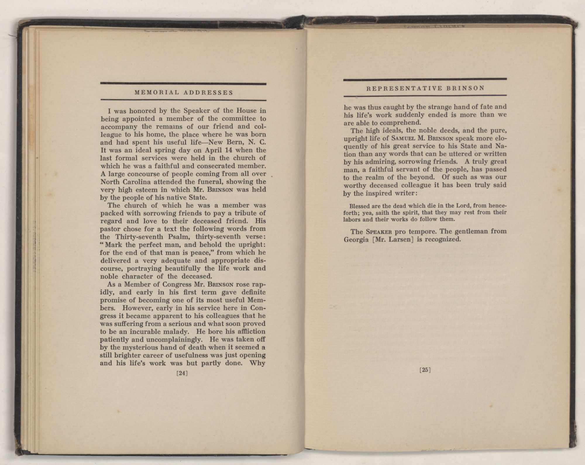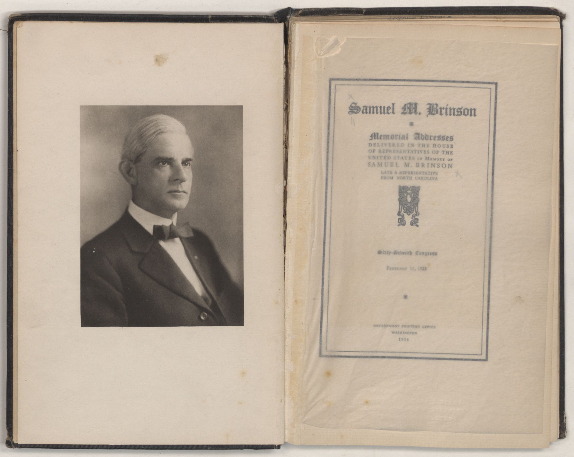 My distinguished predecessor, SAMUEL MITCHELL BRINSON, was born at New Bern, N. C., on March 20, 1870. He was the son of William George and Kittie (Chestnut) Brinson. His father was an honored citizen of Craven County and held positions of high trust in the county.