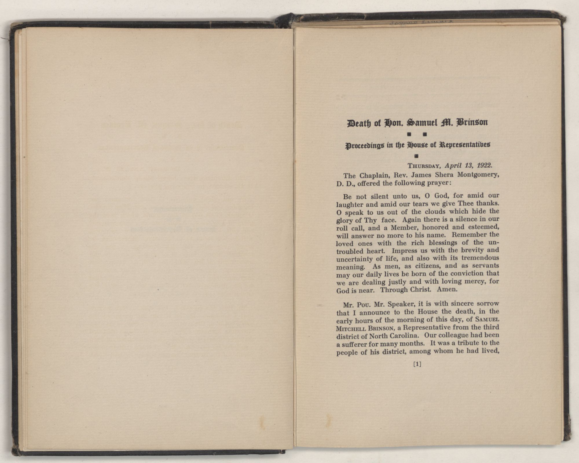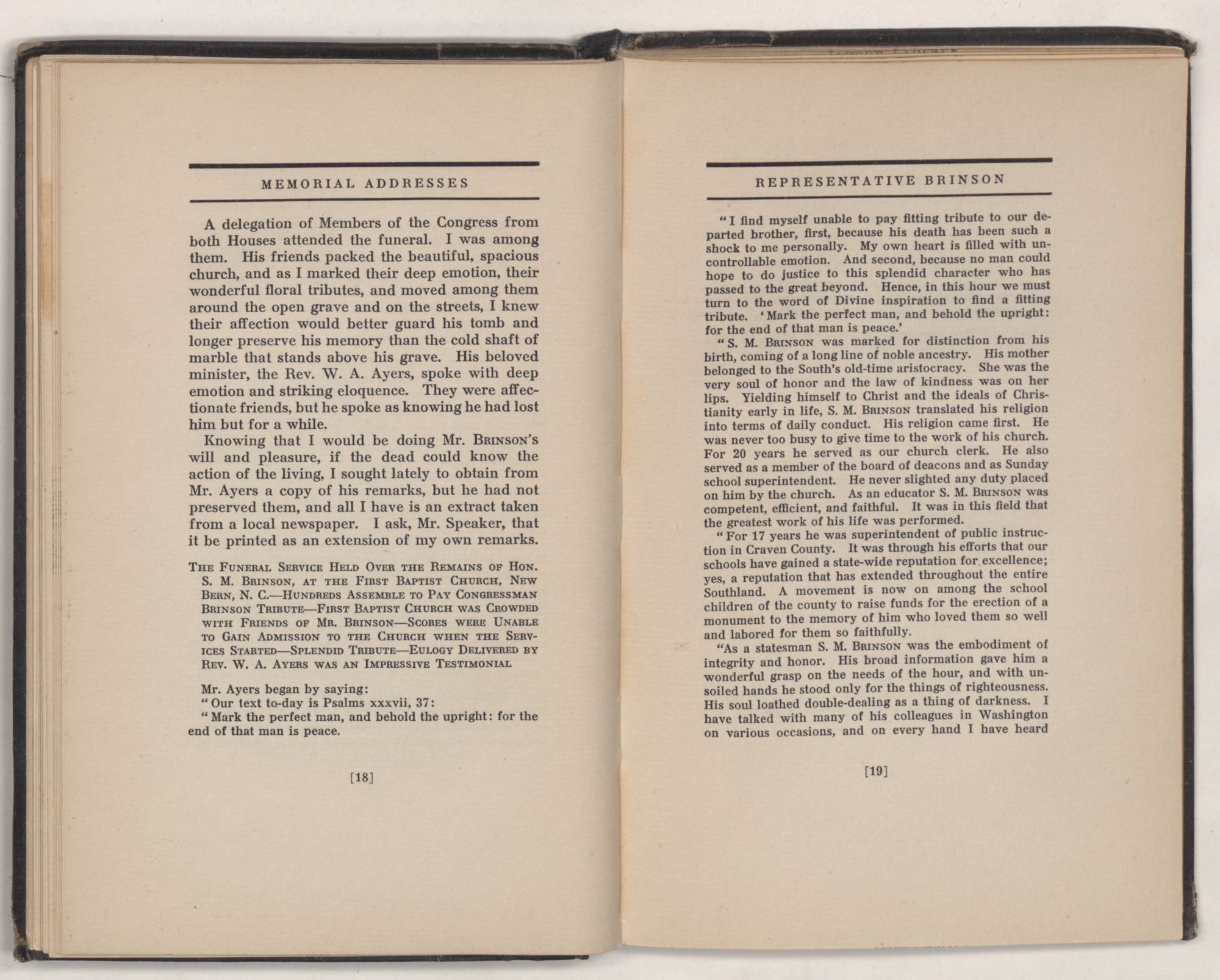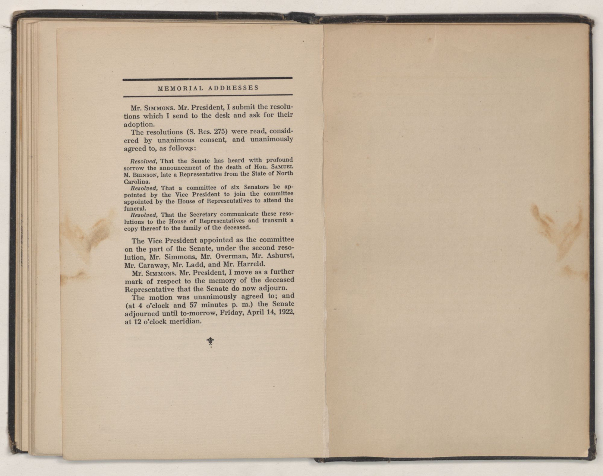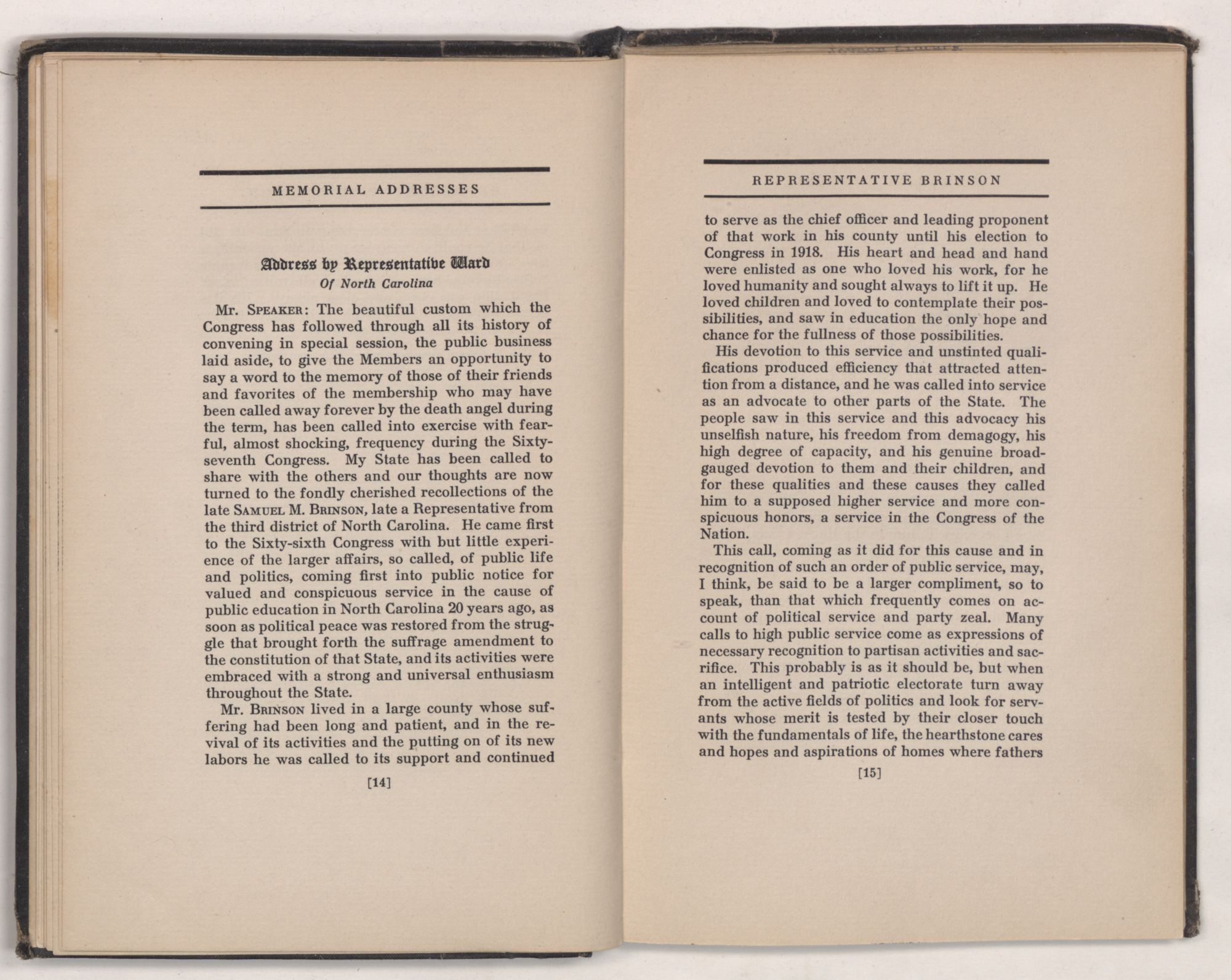 My distinguished predecessor, SAMUEL MITCHELL BRINSON, was born at New Bern, N. C., on March 20, 1870. He was the son of William George and Kittie (Chestnut) Brinson. His father was an honored citizen of Craven County and held positions of high trust in the county.