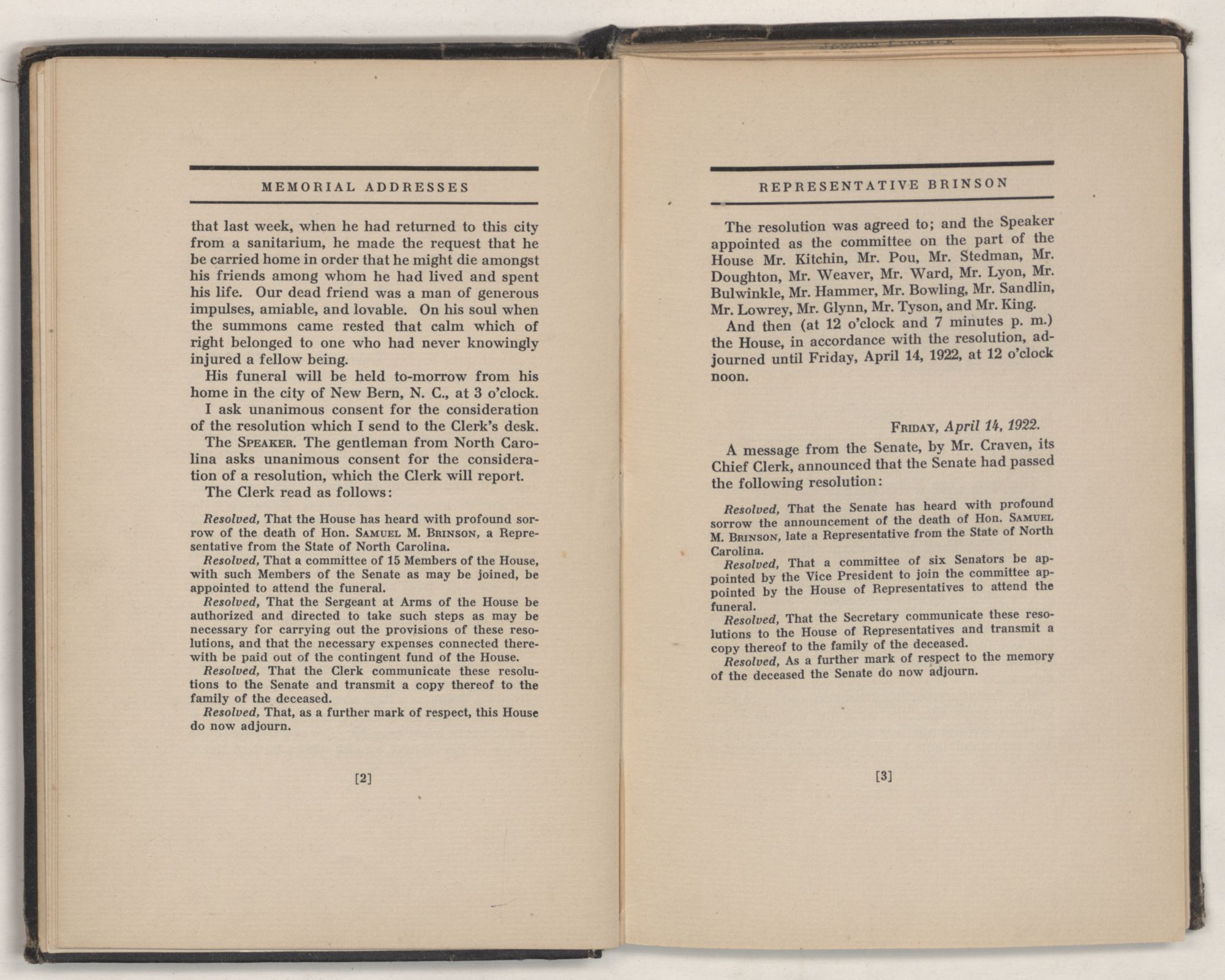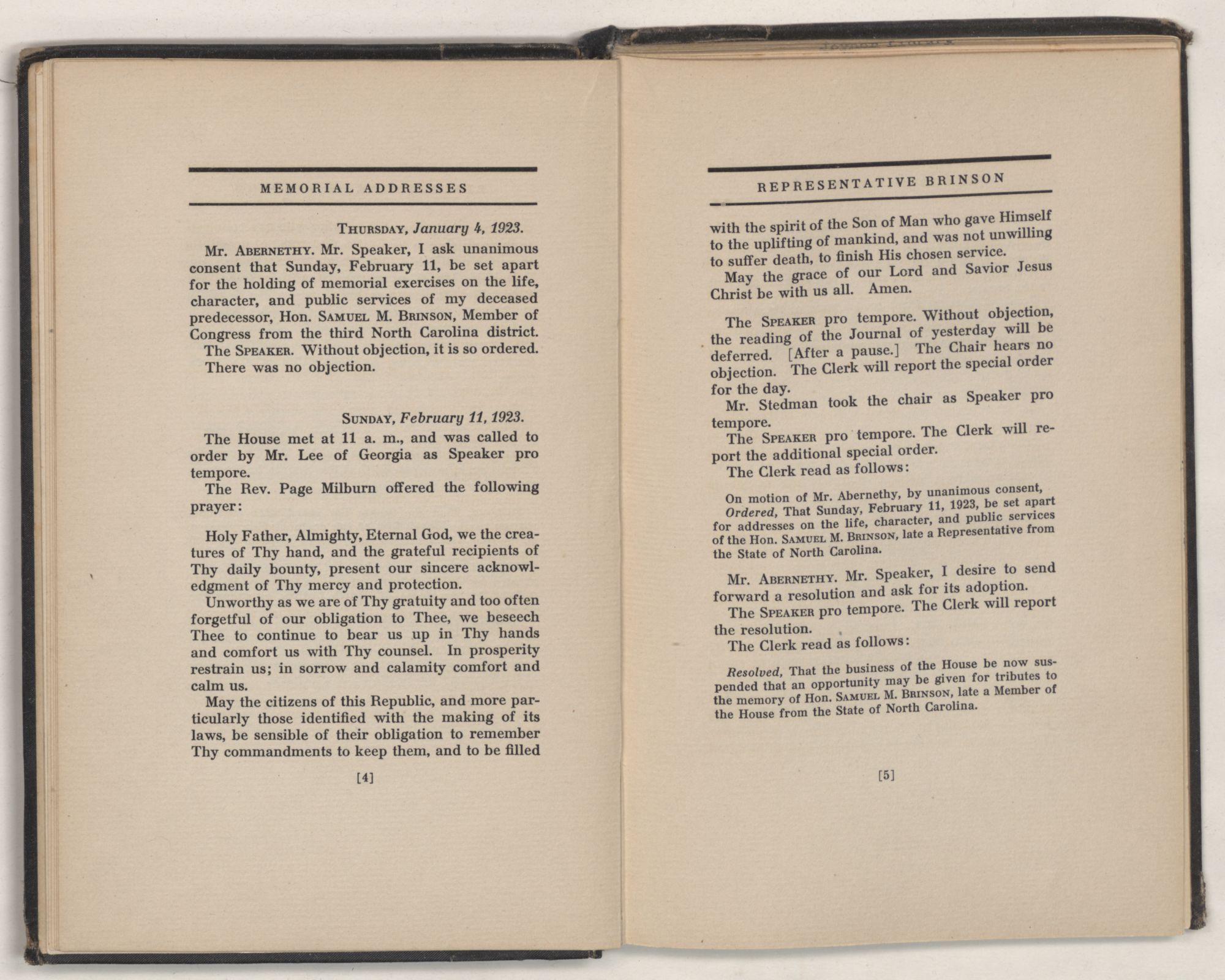 Ordered, That Sunday, February 11, 1923, be set apart for addresses on the life, character, and public services of the Hon. SAMUEL M. BRINSON, late a Representative from the State of North Carolina.