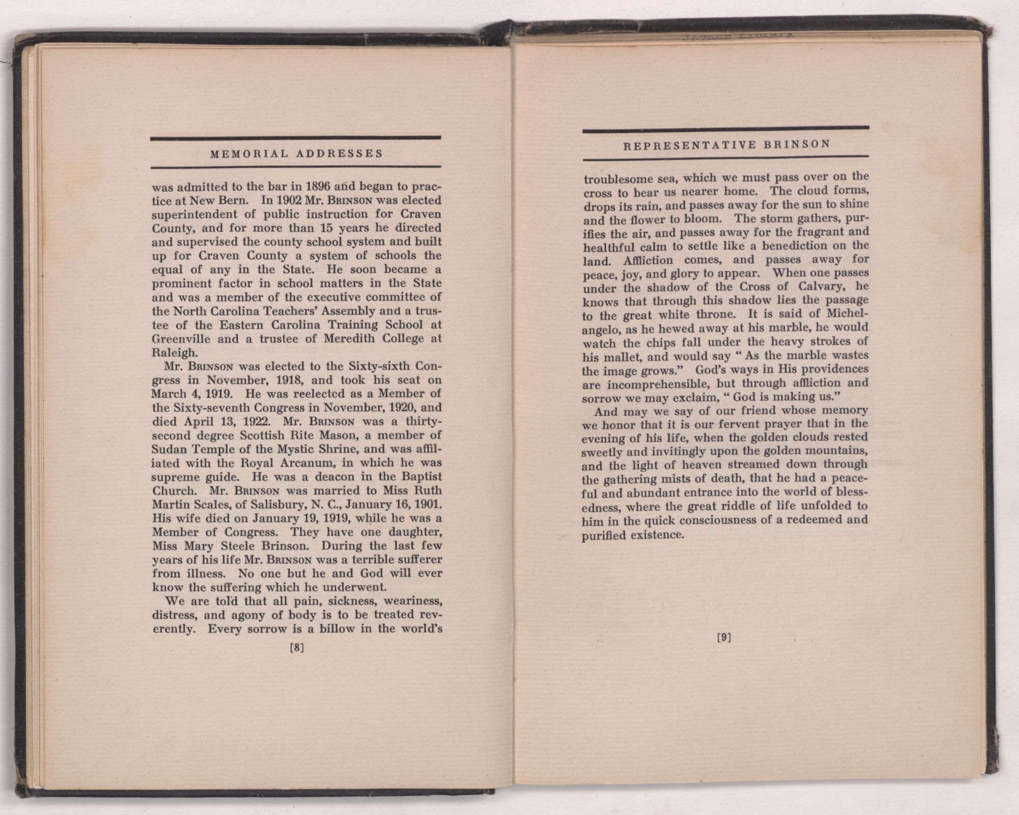 Mr. BRINSON was elected to the Sixty-sixth Congress in November, 1918, and took his seat on March 4, 1919. He was reelected as a Member of the Sixty-seventh Congress in November, 1920, and died April 13, 1922. Mr. BRINSON was a thirty-second degree Scottish Rite Mason, a member of Sudan Temple of the Mystic Shrine, and was affiliated with the Royal Arcanum, in which he was supreme guide. He was a deacon in the Baptist Church. Mr. BRINSON was married to Miss Ruth Martin Scales, of Salisbury, N. C., January 16, 1901. His wife died on January 19, 1919, while he was a Member of Congress. They have one daughter, Miss Mary Steele Brinson. During the last few years of his life Mr. BRINSON was a terrible sufferer from illness. No one but he and God will ever know the suffering which he underwent.