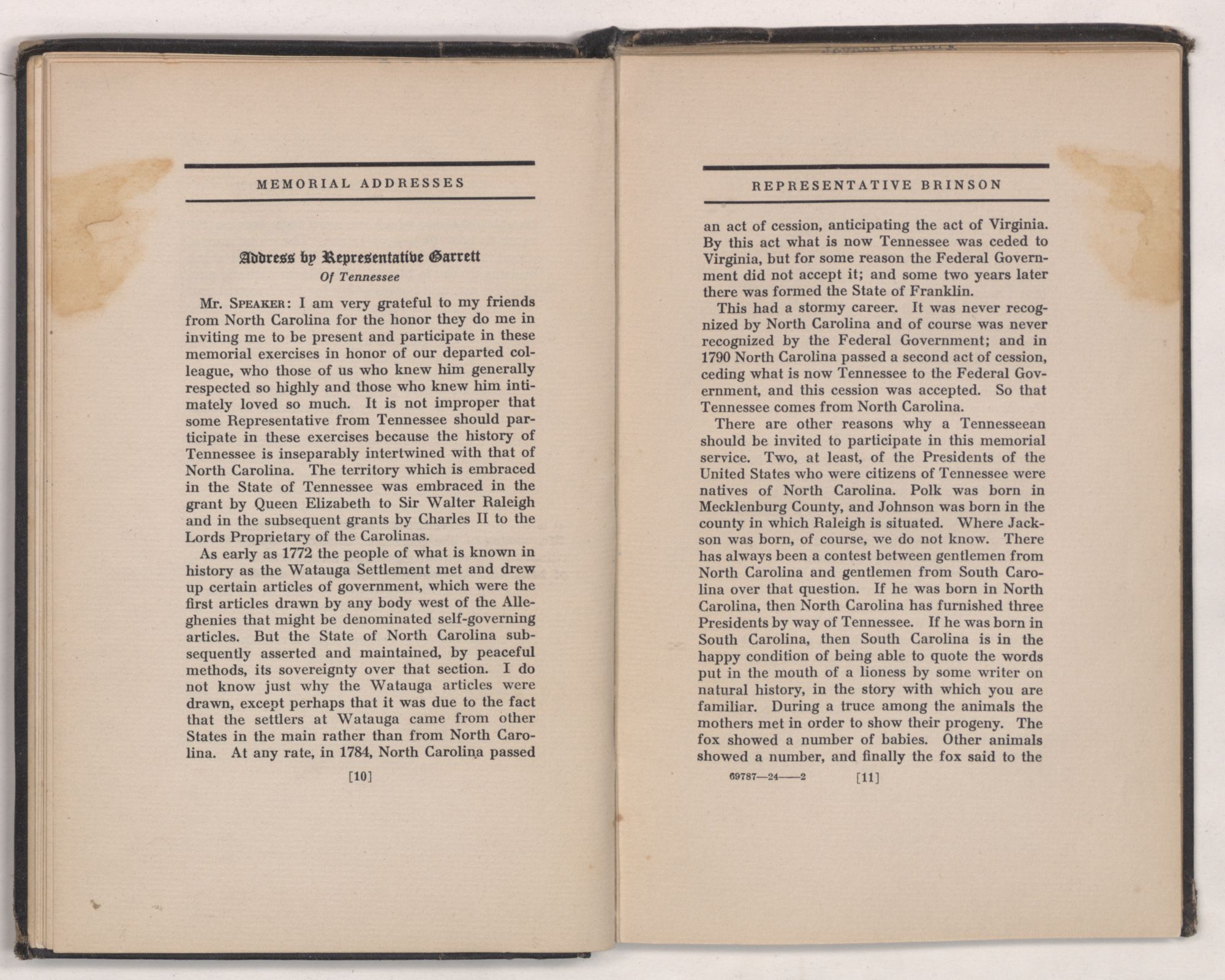 Mr. SPEAKER: I am very grateful to my friends from North Carolina for the honor they do me in inviting me to be present and participate in these memorial exercises in honor of our departed colleague, who those of us who knew him generally respected so highly and those who knew him intimately loved so much. It is not improper that some Representative from Tennessee should participate in these exercises because the history of Tennessee is inseparably intertwined with that of North Carolina. The territory which is embraced in the State of Tennessee was embraced in the grant by Queen Elizabeth to Sir Walter Raleigh and in the subsequent grants by Charles II to the Lords Proprietary of the Carolinas.