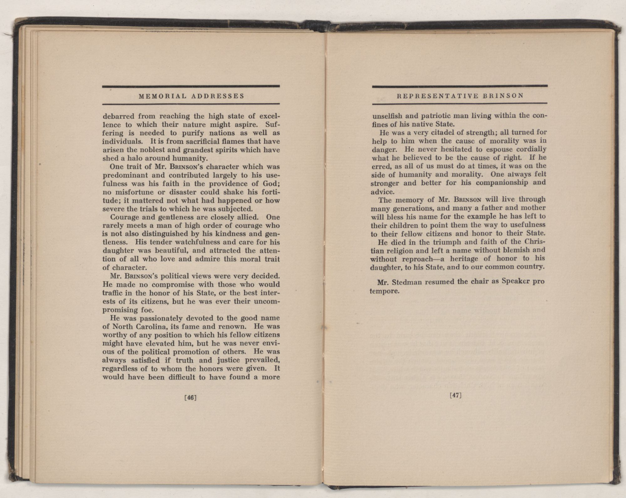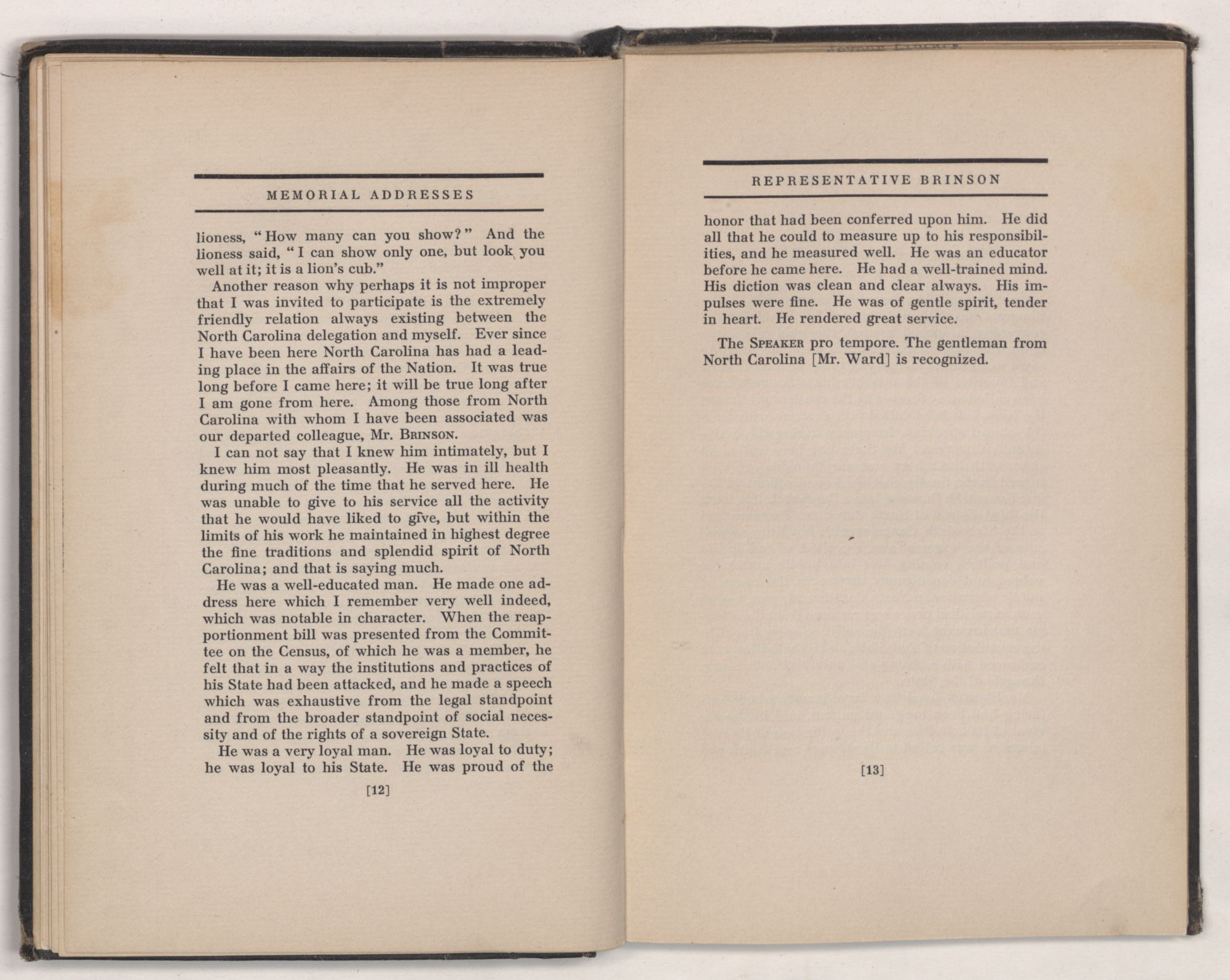 Another reason why perhaps it is not improper that I was invited to participate is the extremely friendly relation always existing between the North Carolina delegation and myself. Ever since I have been here North Carolina has had a leading place in the affairs of the Nation. It was true long before I came here; it will be true long after I am gone from here. Among those from North Carolina with whom I have been associated was our departed colleague, Mr. BRINSON.