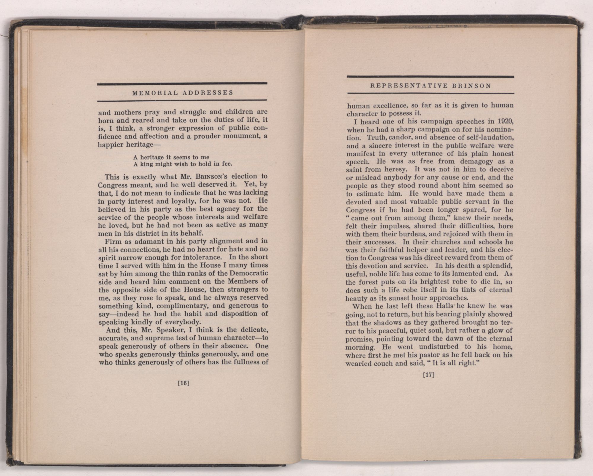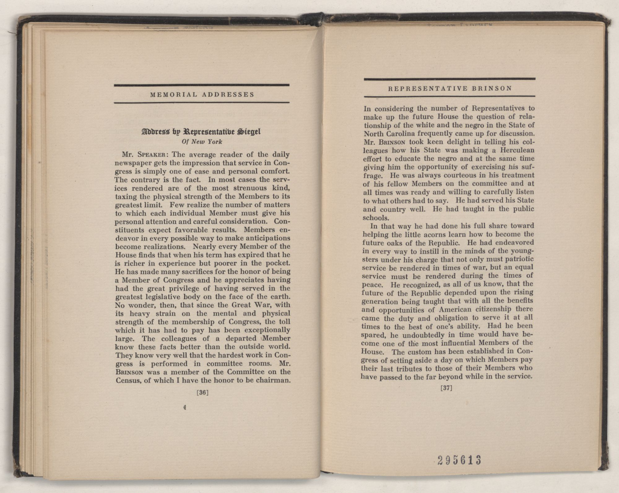 Mr. SPEAKER: The average reader of the daily newspaper gets the impression that service in Congress is simply one of ease and personal comfort. The contrary is the fact. In most cases the services rendered are of the most strenuous kind, taxing the physical strength of the Members to its greatest limit. Few realize the number of matters to which each individual Member must give his personal attention and careful consideration. Constituents expect favorable results. Members endeavor in every possible way to make anticipations become realizations. Nearly every Member of the House finds that when his term has expired that he is richer in experience but poorer in the pocket. He has made many sacrifices for the honor of being a Member of Congress and he appreciates having had the great privilege of having served in the greatest legislative body on the face of the earth. No wonder, then, that since the Great War, with its heavy strain on the mental and physical strength of the membership of Congress, the toll which it has had to pay has been exceptionally large. The colleagues of a departed Member know these facts better than the outside world. They know very well that the hardest work in Congress is performed in committee rooms. Mr. BRINSON was a member of the Committee on the Census, of which I have the honor to be chairman.
