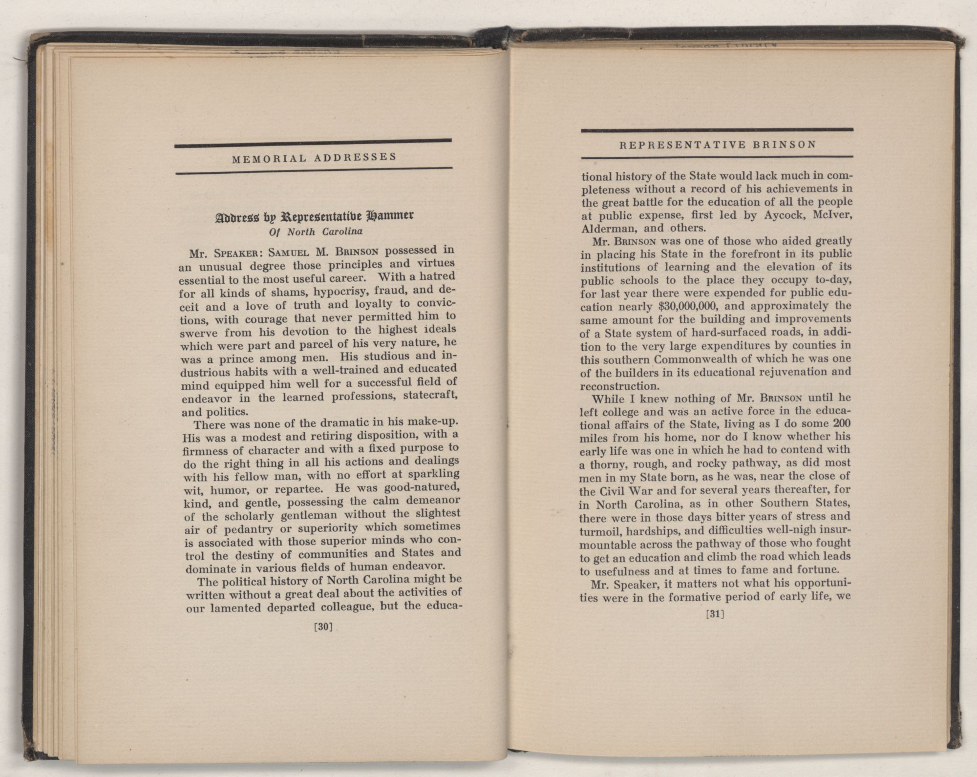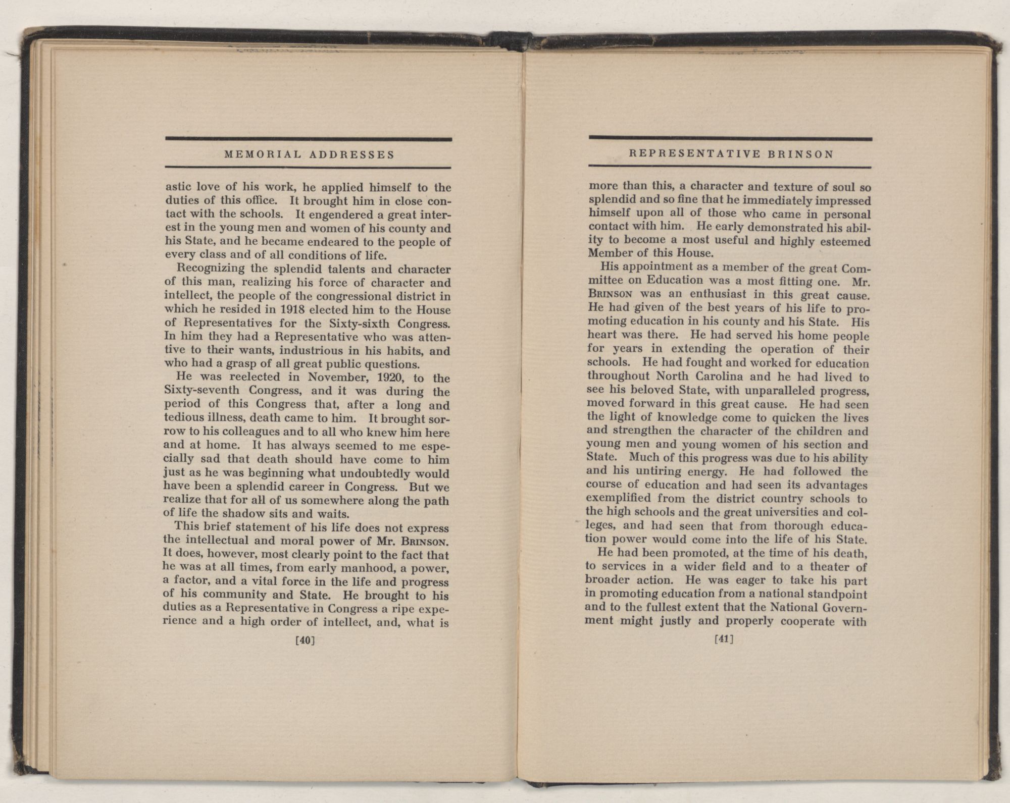 His appointment as a member of the great Committee on Education was a most fitting one. Mr. BRINSON was an enthusiast in this great cause. He had given of the best years of his life to promoting education in his county and his State. His heart was there. He had served his home people for years in extending the operation of their schools. He had fought and worked for education throughout North Carolina and he had lived to see his beloved State, with unparalleled progress, moved forward in this great cause. He had seen the light of knowledge come to quicken the lives and strengthen the character of the children and young men and young women of his section and State. Much of this progress was due to his ability and his untiring energy. He had followed the course of education and had seen its advantages exemplified from the district country schools to the high schools and the great universities and colleges, and had seen that from thorough education power would come into the life of his State.