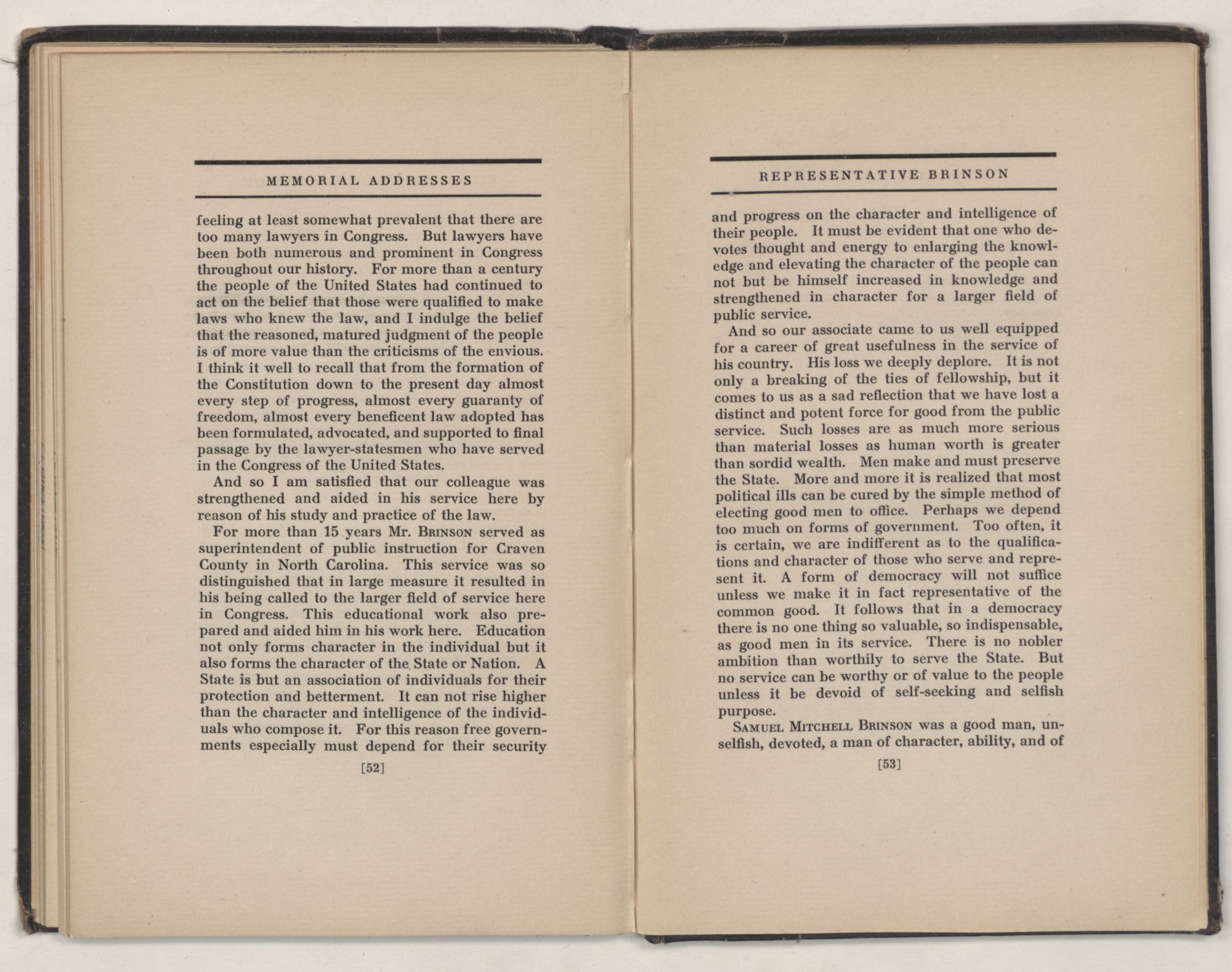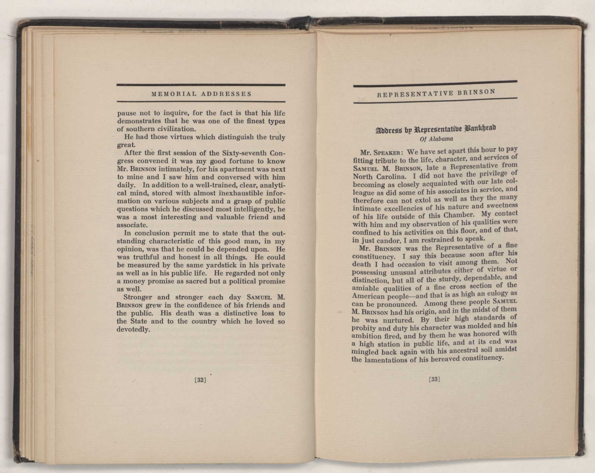 Mr. SPEAKER: The service of SAMUEL MITCHELL BRINSON in the House of Representatives of the United States was all too brief. It continued from March 4, 1919, to April 13, 1922, a period of only a little over three years. During that short period I had the opportunity and privilege of knowing personally Mr. BRINSON well, for we served together on two committees of the House. It is on these committees in the close contact and almost intimate relations of our work there that the character and qualifications of our associates become best known. It soon became apparent from such acquaintance with Mr. BRINSON that his nature was a rare combination of clear mind, pure heart, and high ideals. Any appeal based on justice, fair dealing, and, what Theodore Roosevelt used to call “civic righteousness,” met with a ready response from him and enlisted his earnest support.
