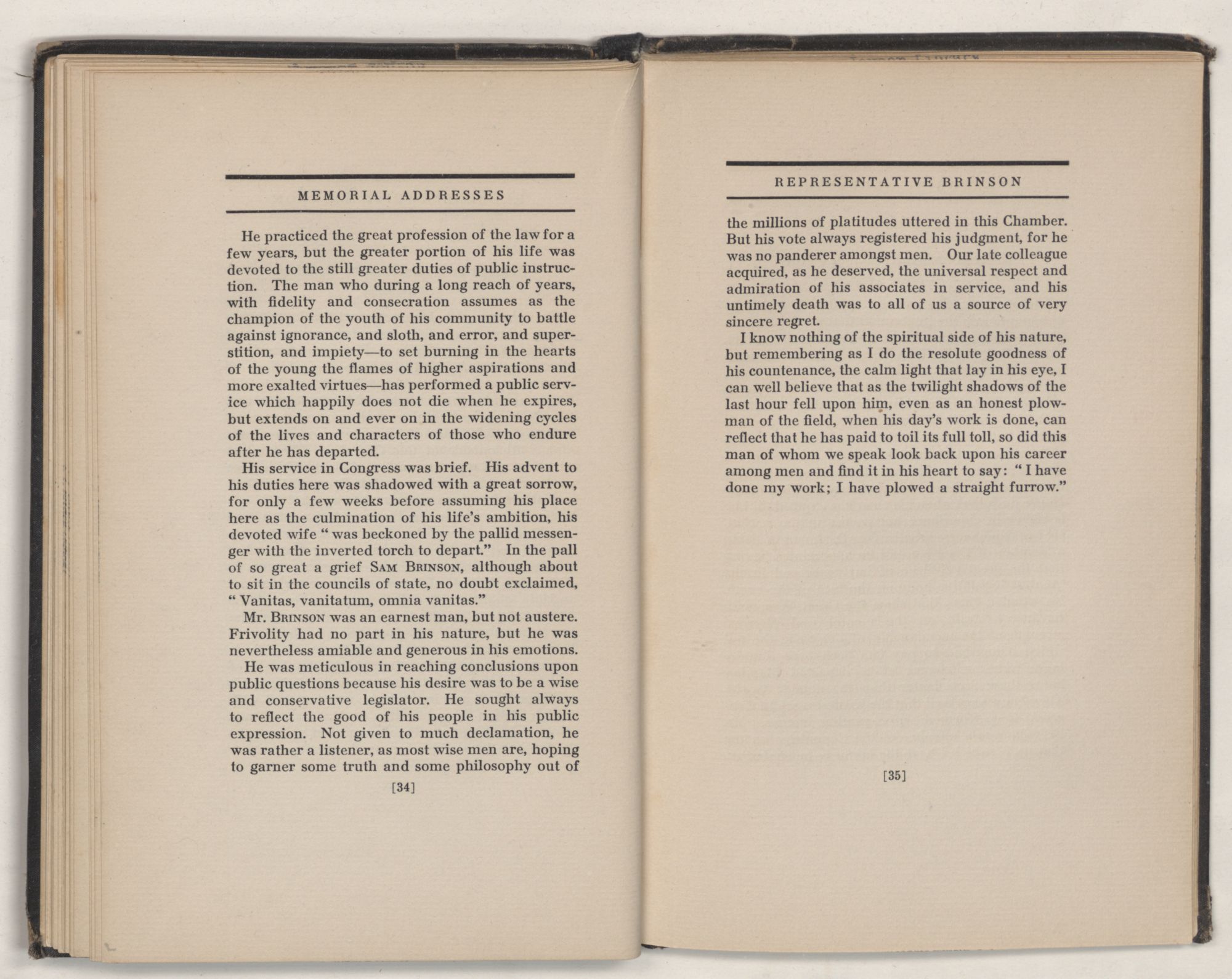 His service in Congress was brief. His advent to his duties here was shadowed with a great sorrow, for only a few weeks before assuming his place here as the culmination of his life's ambition, his devoted wife “was beckoned by the pallid messenger with the inverted torch to depart.” In the pall of so great a grief SAM BRINSON, although about to sit in the councils of state, no doubt exclaimed, “Vanitas, vanitatum, omnia vanitas.”