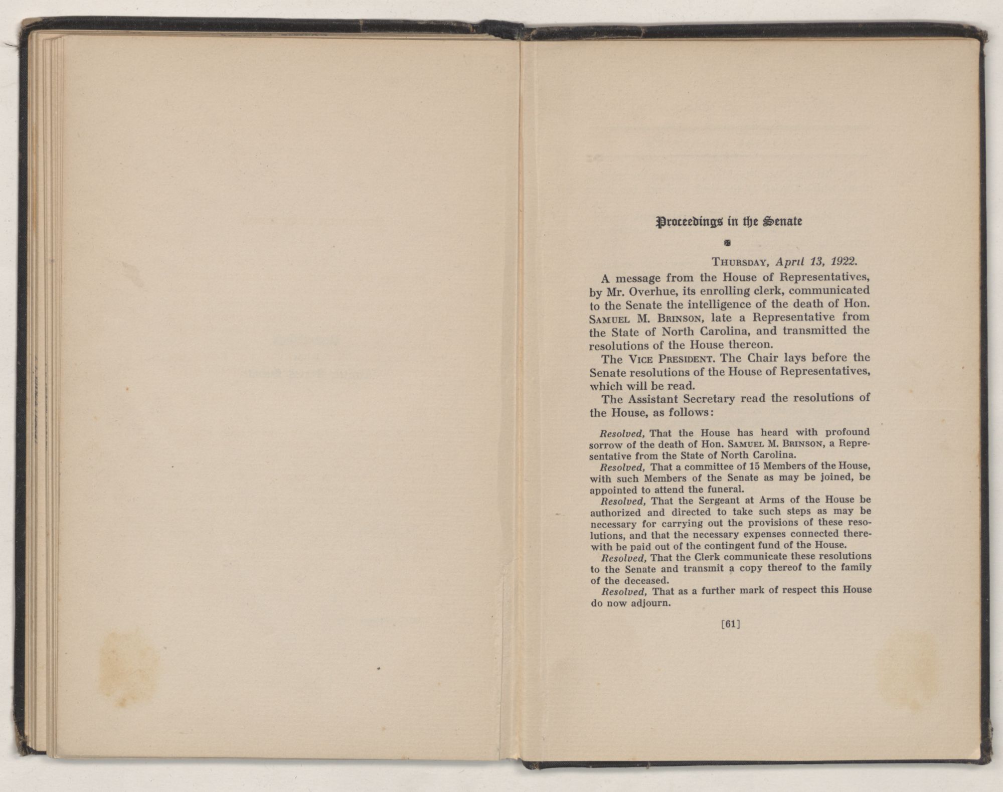 Resolved, That the Senate has heard with profound sorrow the announcement of the death of Hon. SAMUEL M. BRINSON, late a Representative from the State of North Carolina.