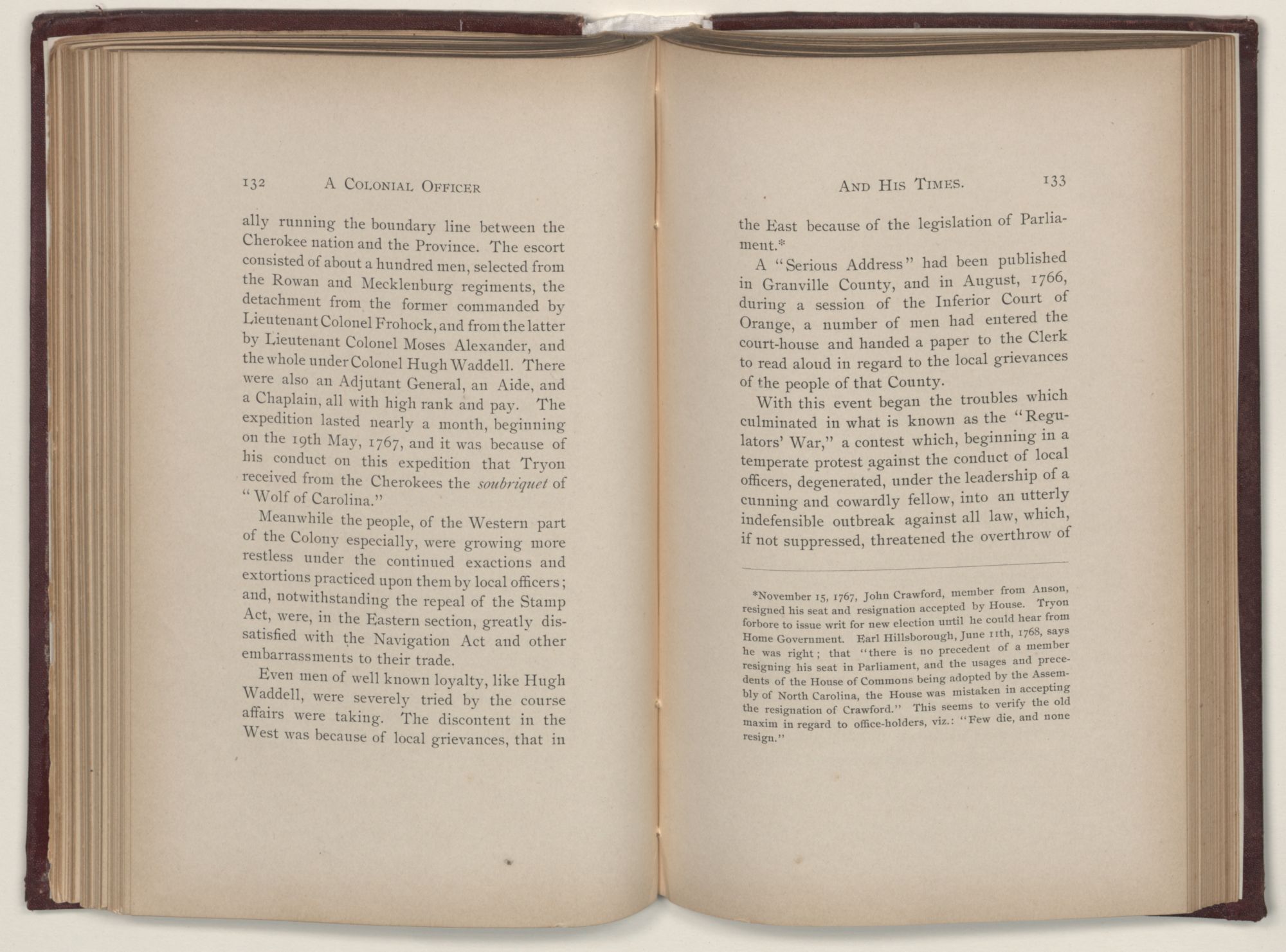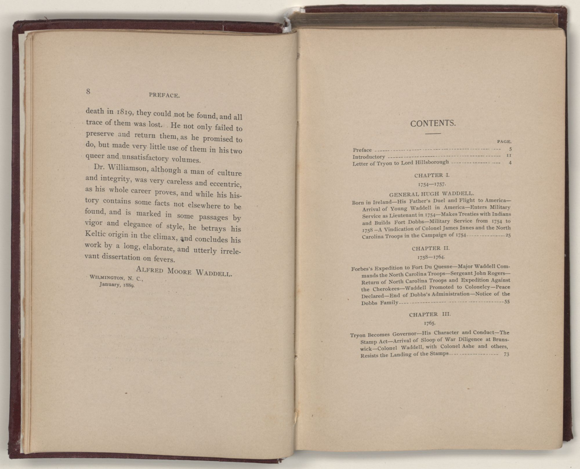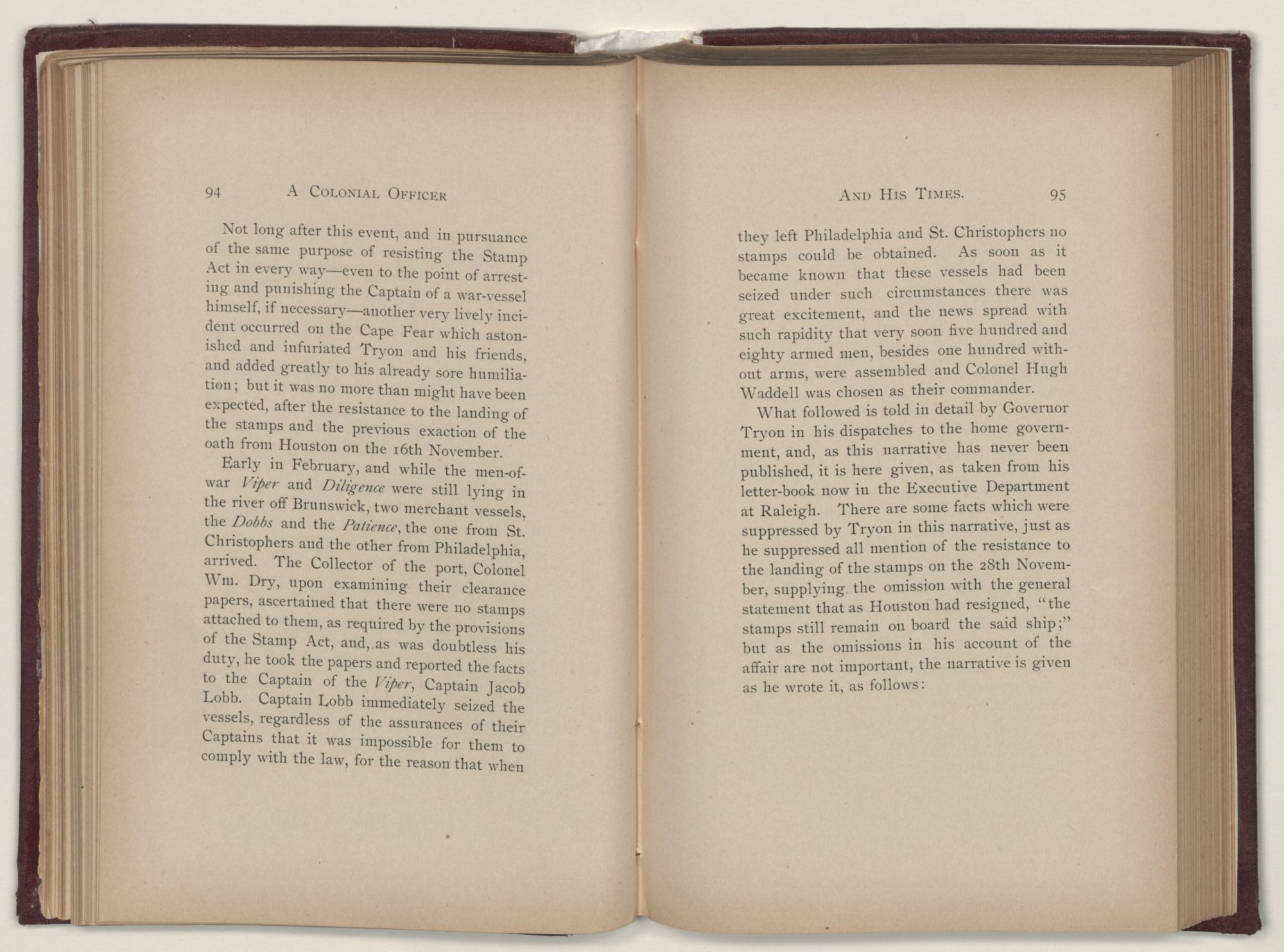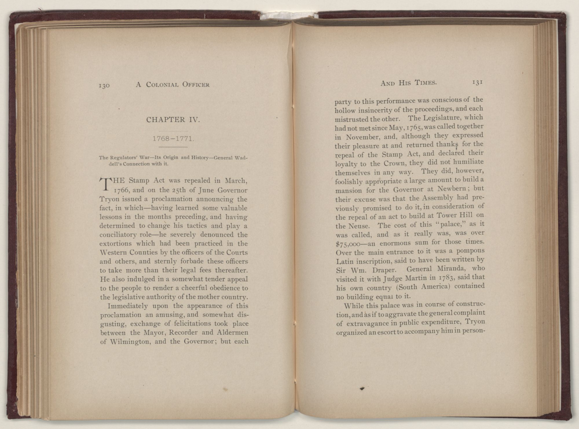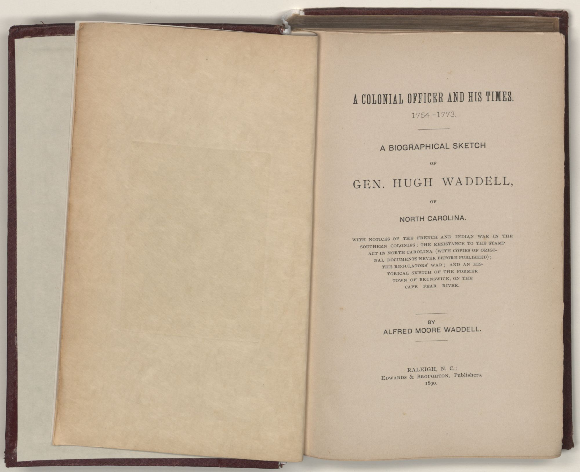 A COLONIAL OFFICER AND HIS TIMES. 1754-1773.A BIOGRAPHICAL SKETCH OF GEN. HUGH WADDELL, OF NORTH CAROLINA.WITH NOTICES OF THE FRENCH AND INDIAN WAR IN THE SOUTHERN COLONIES; THE RESISTANCE TO THE STAMP ACT IN NORTH CAROLINA (WITH COPIES OF ORIGINAL DOCUMENTS NEVER BEFORE PUBLISHED); THE REGULATORS’ WAR; AND AN HISTORICAL SKETCH OF THE FORMER TOWN OF BRUNSWICK, ON THE CAPE FEAR RIVER.BY ALFRED MOORE WADDELL.RALEIGH, N. C.:EDWARDS & BROUGHTON, Publishers.1890.