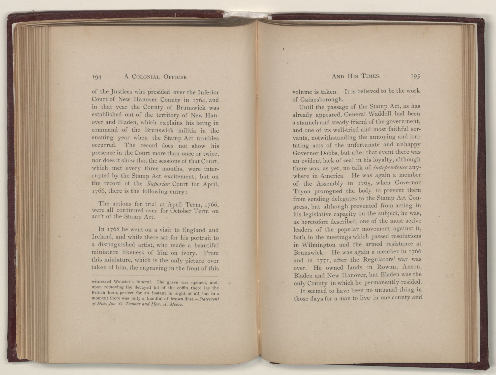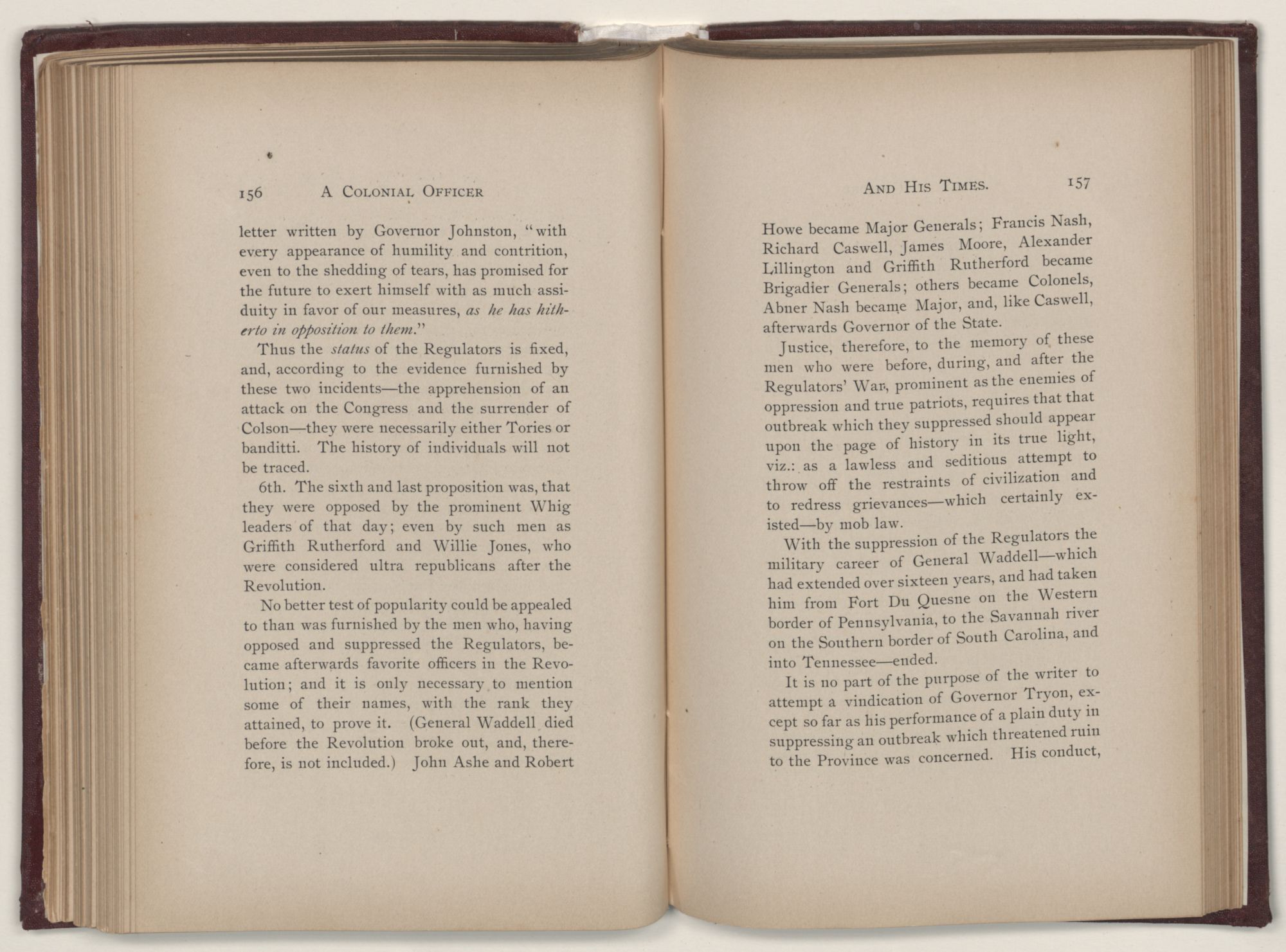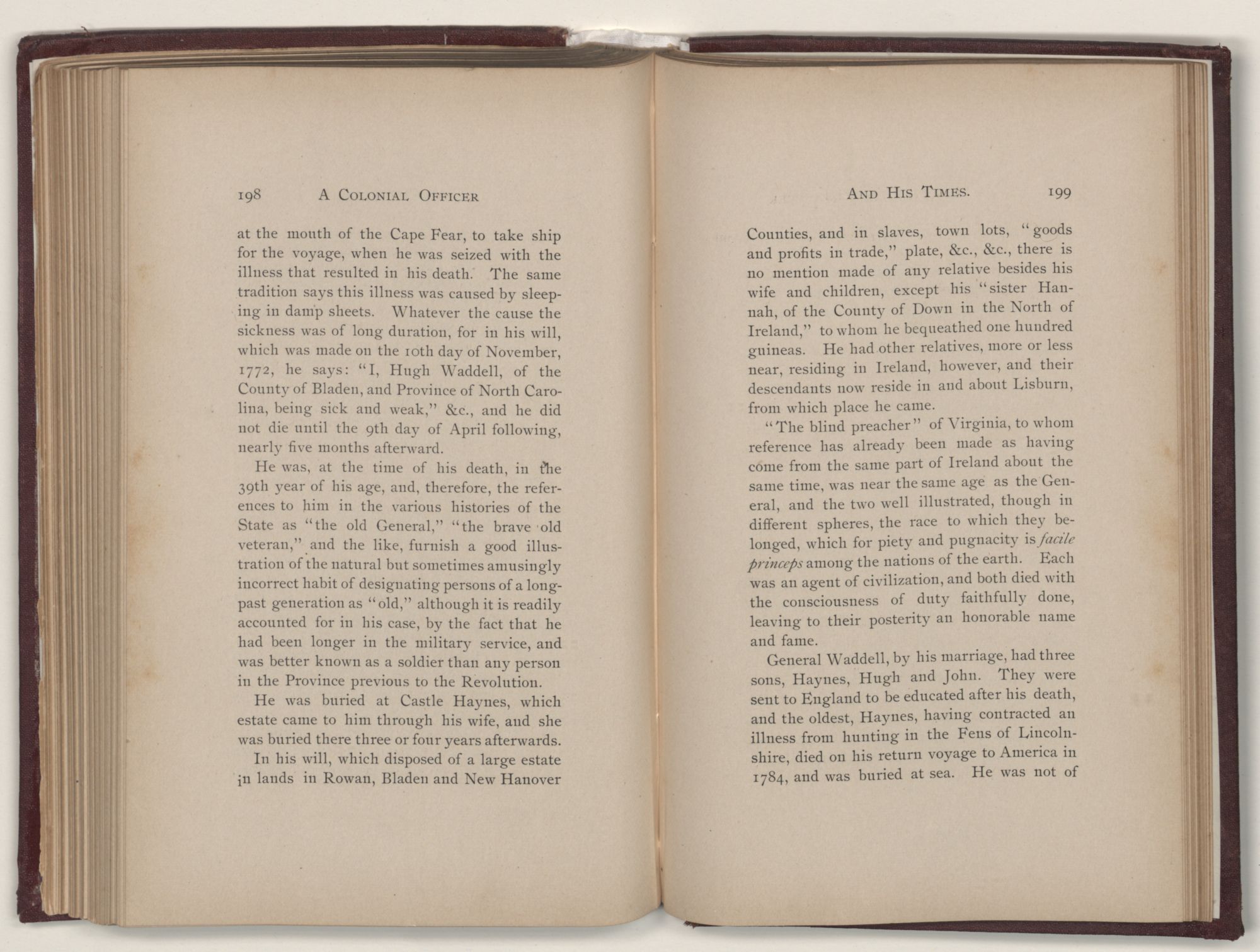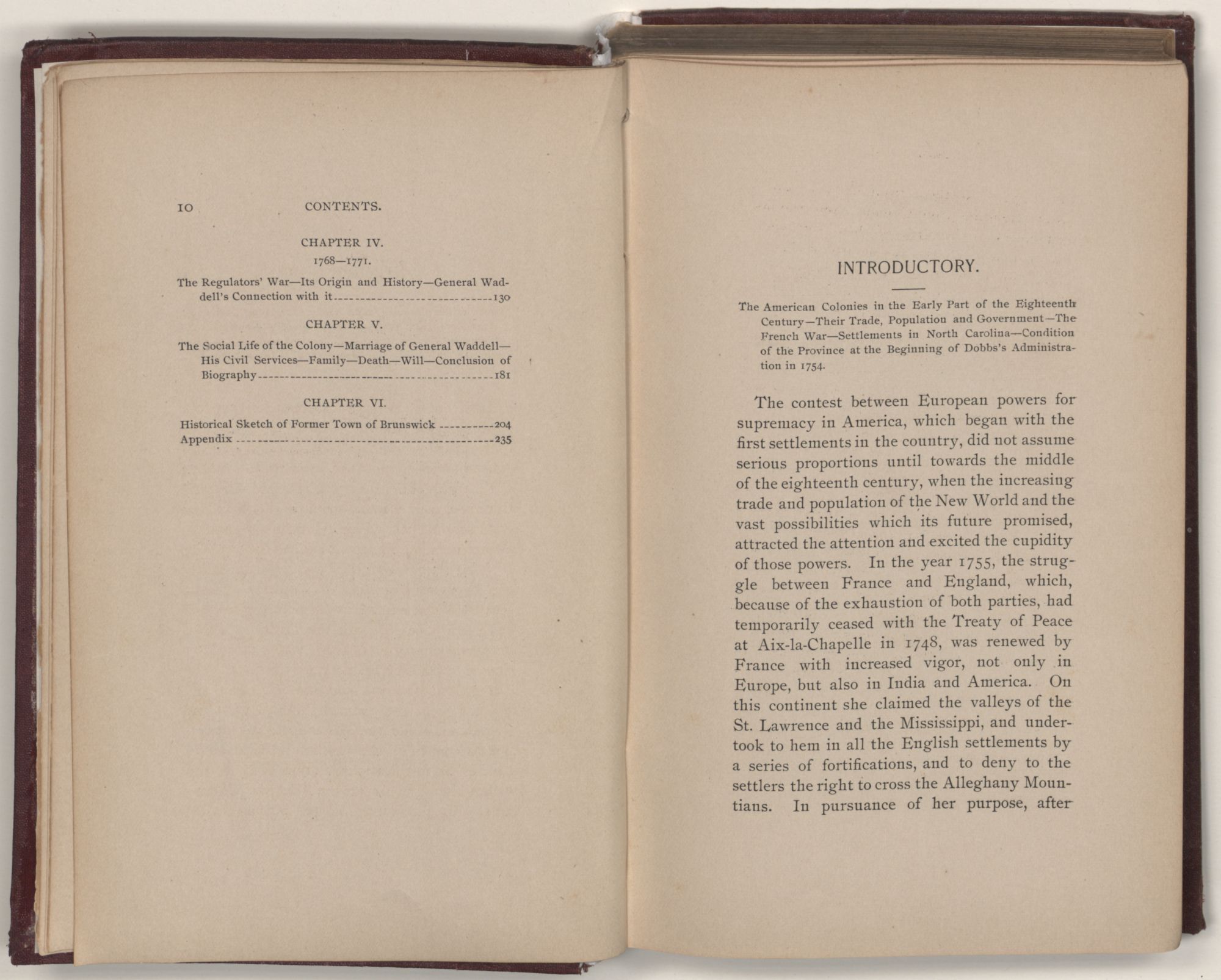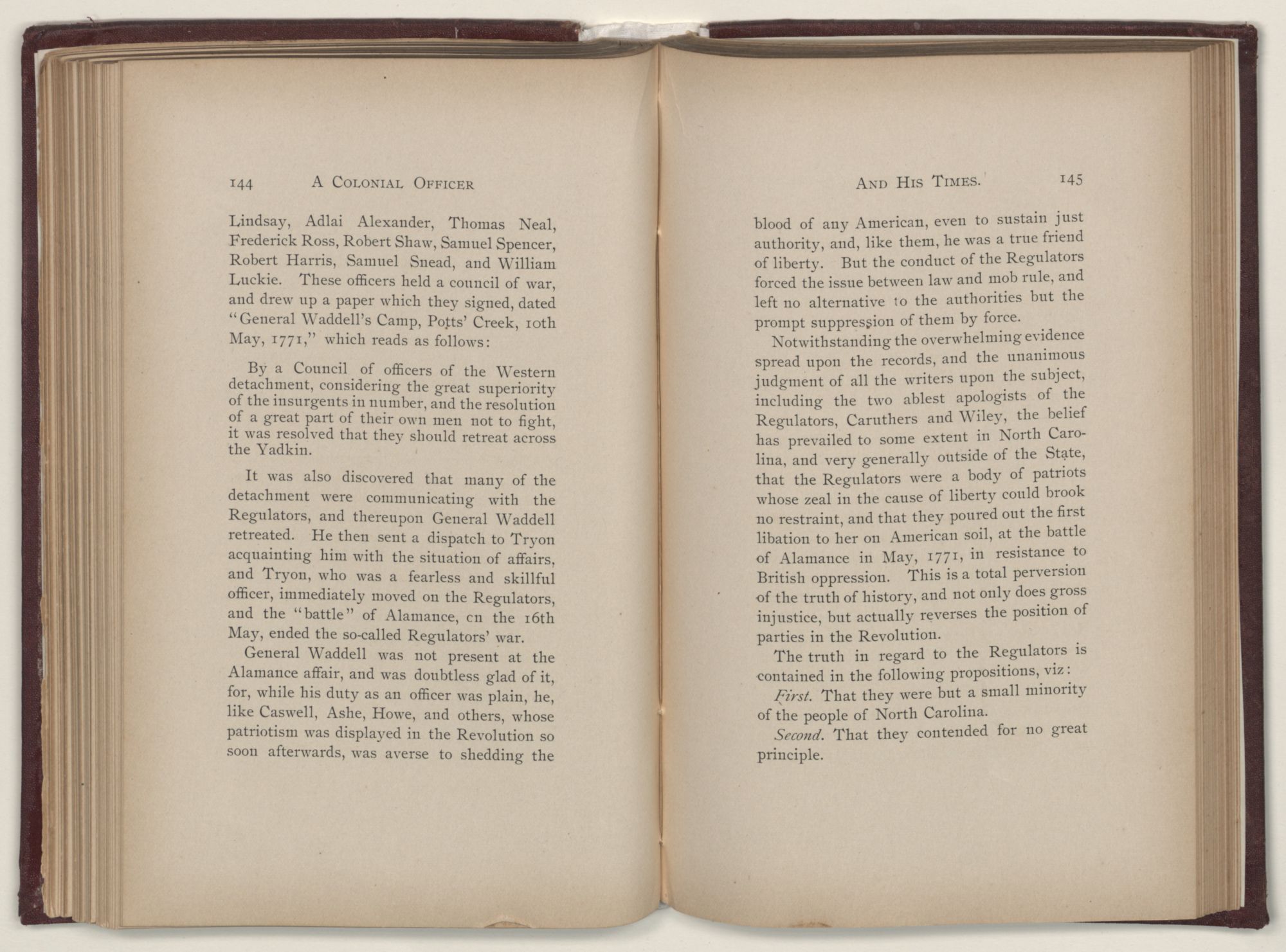 A COLONIAL OFFICER AND HIS TIMES. 1754-1773.A BIOGRAPHICAL SKETCH OF GEN. HUGH WADDELL, OF NORTH CAROLINA.WITH NOTICES OF THE FRENCH AND INDIAN WAR IN THE SOUTHERN COLONIES; THE RESISTANCE TO THE STAMP ACT IN NORTH CAROLINA (WITH COPIES OF ORIGINAL DOCUMENTS NEVER BEFORE PUBLISHED); THE REGULATORS’ WAR; AND AN HISTORICAL SKETCH OF THE FORMER TOWN OF BRUNSWICK, ON THE CAPE FEAR RIVER.BY ALFRED MOORE WADDELL.RALEIGH, N. C.:EDWARDS & BROUGHTON, Publishers.1890.