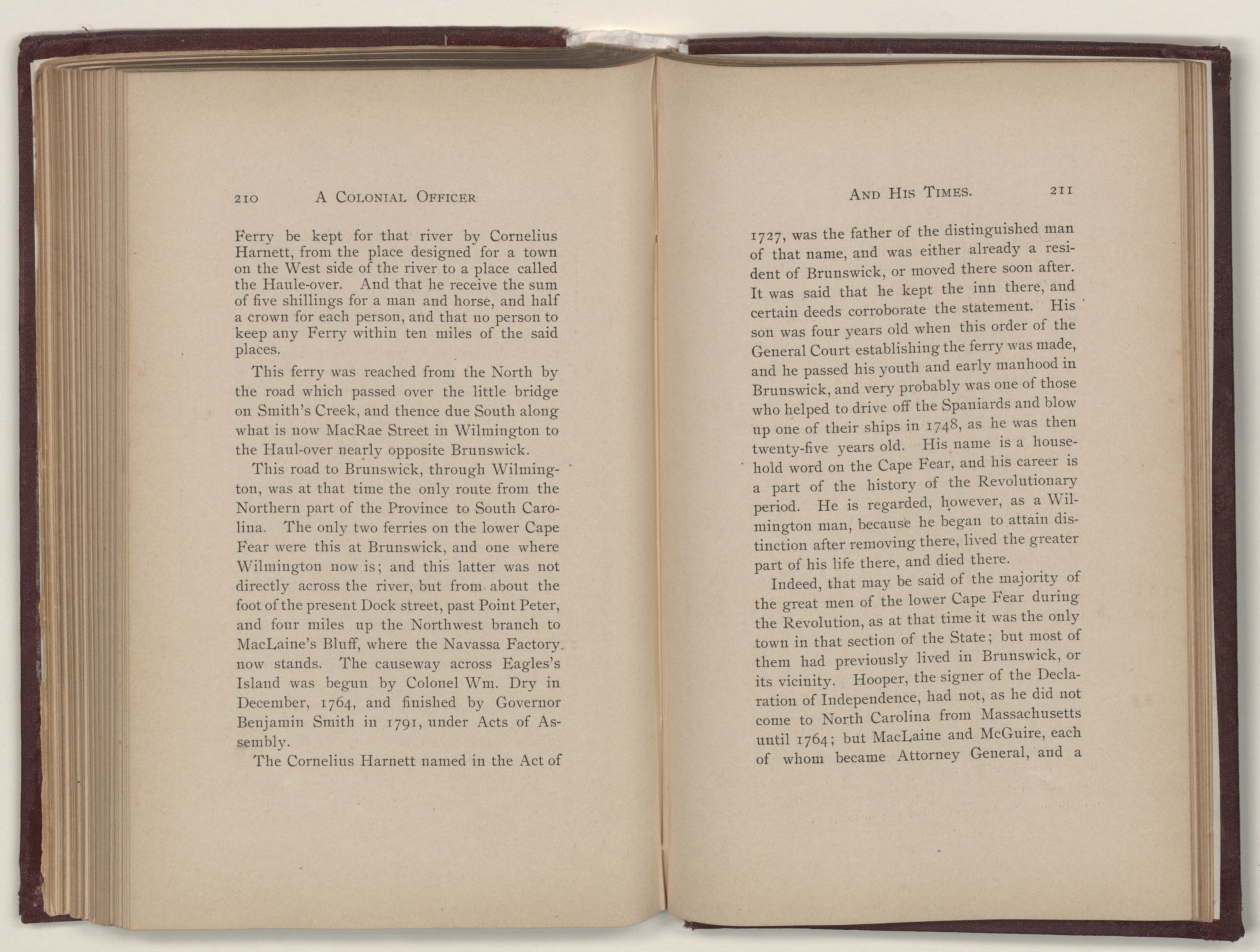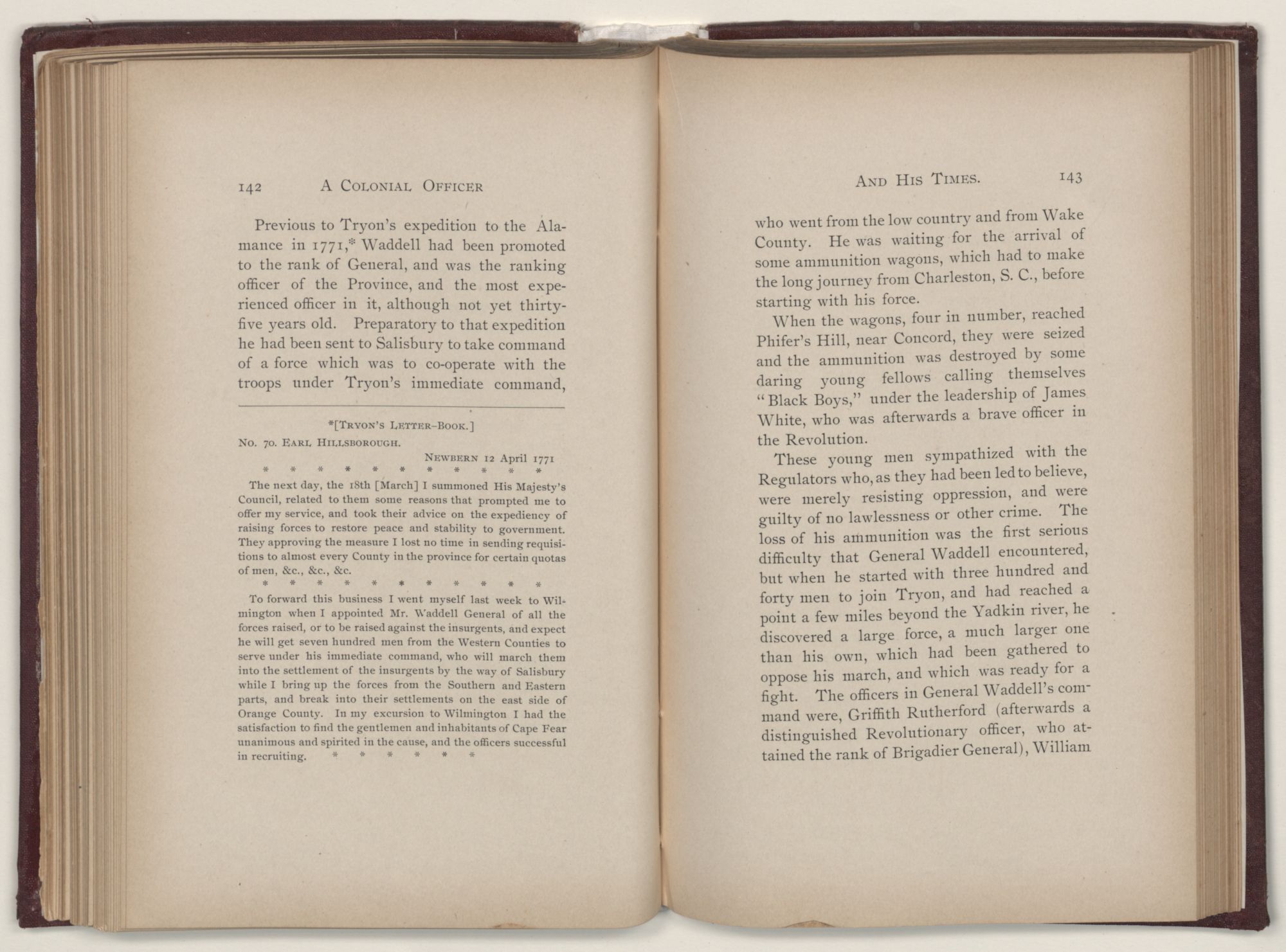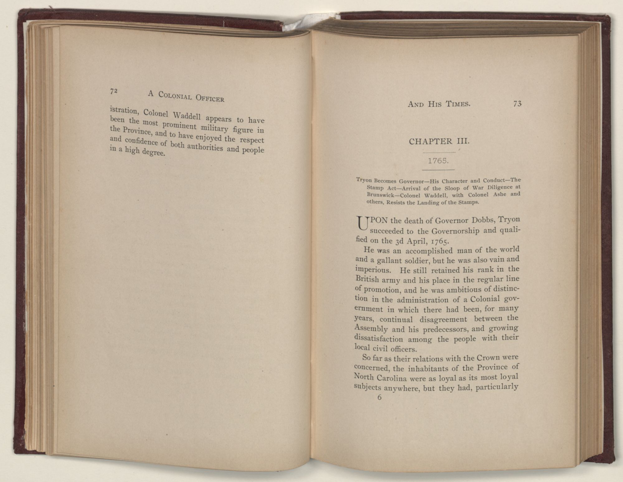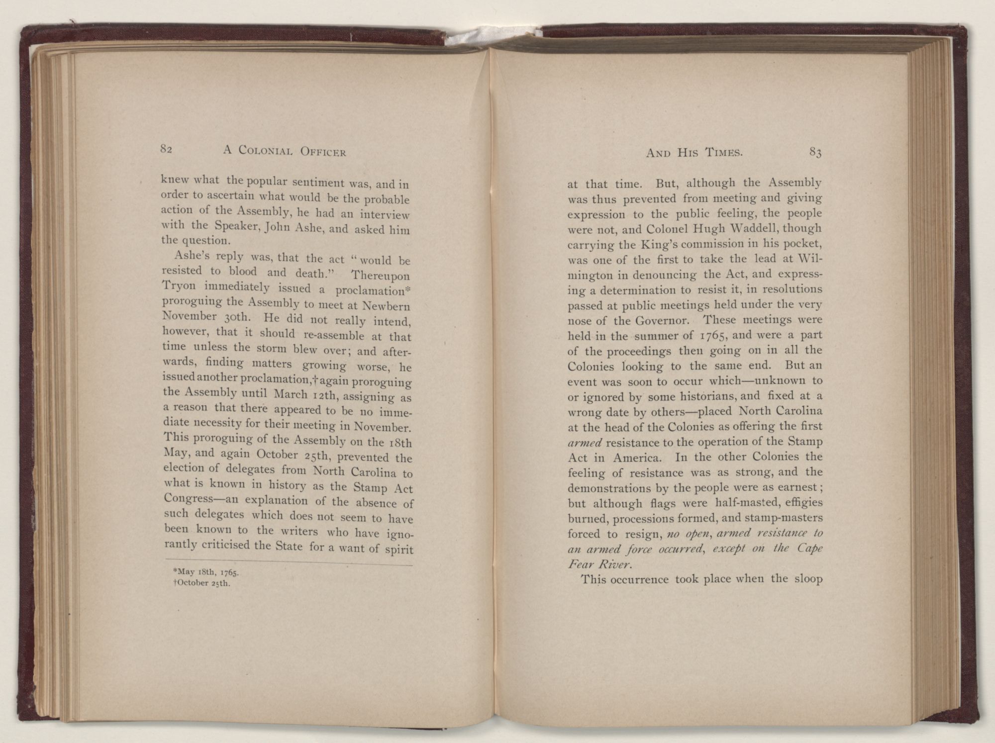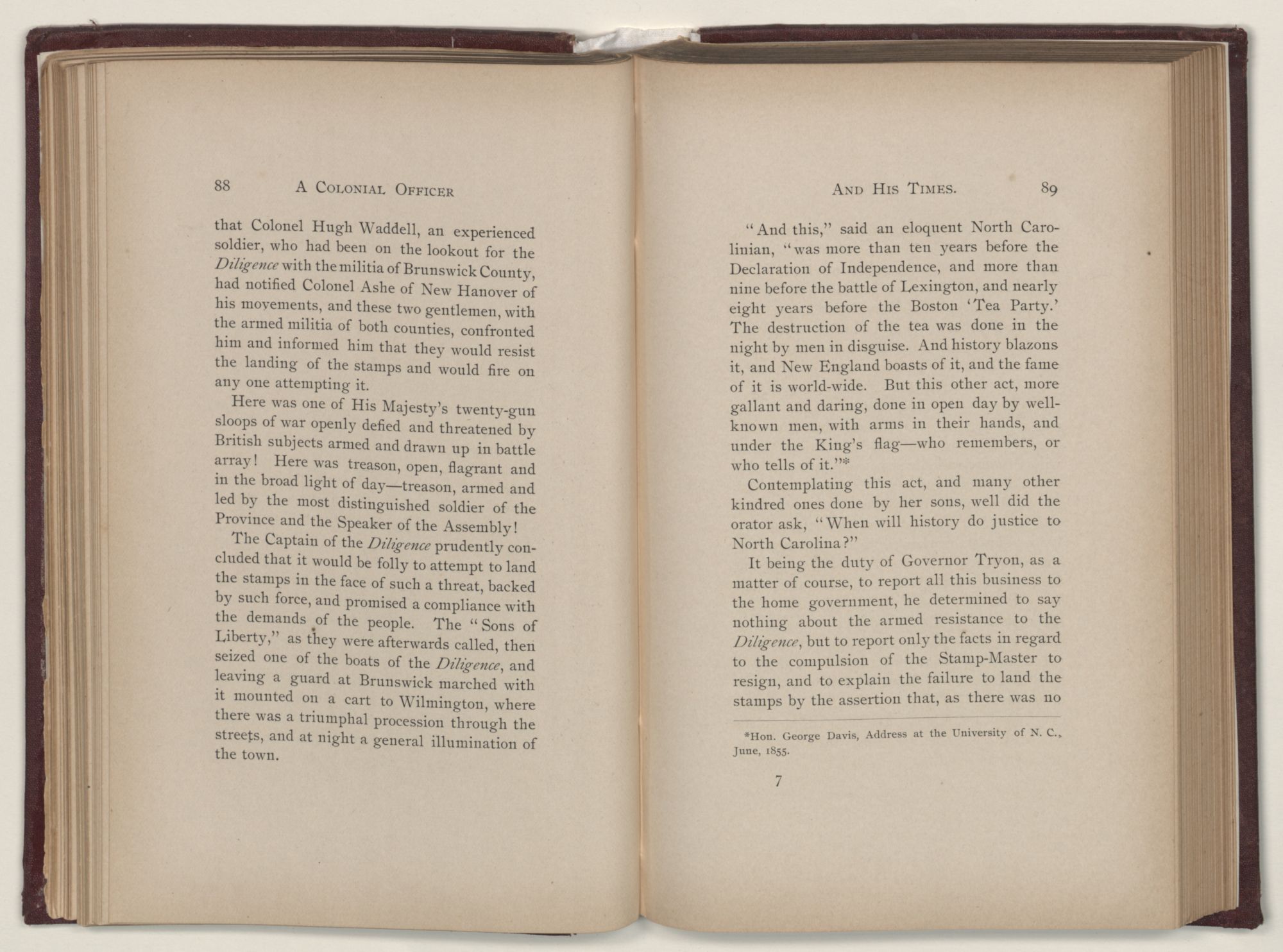 A COLONIAL OFFICER AND HIS TIMES. 1754-1773.A BIOGRAPHICAL SKETCH OF GEN. HUGH WADDELL, OF NORTH CAROLINA.WITH NOTICES OF THE FRENCH AND INDIAN WAR IN THE SOUTHERN COLONIES; THE RESISTANCE TO THE STAMP ACT IN NORTH CAROLINA (WITH COPIES OF ORIGINAL DOCUMENTS NEVER BEFORE PUBLISHED); THE REGULATORS’ WAR; AND AN HISTORICAL SKETCH OF THE FORMER TOWN OF BRUNSWICK, ON THE CAPE FEAR RIVER.BY ALFRED MOORE WADDELL.RALEIGH, N. C.:EDWARDS & BROUGHTON, Publishers.1890.