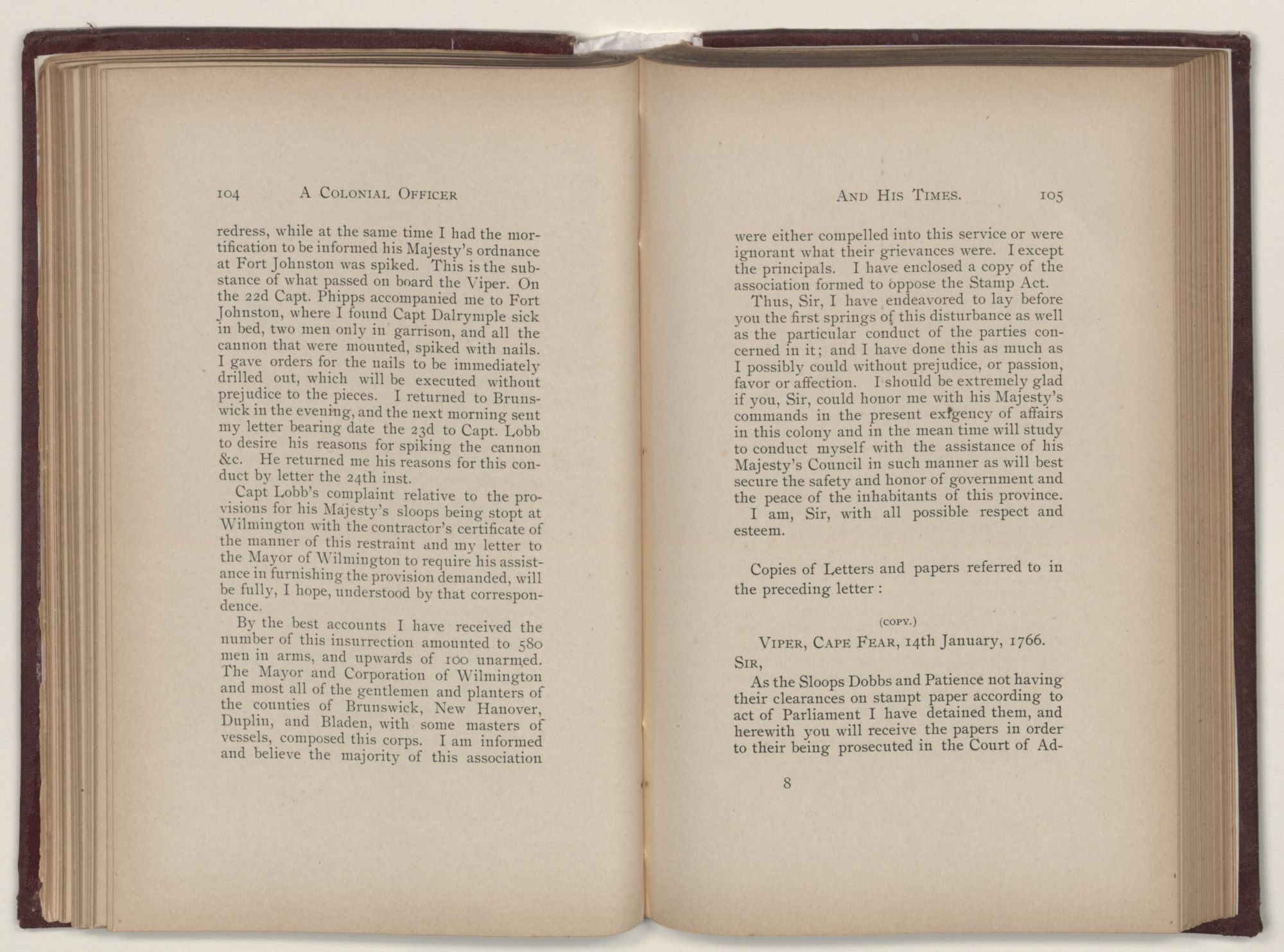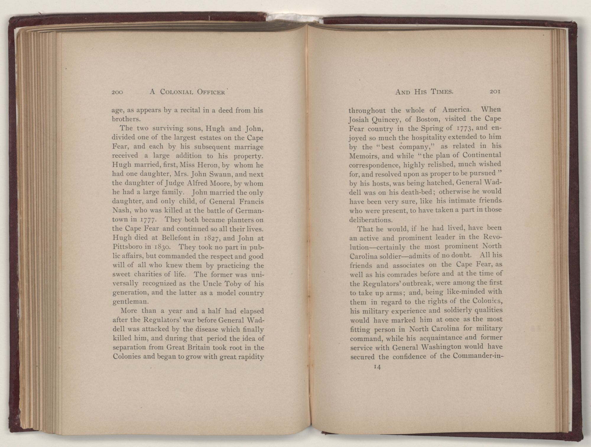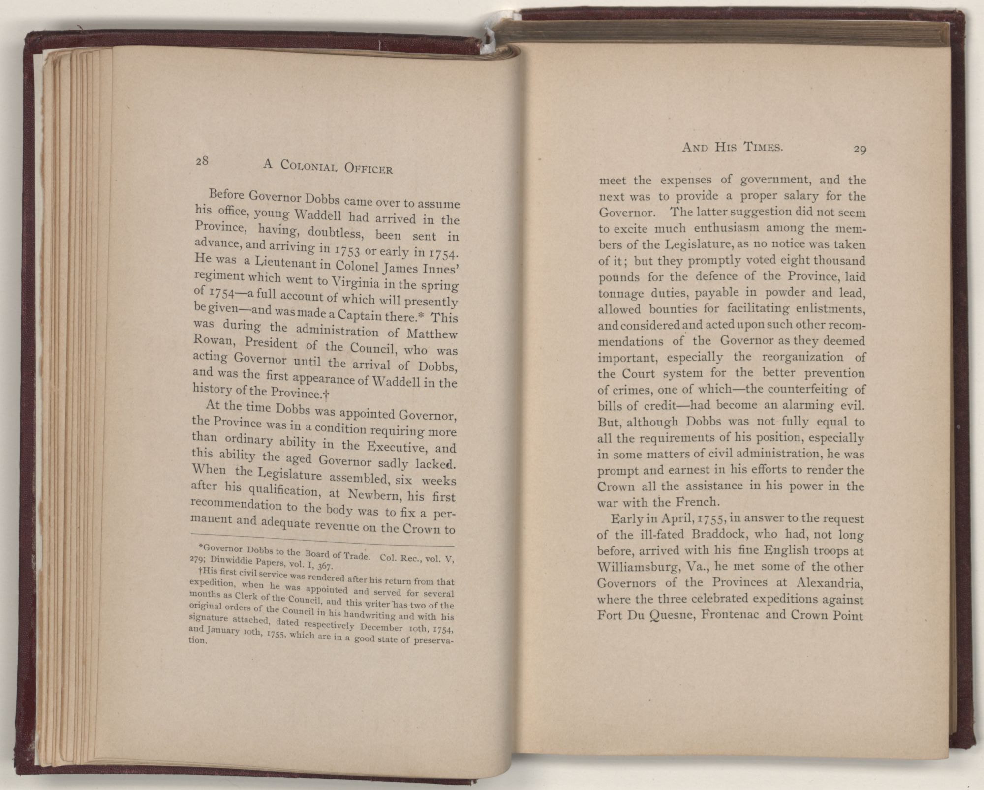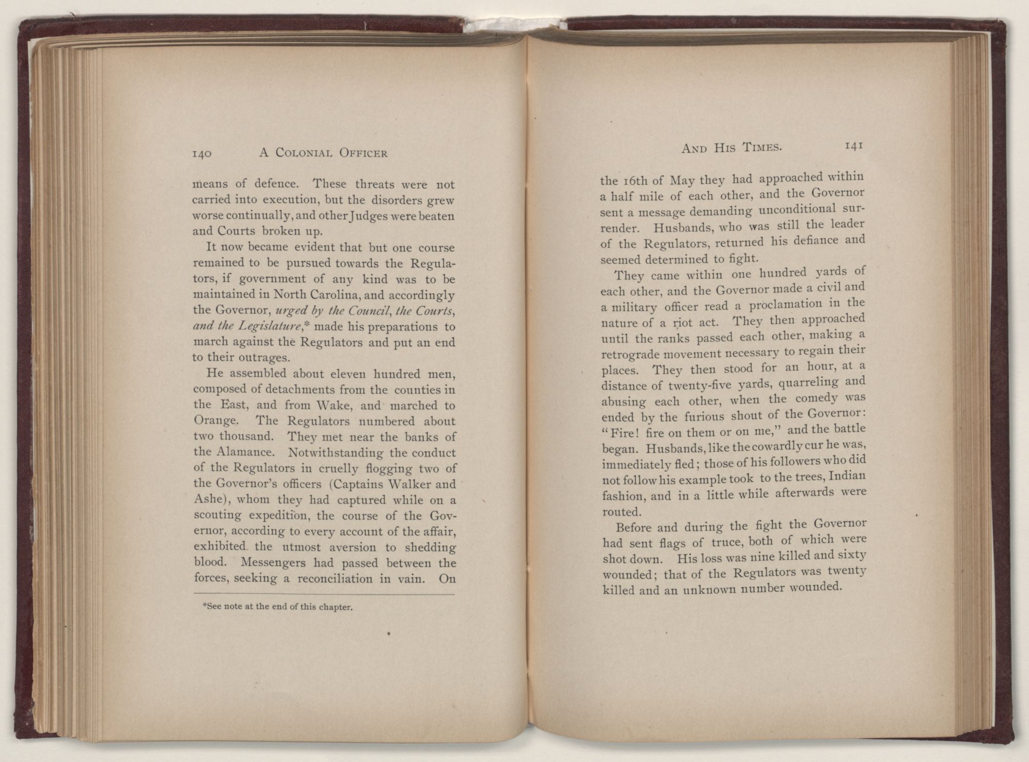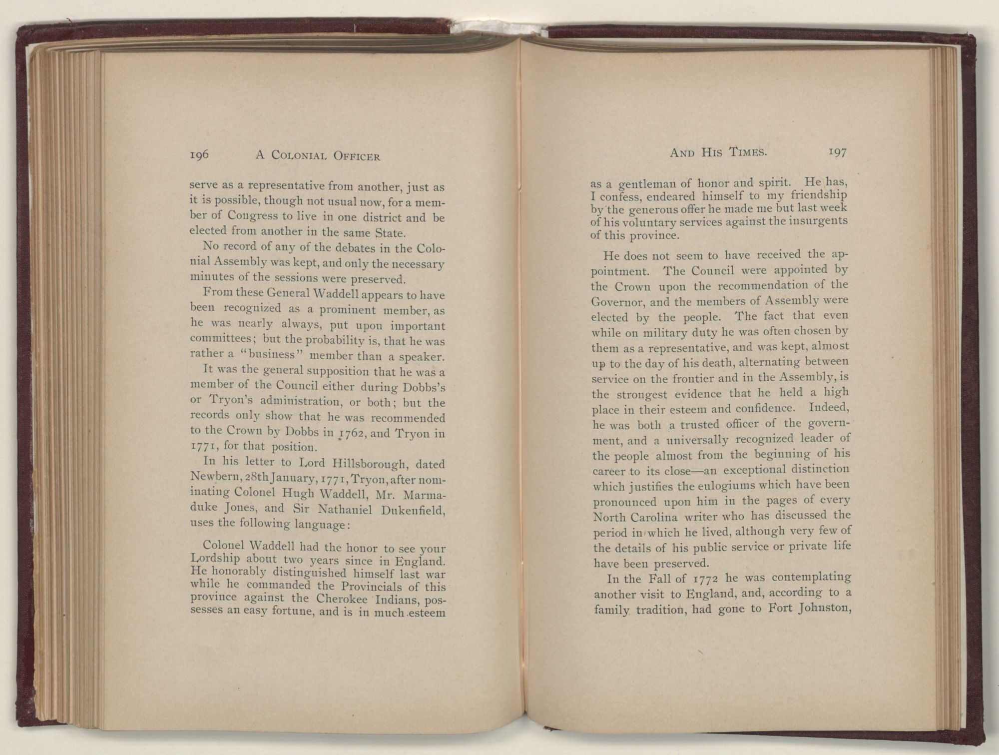A COLONIAL OFFICER AND HIS TIMES. 1754-1773.A BIOGRAPHICAL SKETCH OF GEN. HUGH WADDELL, OF NORTH CAROLINA.WITH NOTICES OF THE FRENCH AND INDIAN WAR IN THE SOUTHERN COLONIES; THE RESISTANCE TO THE STAMP ACT IN NORTH CAROLINA (WITH COPIES OF ORIGINAL DOCUMENTS NEVER BEFORE PUBLISHED); THE REGULATORS’ WAR; AND AN HISTORICAL SKETCH OF THE FORMER TOWN OF BRUNSWICK, ON THE CAPE FEAR RIVER.BY ALFRED MOORE WADDELL.RALEIGH, N. C.:EDWARDS & BROUGHTON, Publishers.1890.