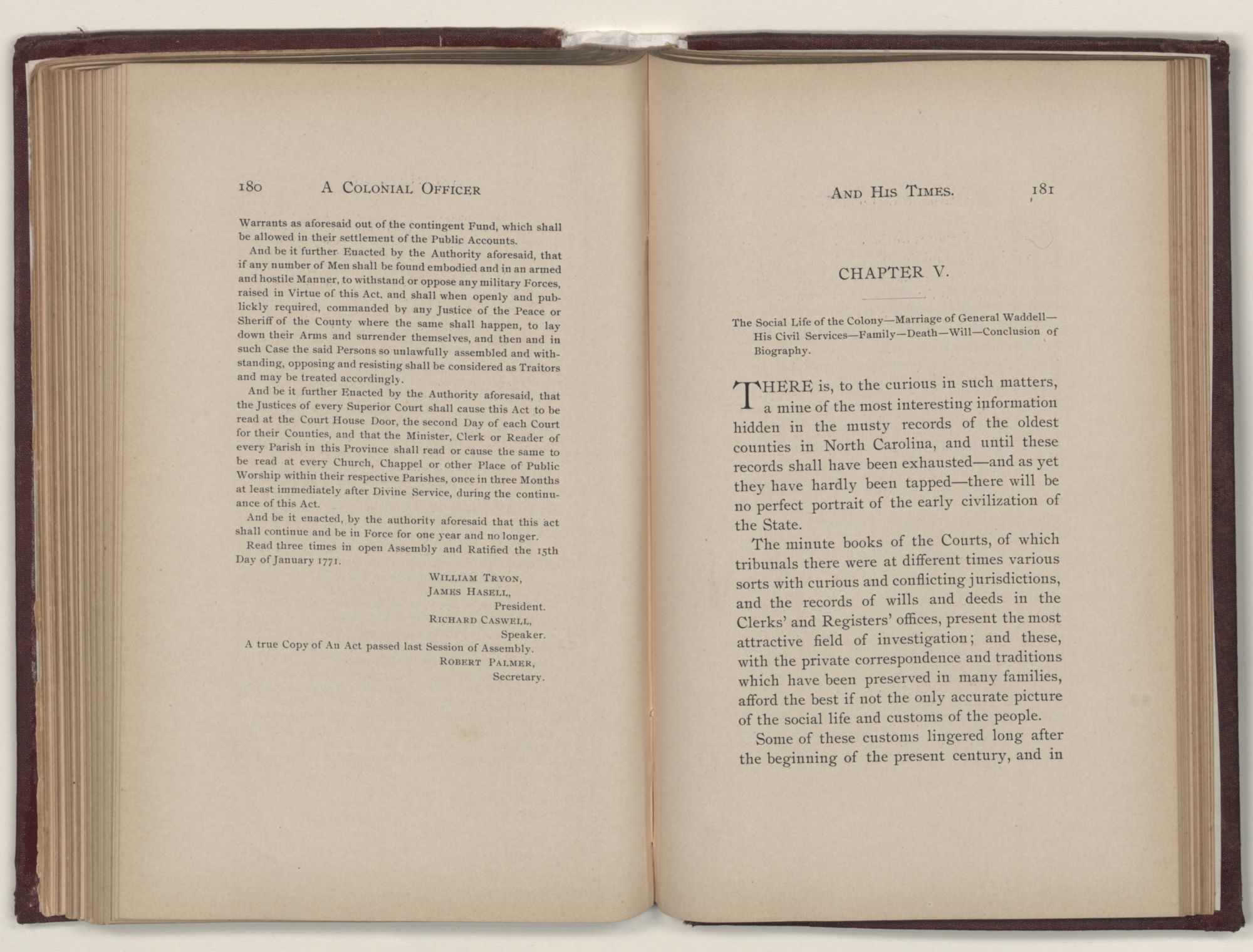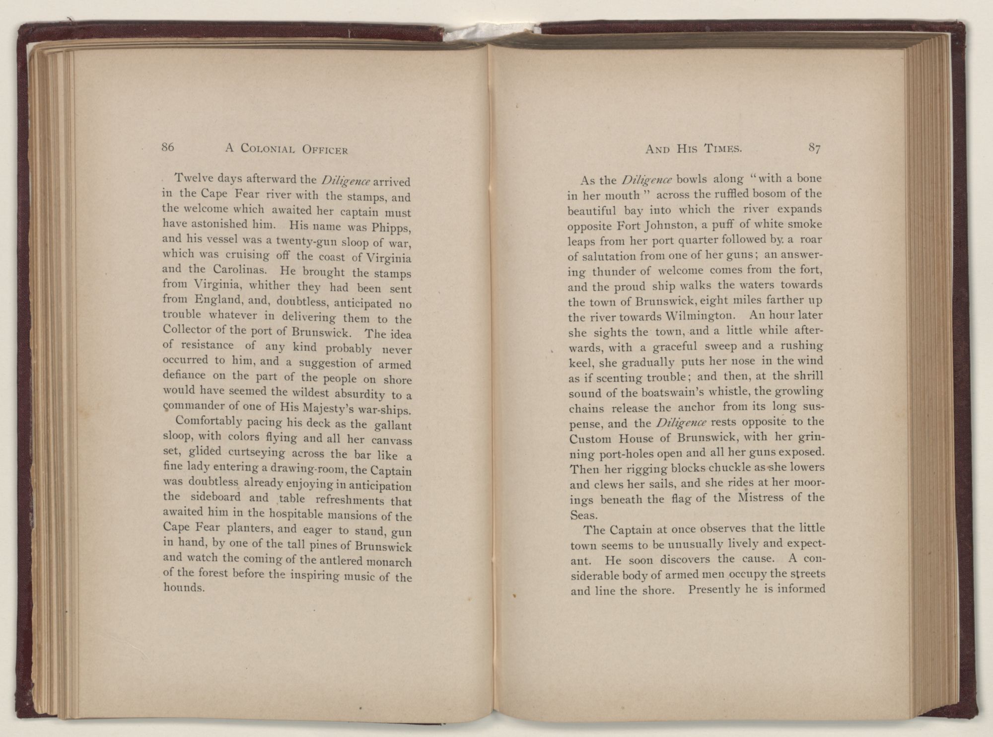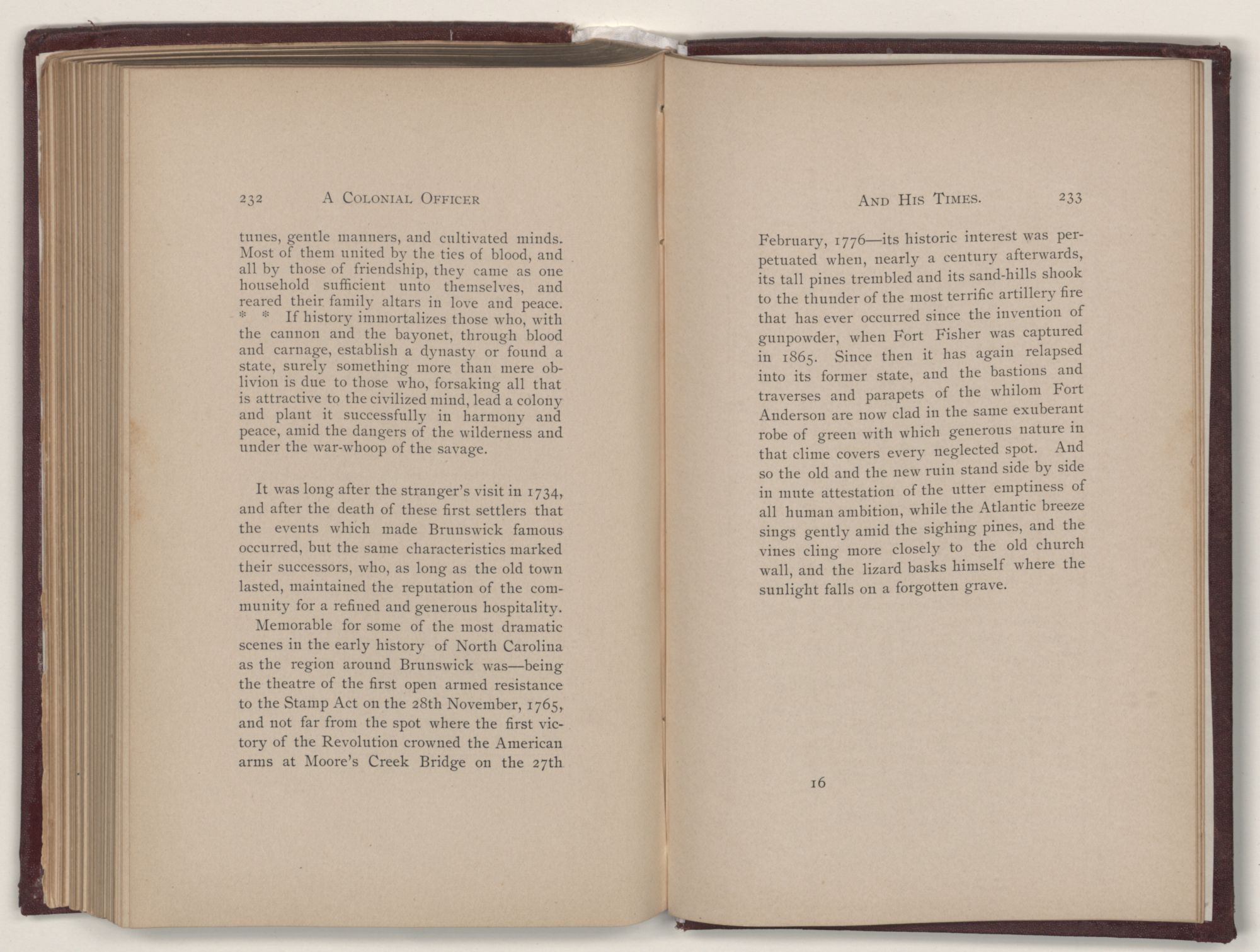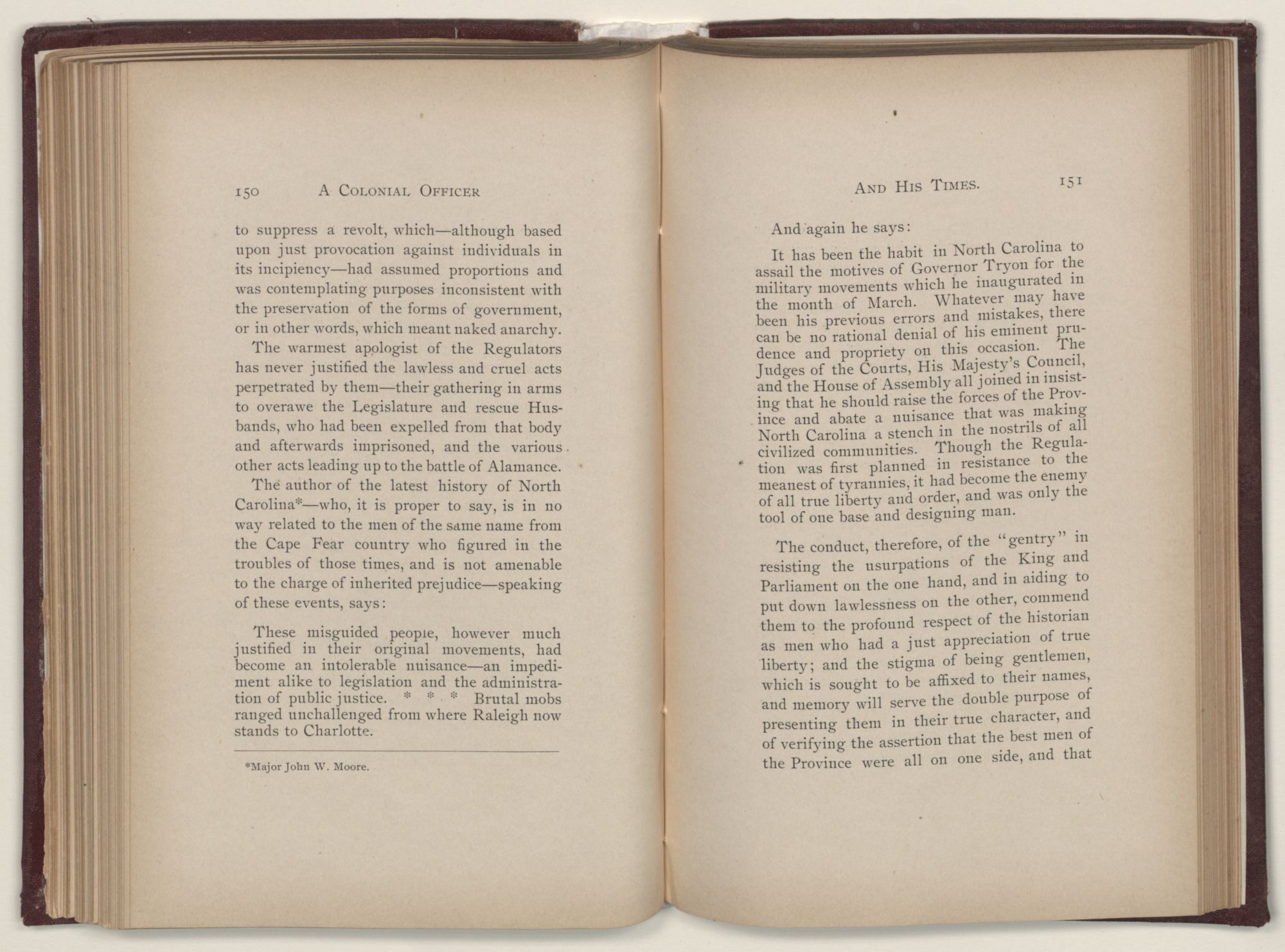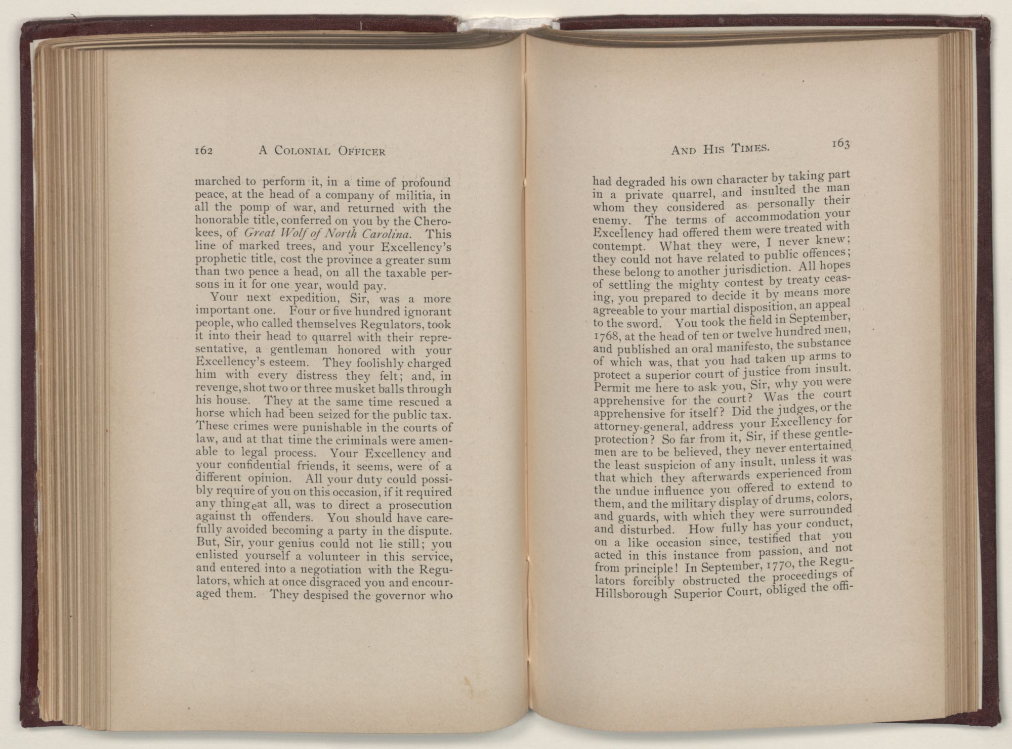 A COLONIAL OFFICER AND HIS TIMES. 1754-1773.A BIOGRAPHICAL SKETCH OF GEN. HUGH WADDELL, OF NORTH CAROLINA.WITH NOTICES OF THE FRENCH AND INDIAN WAR IN THE SOUTHERN COLONIES; THE RESISTANCE TO THE STAMP ACT IN NORTH CAROLINA (WITH COPIES OF ORIGINAL DOCUMENTS NEVER BEFORE PUBLISHED); THE REGULATORS’ WAR; AND AN HISTORICAL SKETCH OF THE FORMER TOWN OF BRUNSWICK, ON THE CAPE FEAR RIVER.BY ALFRED MOORE WADDELL.RALEIGH, N. C.:EDWARDS & BROUGHTON, Publishers.1890.