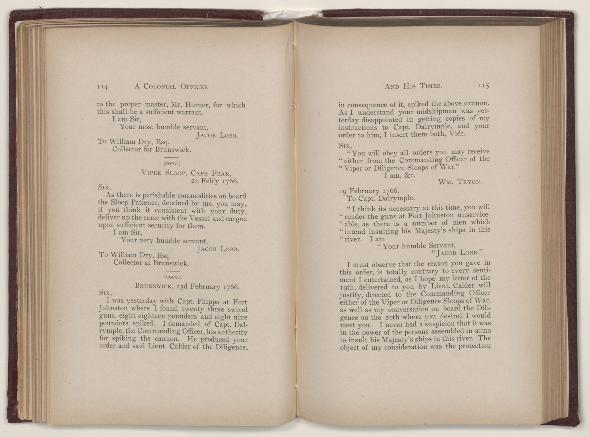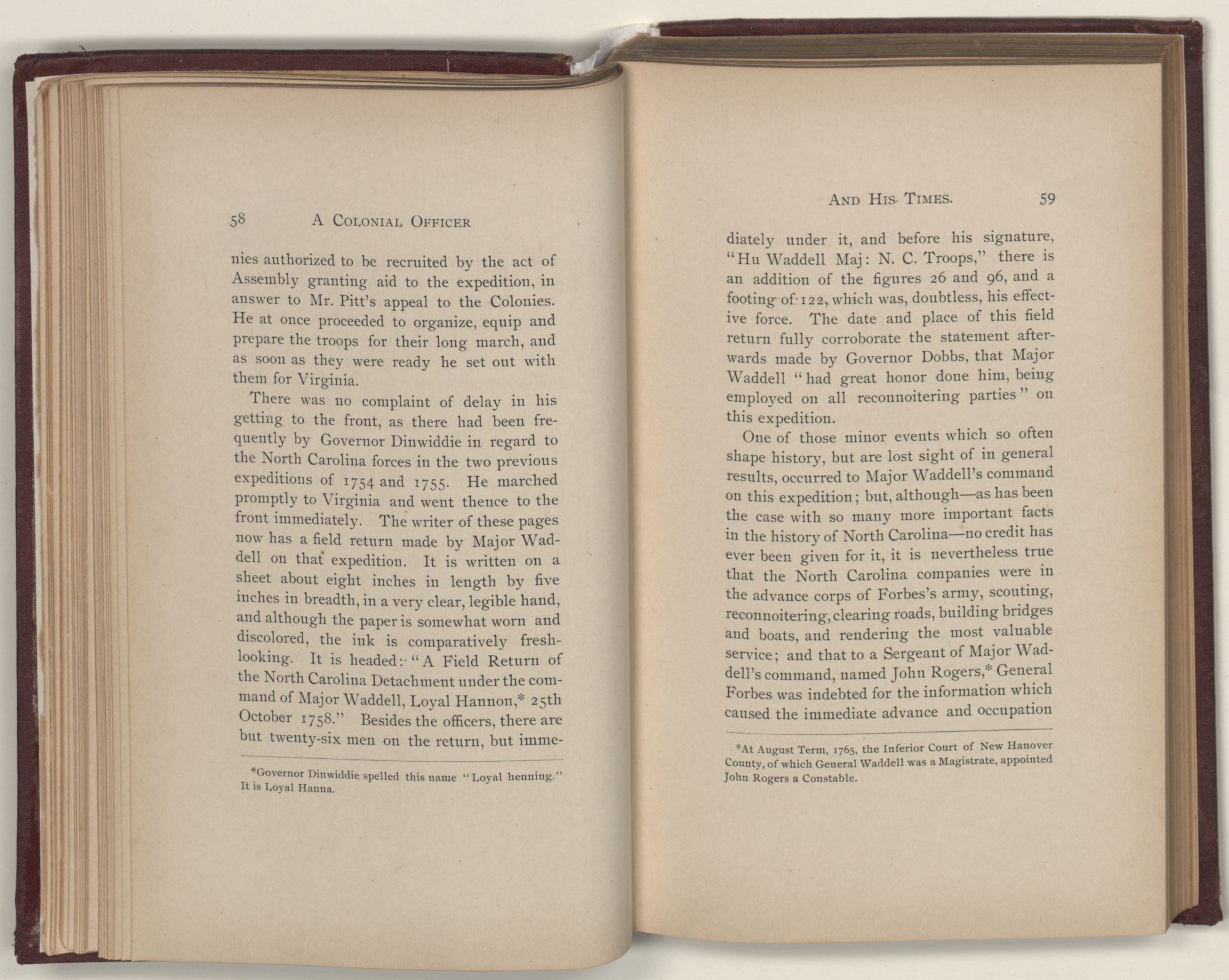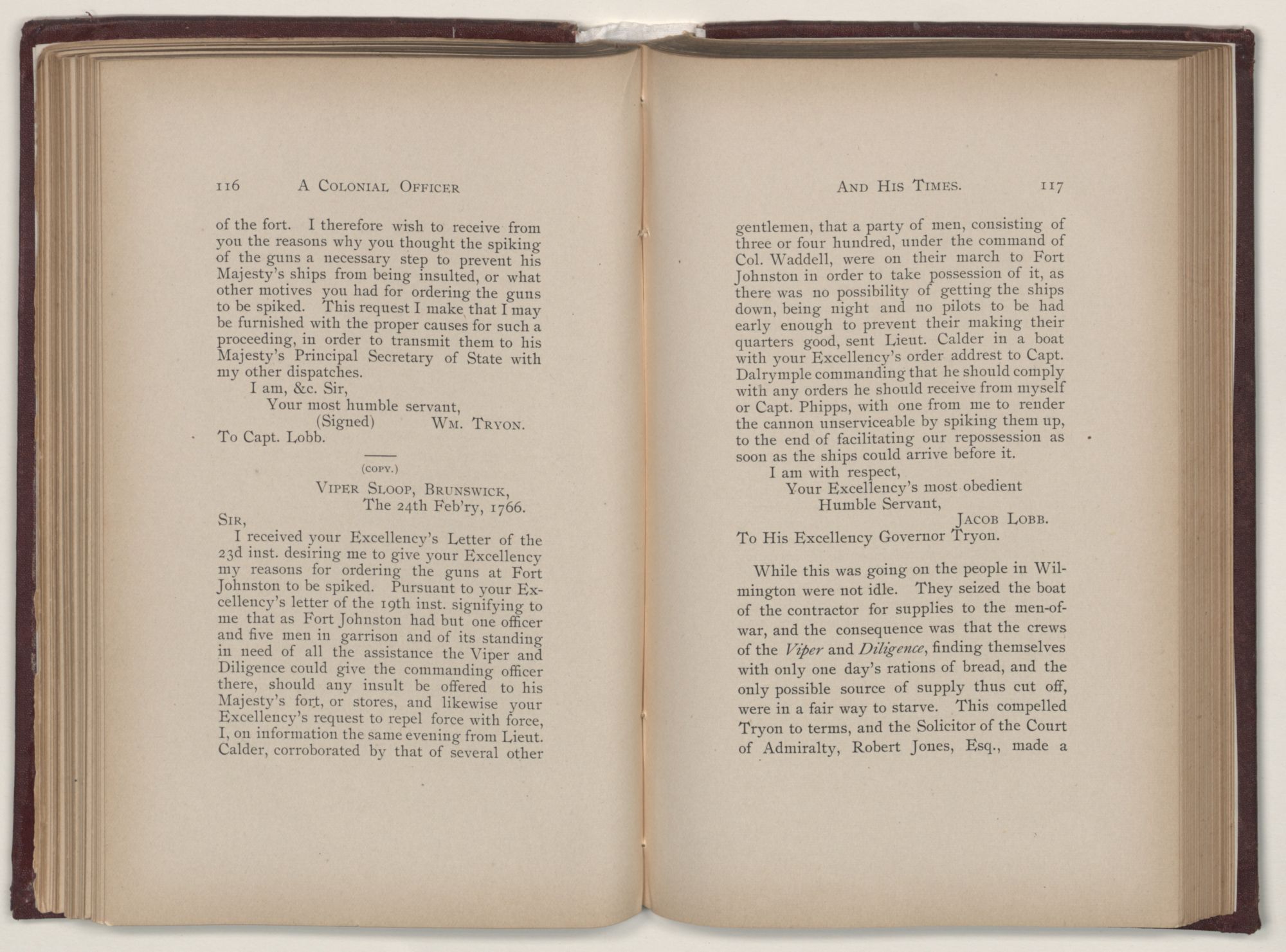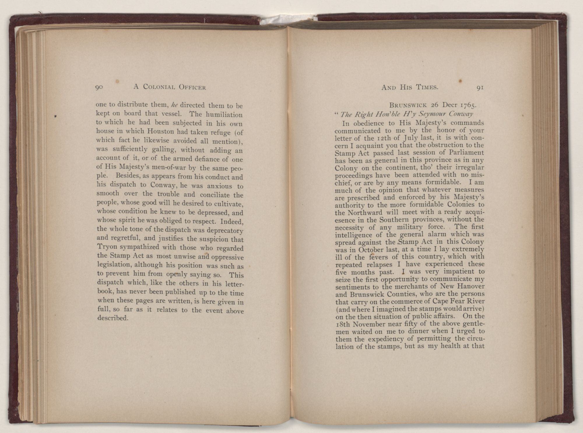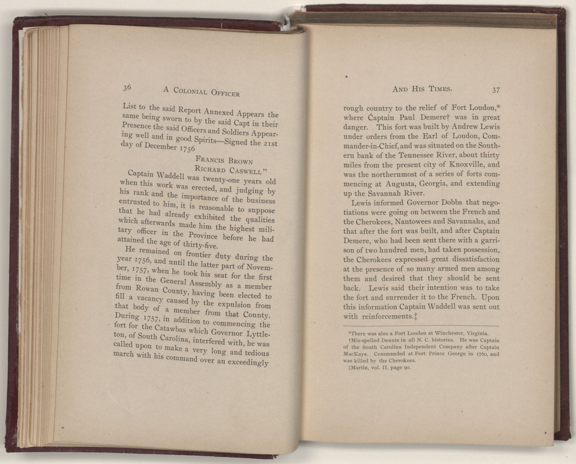 A COLONIAL OFFICER AND HIS TIMES. 1754-1773.A BIOGRAPHICAL SKETCH OF GEN. HUGH WADDELL, OF NORTH CAROLINA.WITH NOTICES OF THE FRENCH AND INDIAN WAR IN THE SOUTHERN COLONIES; THE RESISTANCE TO THE STAMP ACT IN NORTH CAROLINA (WITH COPIES OF ORIGINAL DOCUMENTS NEVER BEFORE PUBLISHED); THE REGULATORS’ WAR; AND AN HISTORICAL SKETCH OF THE FORMER TOWN OF BRUNSWICK, ON THE CAPE FEAR RIVER.BY ALFRED MOORE WADDELL.RALEIGH, N. C.:EDWARDS & BROUGHTON, Publishers.1890.