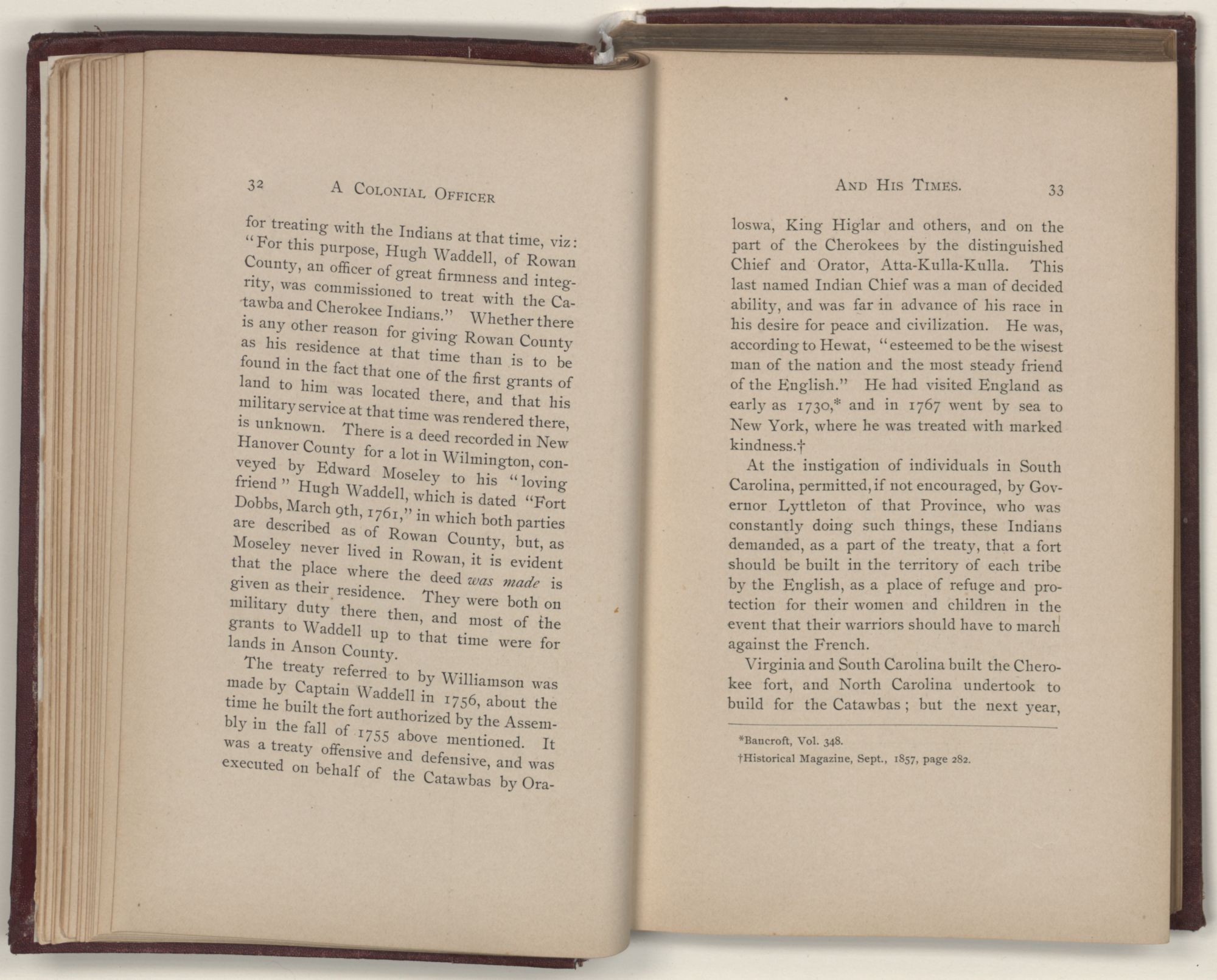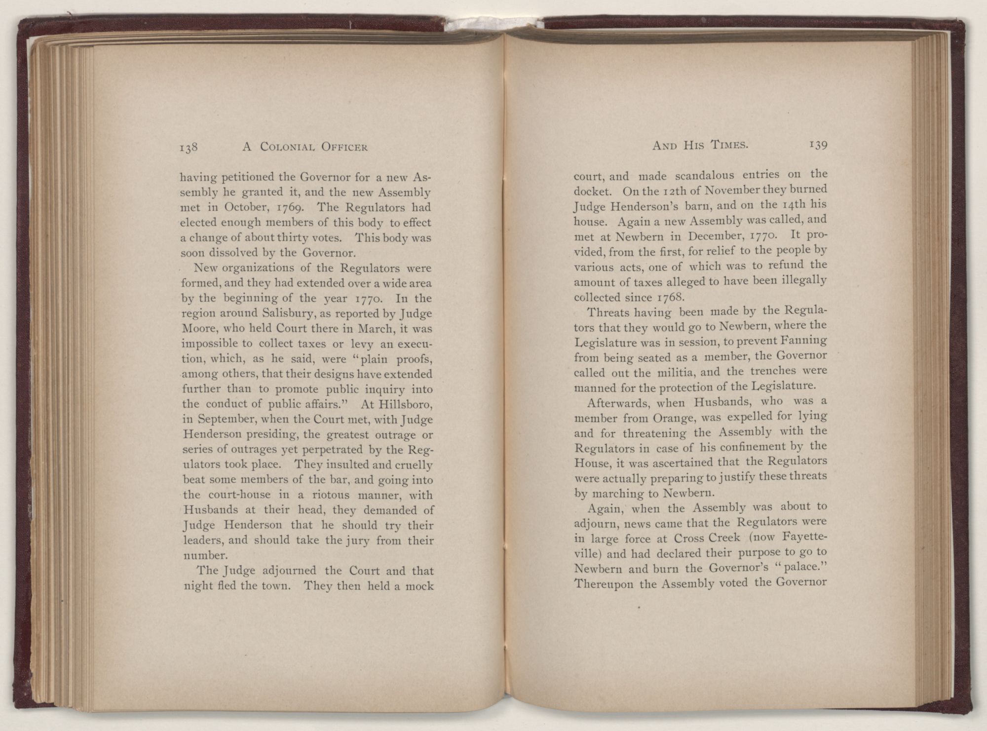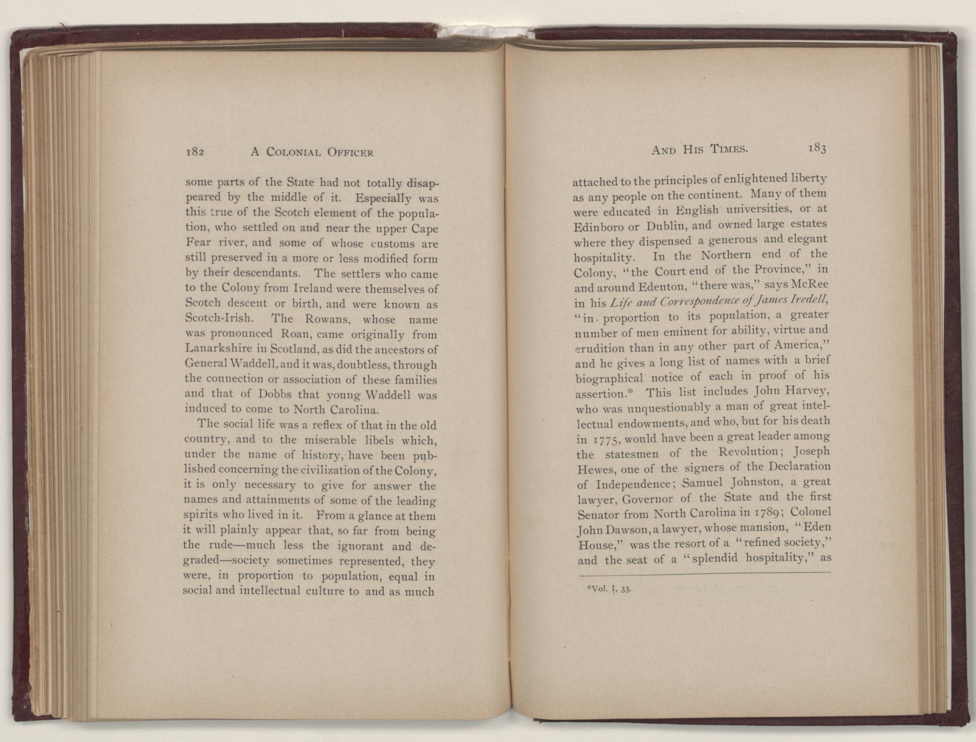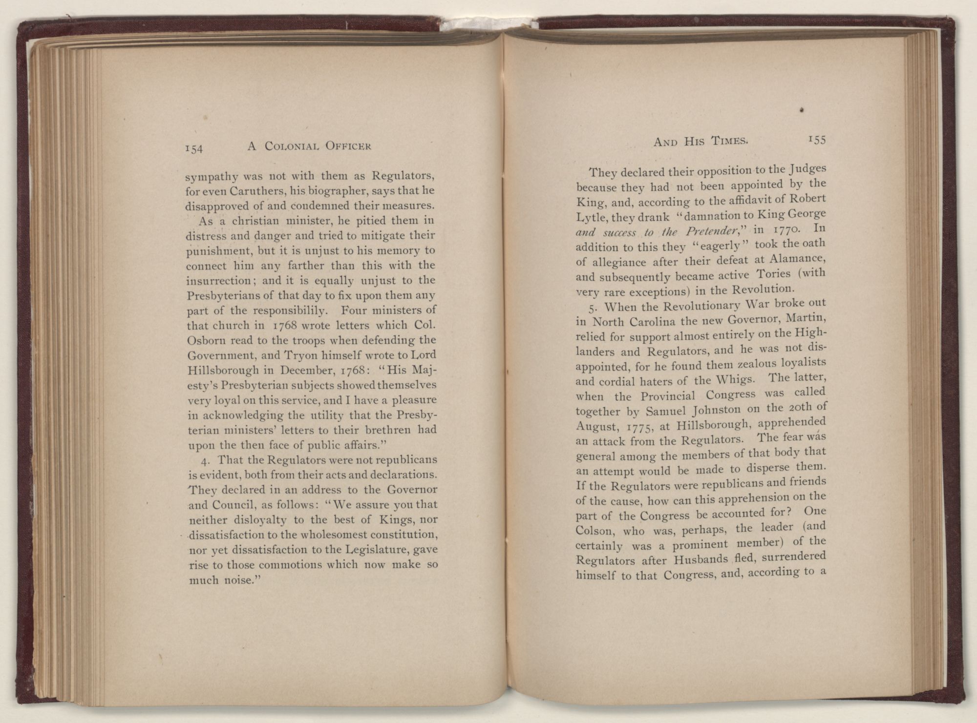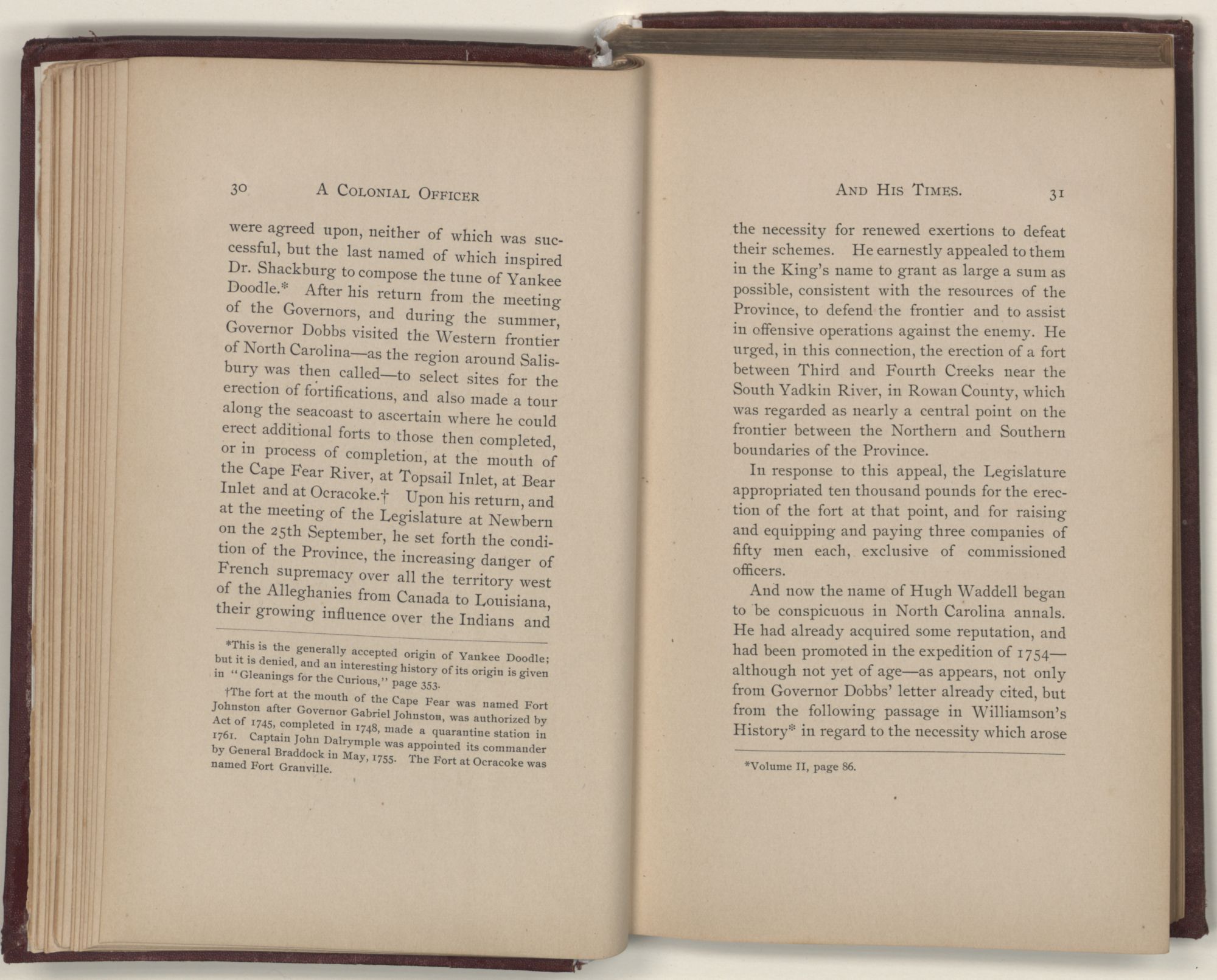A COLONIAL OFFICER AND HIS TIMES. 1754-1773.A BIOGRAPHICAL SKETCH OF GEN. HUGH WADDELL, OF NORTH CAROLINA.WITH NOTICES OF THE FRENCH AND INDIAN WAR IN THE SOUTHERN COLONIES; THE RESISTANCE TO THE STAMP ACT IN NORTH CAROLINA (WITH COPIES OF ORIGINAL DOCUMENTS NEVER BEFORE PUBLISHED); THE REGULATORS’ WAR; AND AN HISTORICAL SKETCH OF THE FORMER TOWN OF BRUNSWICK, ON THE CAPE FEAR RIVER.BY ALFRED MOORE WADDELL.RALEIGH, N. C.:EDWARDS & BROUGHTON, Publishers.1890.