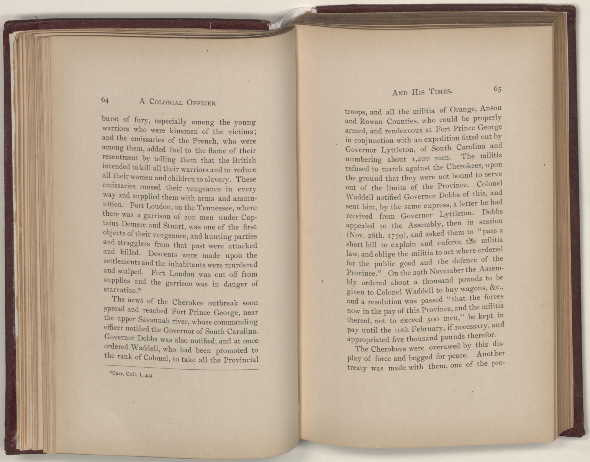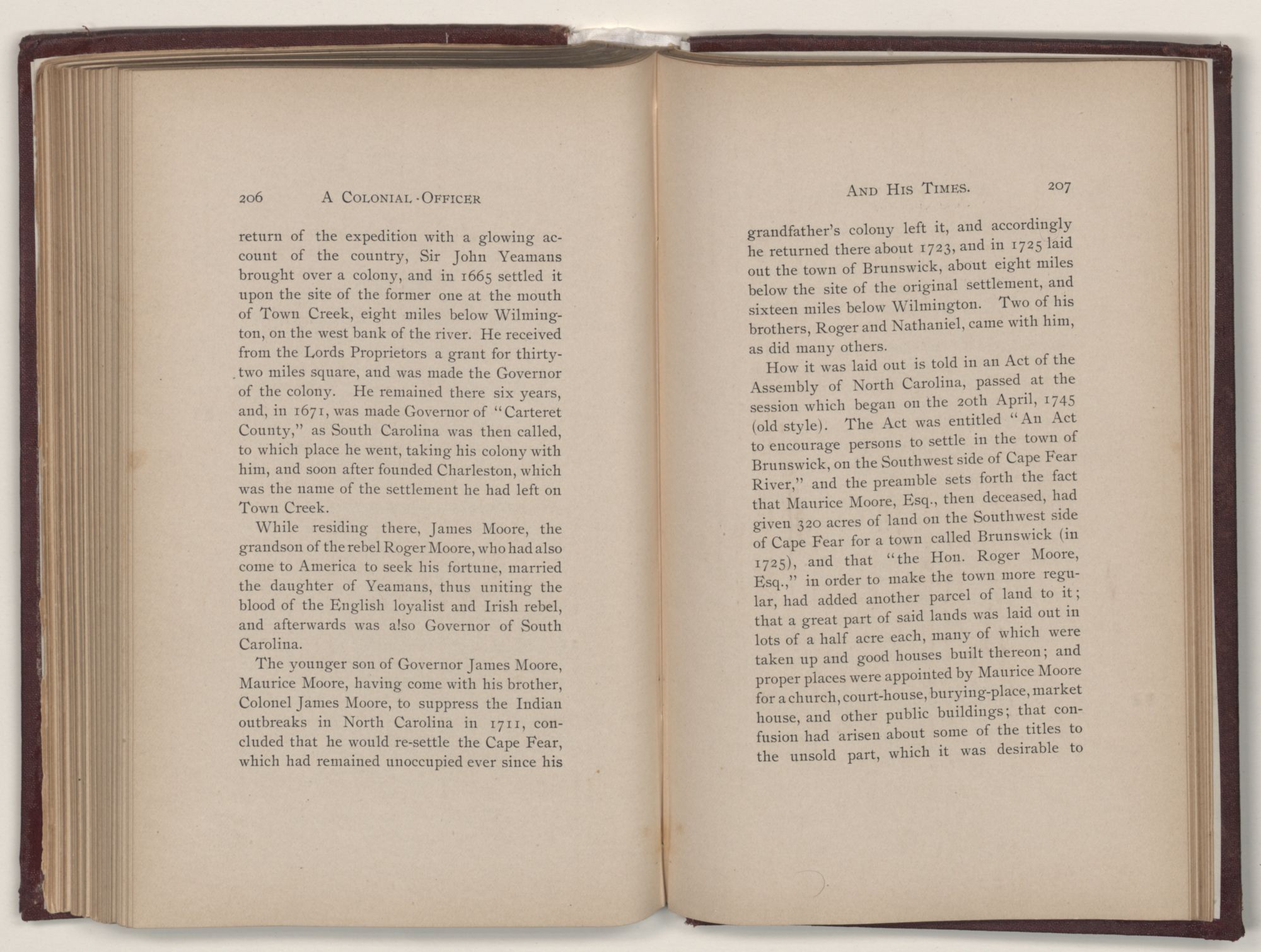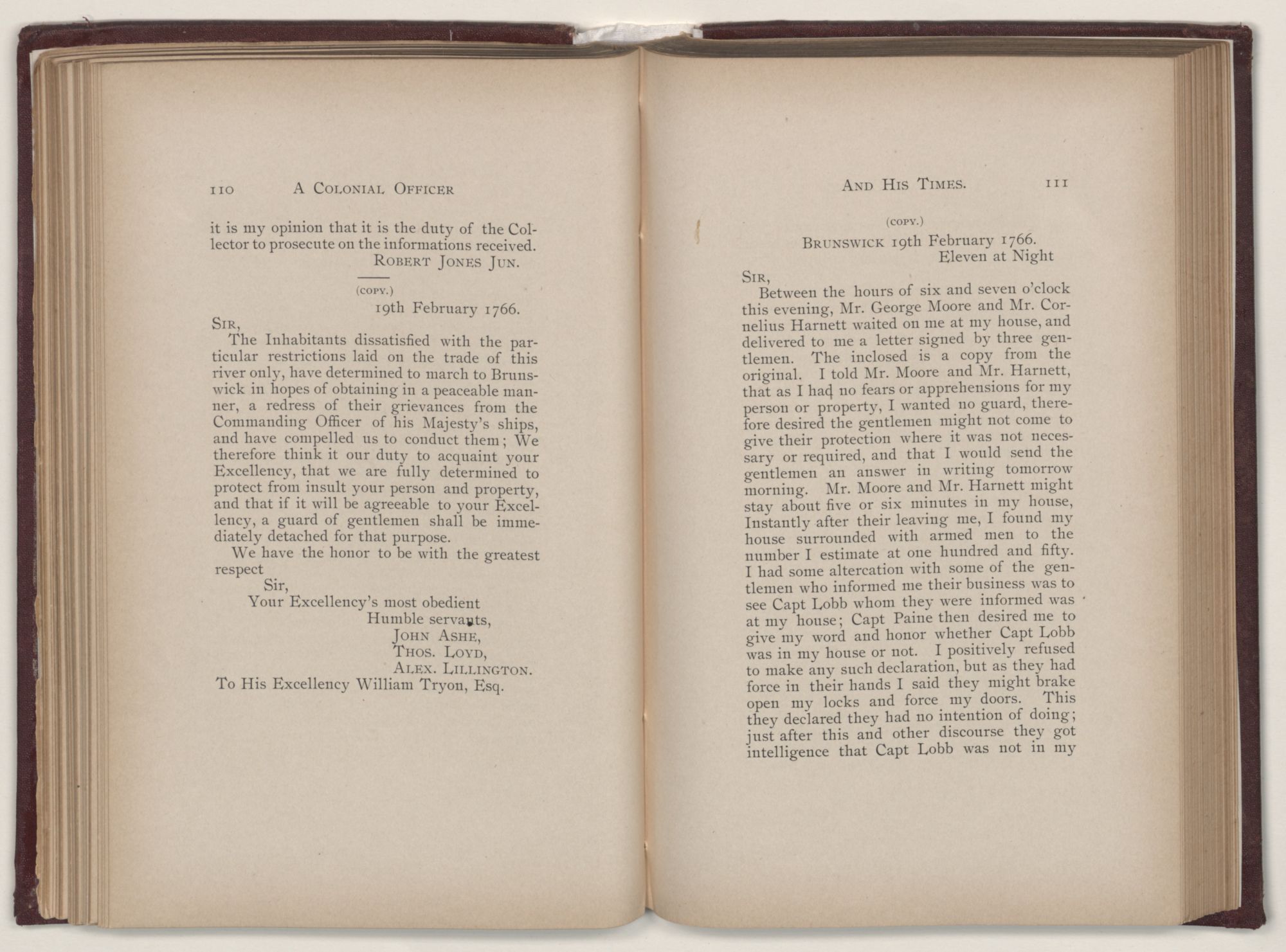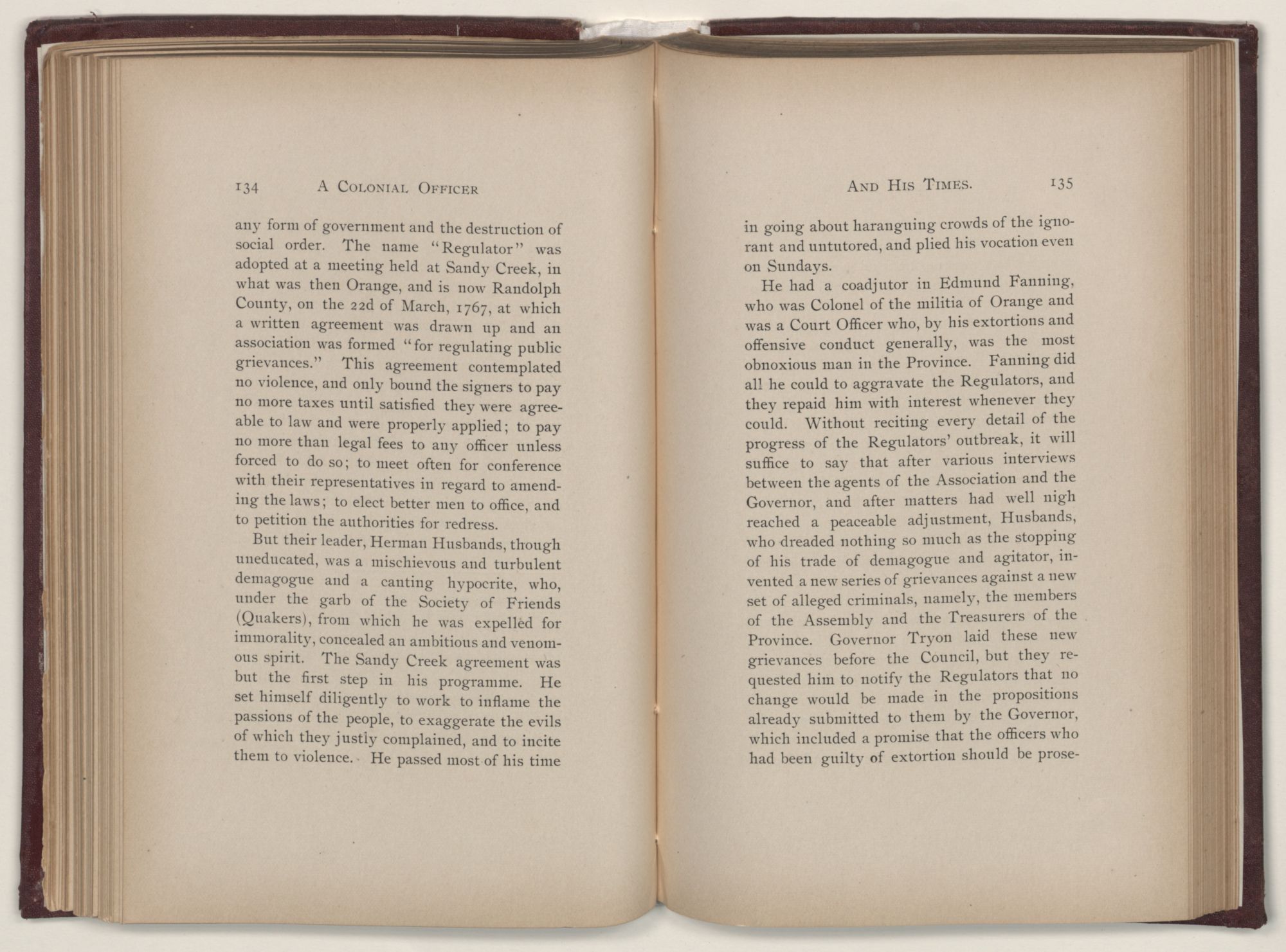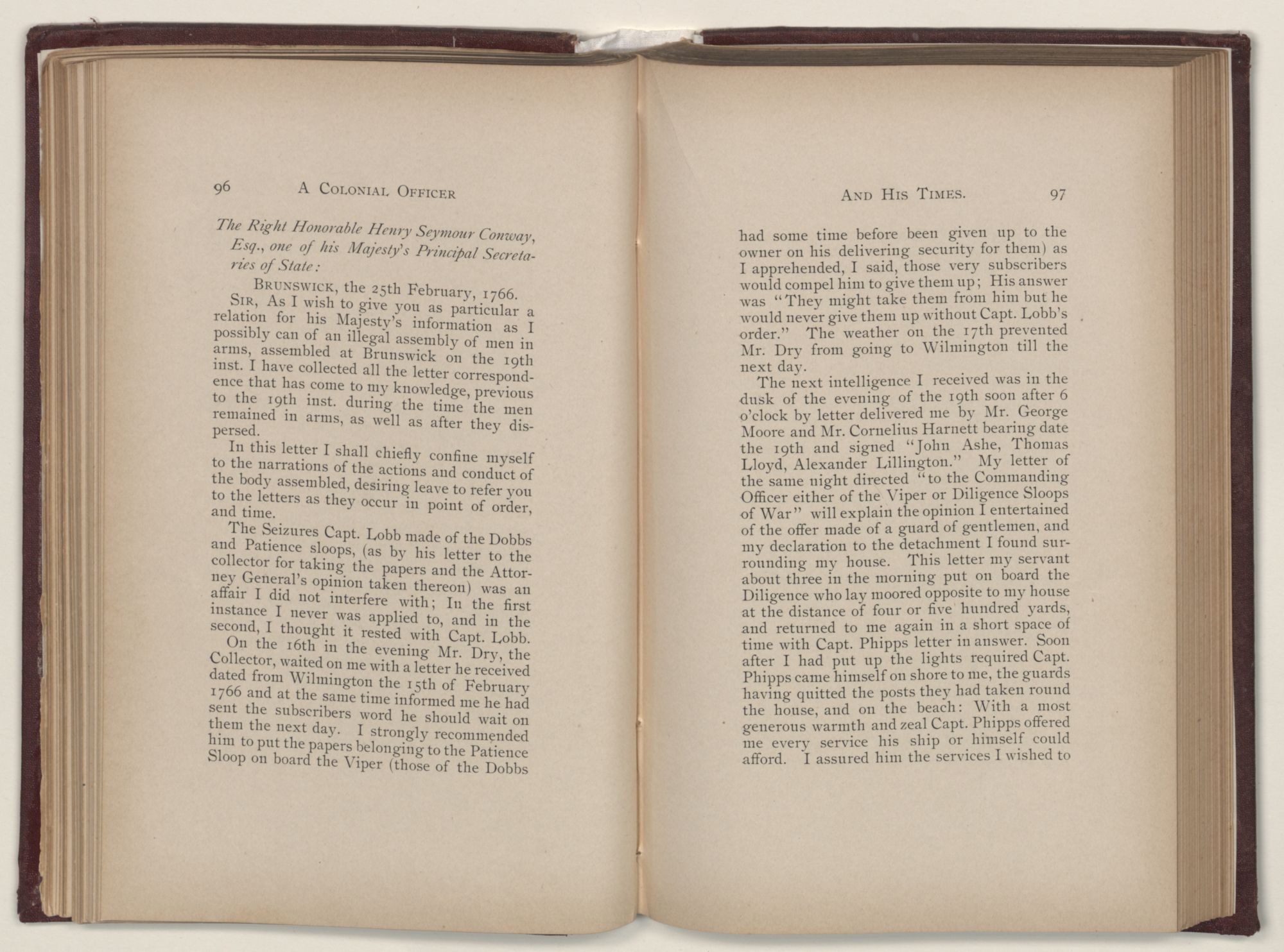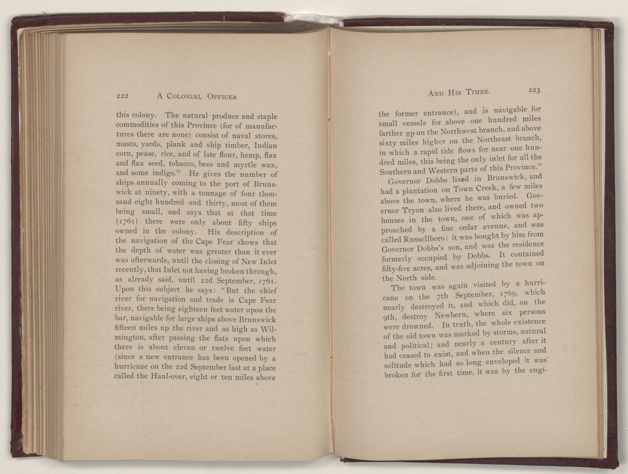 A COLONIAL OFFICER AND HIS TIMES. 1754-1773.A BIOGRAPHICAL SKETCH OF GEN. HUGH WADDELL, OF NORTH CAROLINA.WITH NOTICES OF THE FRENCH AND INDIAN WAR IN THE SOUTHERN COLONIES; THE RESISTANCE TO THE STAMP ACT IN NORTH CAROLINA (WITH COPIES OF ORIGINAL DOCUMENTS NEVER BEFORE PUBLISHED); THE REGULATORS’ WAR; AND AN HISTORICAL SKETCH OF THE FORMER TOWN OF BRUNSWICK, ON THE CAPE FEAR RIVER.BY ALFRED MOORE WADDELL.RALEIGH, N. C.:EDWARDS & BROUGHTON, Publishers.1890.
