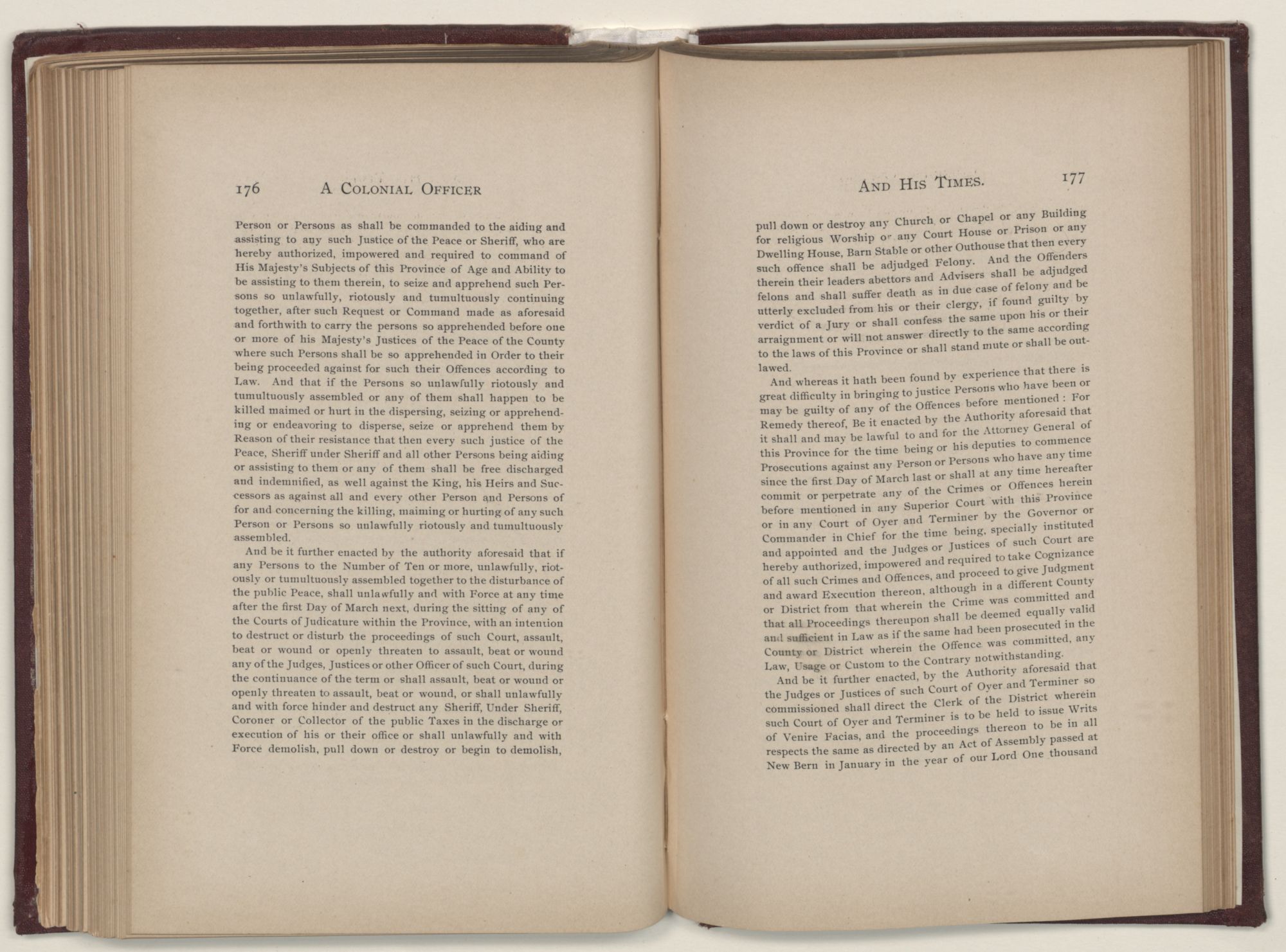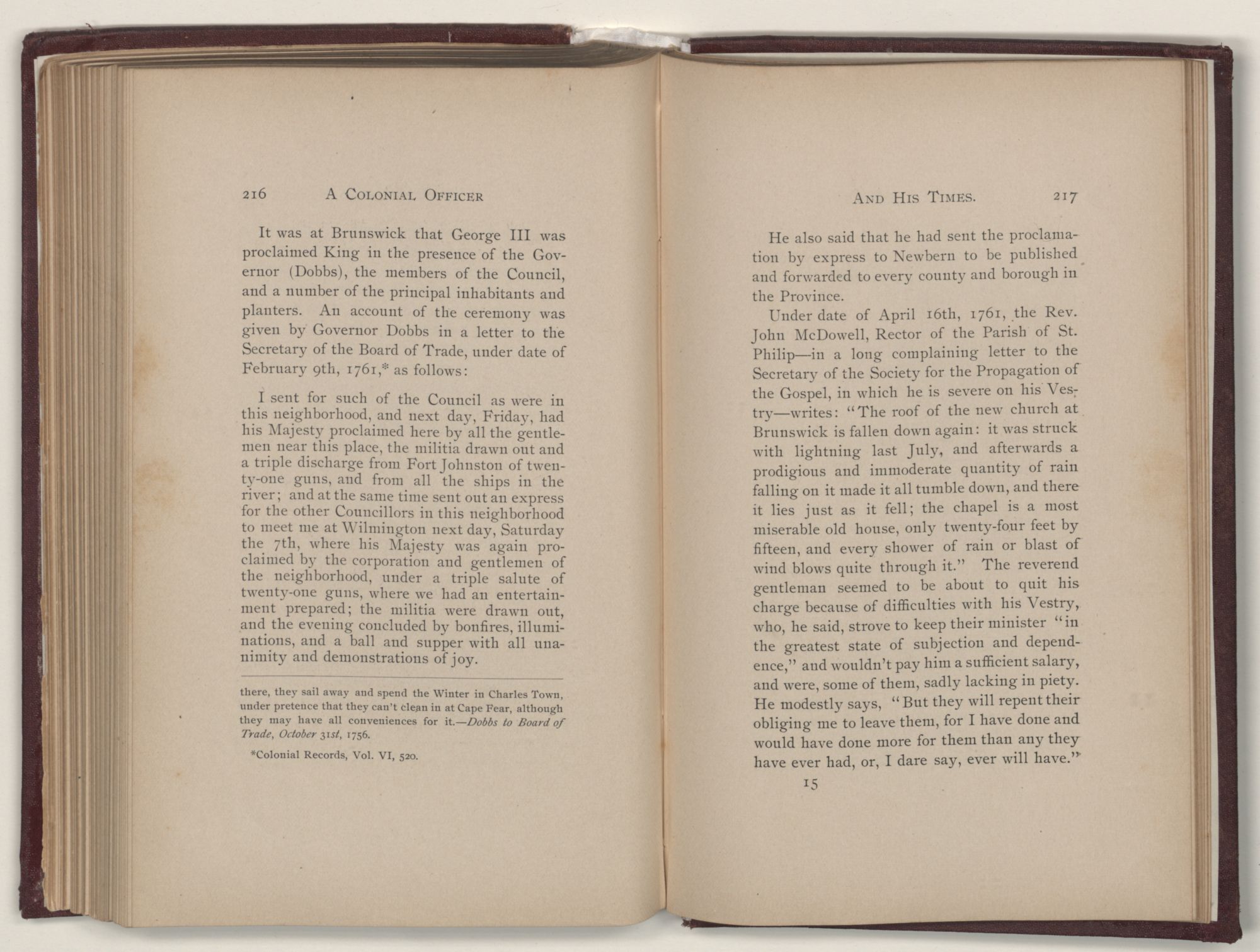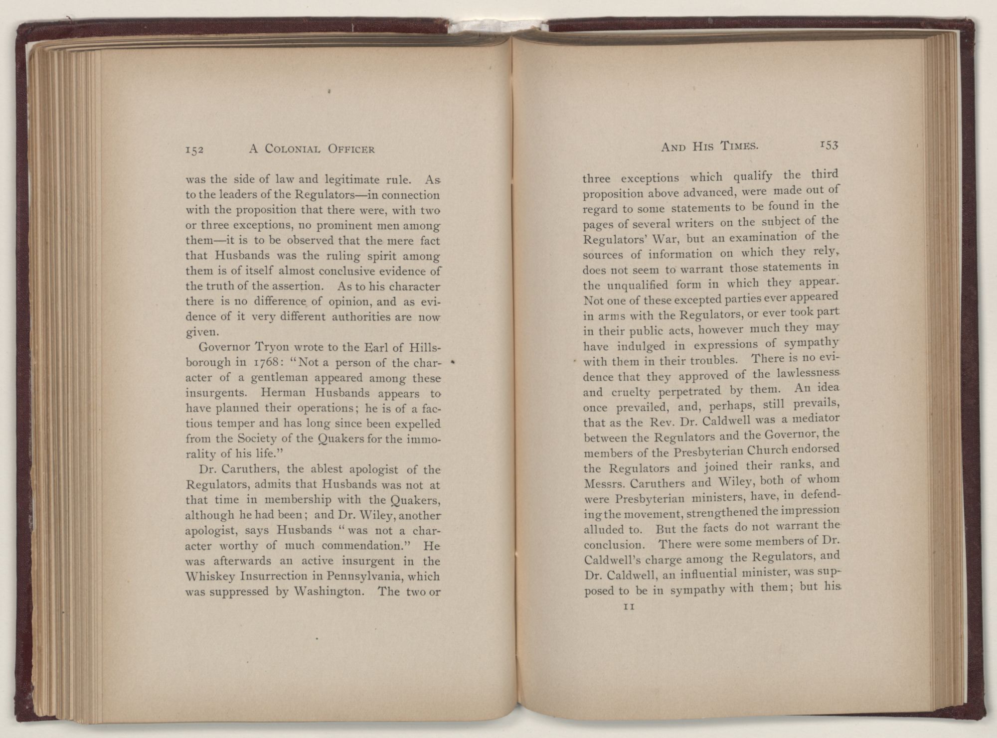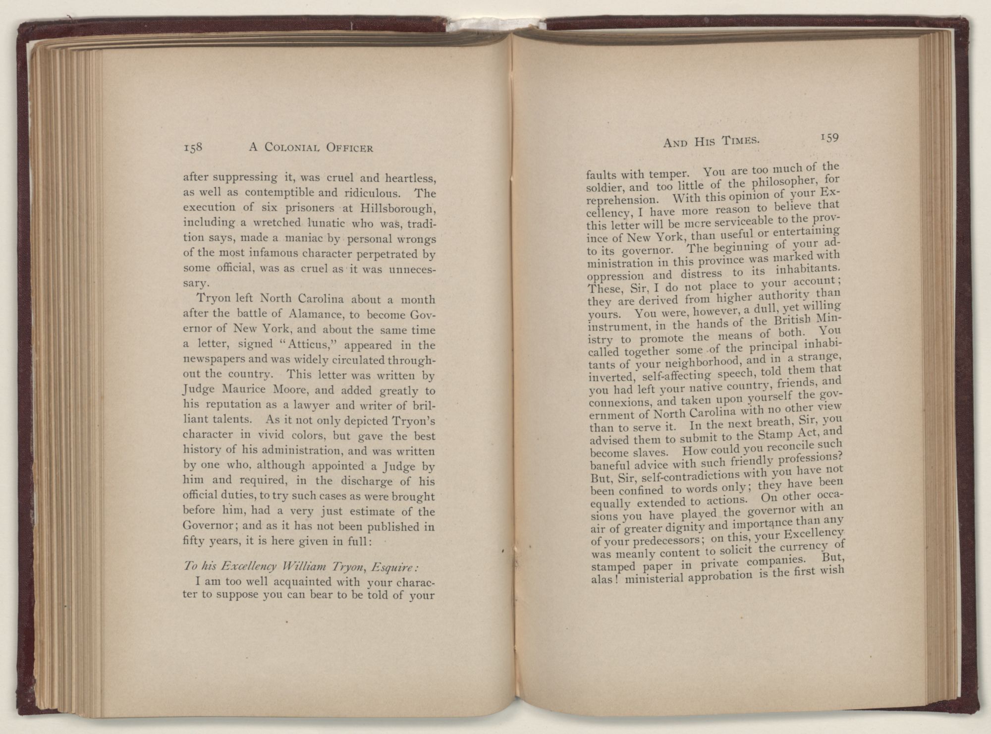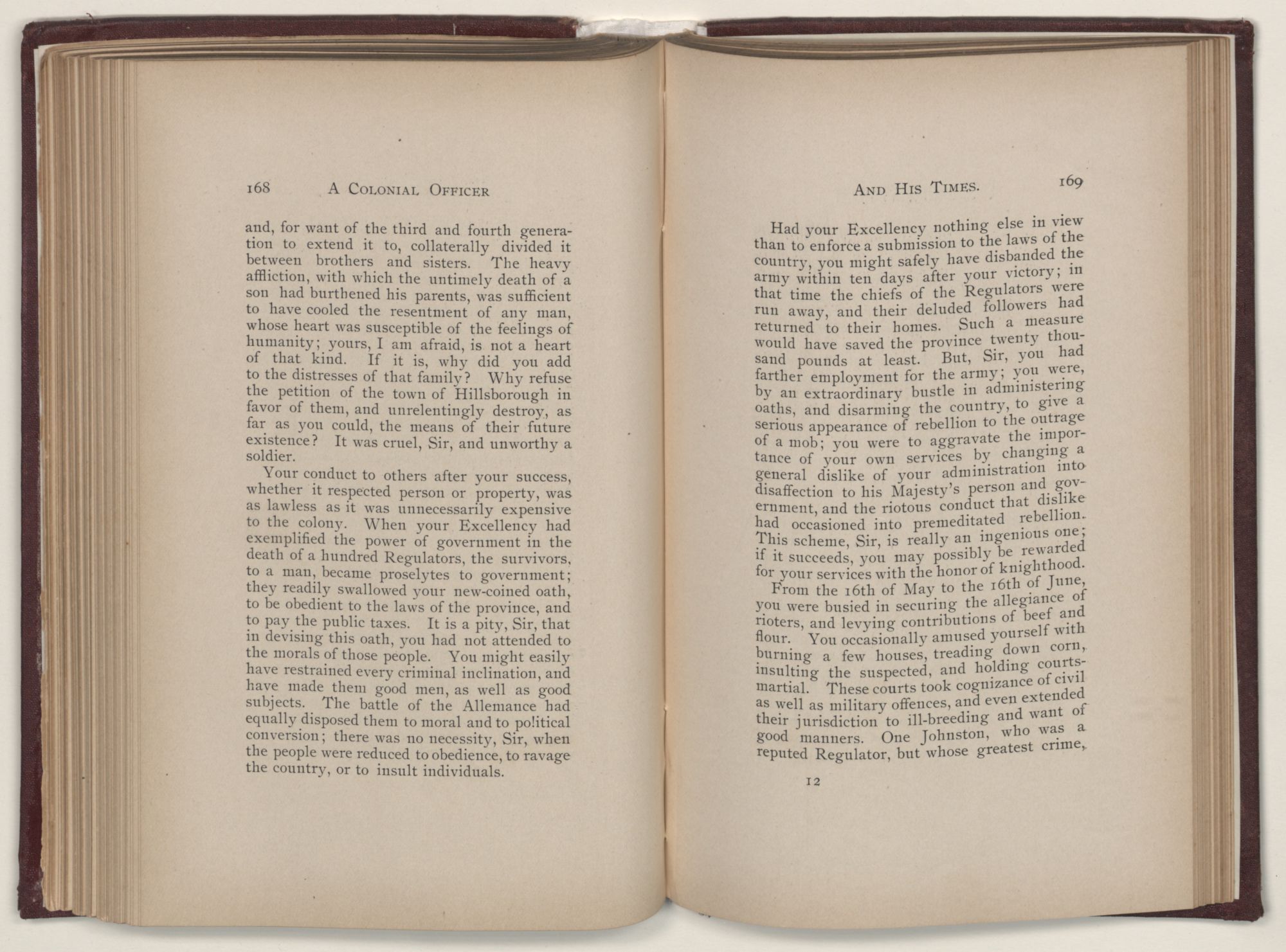 A COLONIAL OFFICER AND HIS TIMES. 1754-1773.A BIOGRAPHICAL SKETCH OF GEN. HUGH WADDELL, OF NORTH CAROLINA.WITH NOTICES OF THE FRENCH AND INDIAN WAR IN THE SOUTHERN COLONIES; THE RESISTANCE TO THE STAMP ACT IN NORTH CAROLINA (WITH COPIES OF ORIGINAL DOCUMENTS NEVER BEFORE PUBLISHED); THE REGULATORS’ WAR; AND AN HISTORICAL SKETCH OF THE FORMER TOWN OF BRUNSWICK, ON THE CAPE FEAR RIVER.BY ALFRED MOORE WADDELL.RALEIGH, N. C.:EDWARDS & BROUGHTON, Publishers.1890.