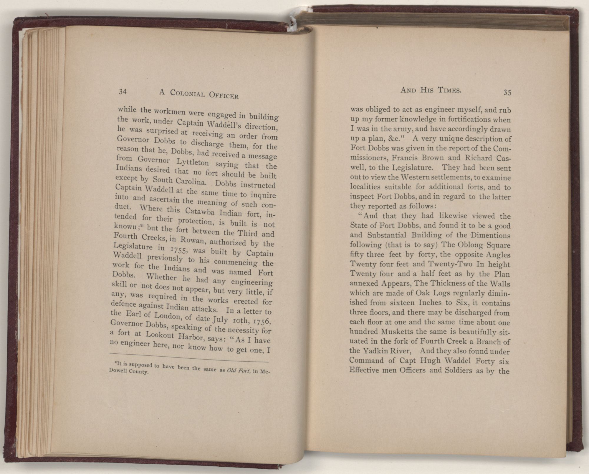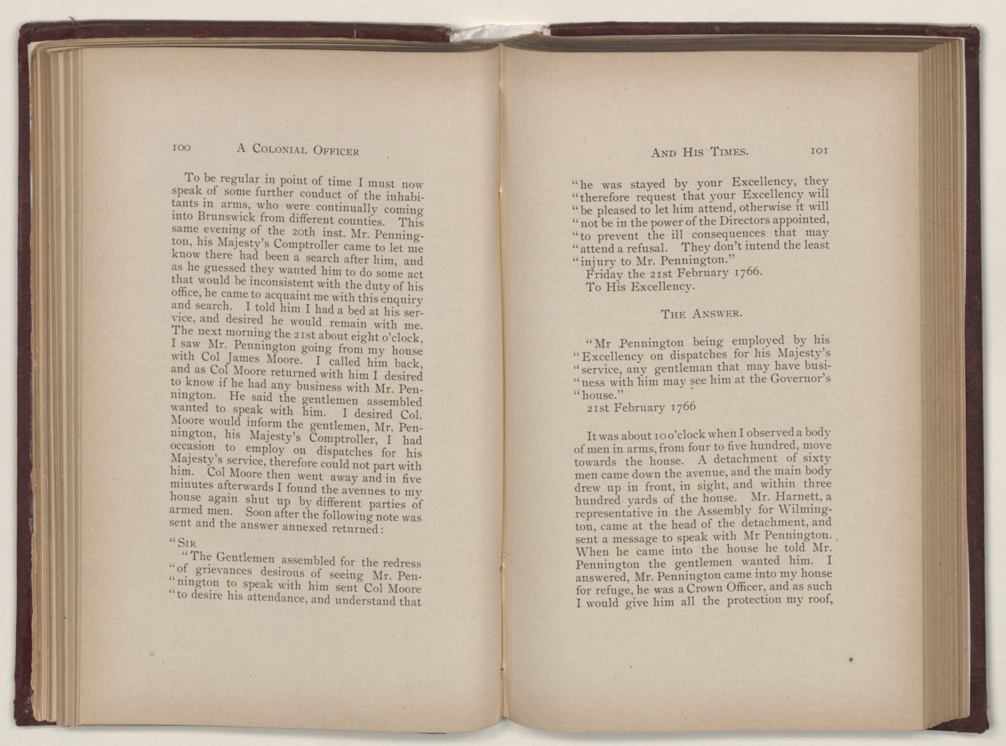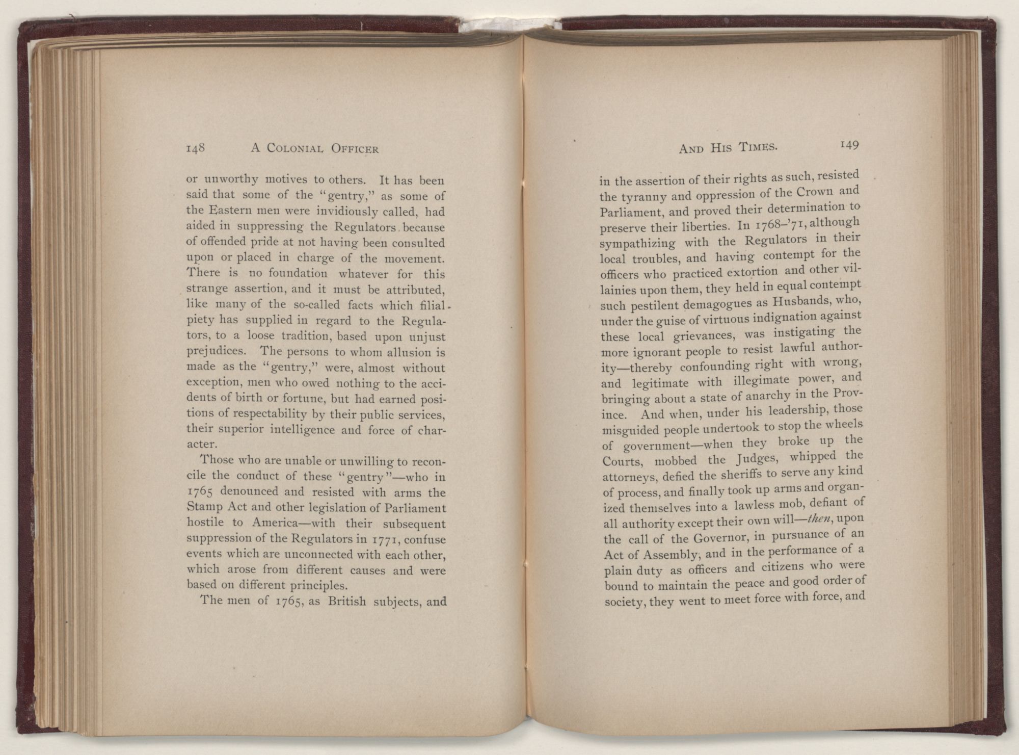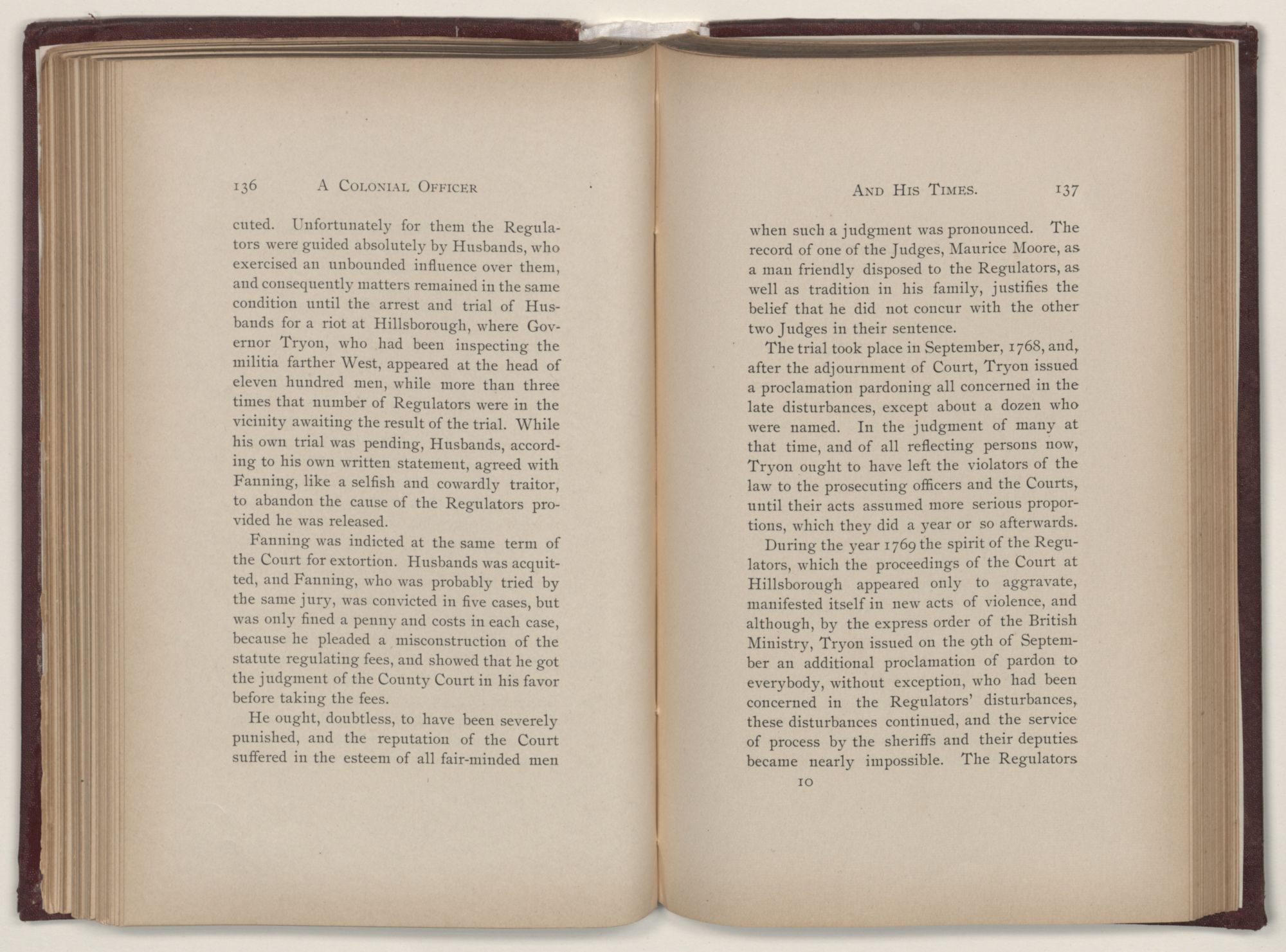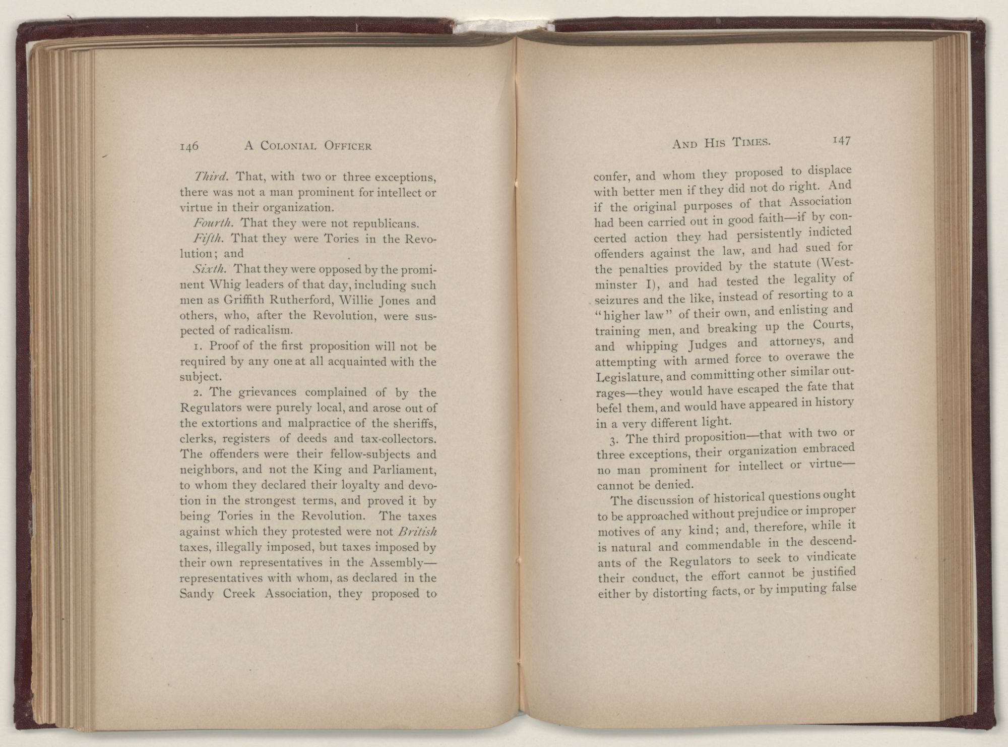 A COLONIAL OFFICER AND HIS TIMES. 1754-1773.A BIOGRAPHICAL SKETCH OF GEN. HUGH WADDELL, OF NORTH CAROLINA.WITH NOTICES OF THE FRENCH AND INDIAN WAR IN THE SOUTHERN COLONIES; THE RESISTANCE TO THE STAMP ACT IN NORTH CAROLINA (WITH COPIES OF ORIGINAL DOCUMENTS NEVER BEFORE PUBLISHED); THE REGULATORS’ WAR; AND AN HISTORICAL SKETCH OF THE FORMER TOWN OF BRUNSWICK, ON THE CAPE FEAR RIVER.BY ALFRED MOORE WADDELL.RALEIGH, N. C.:EDWARDS & BROUGHTON, Publishers.1890.