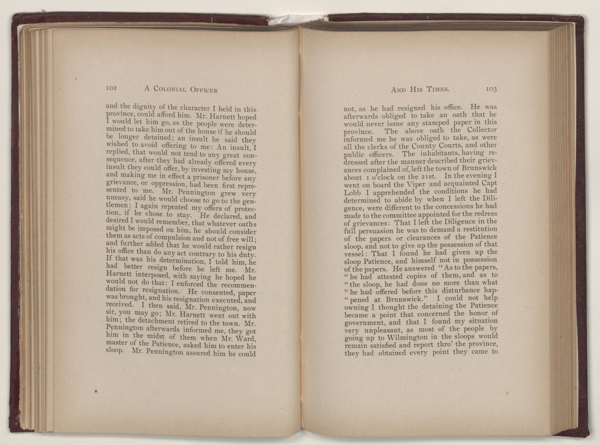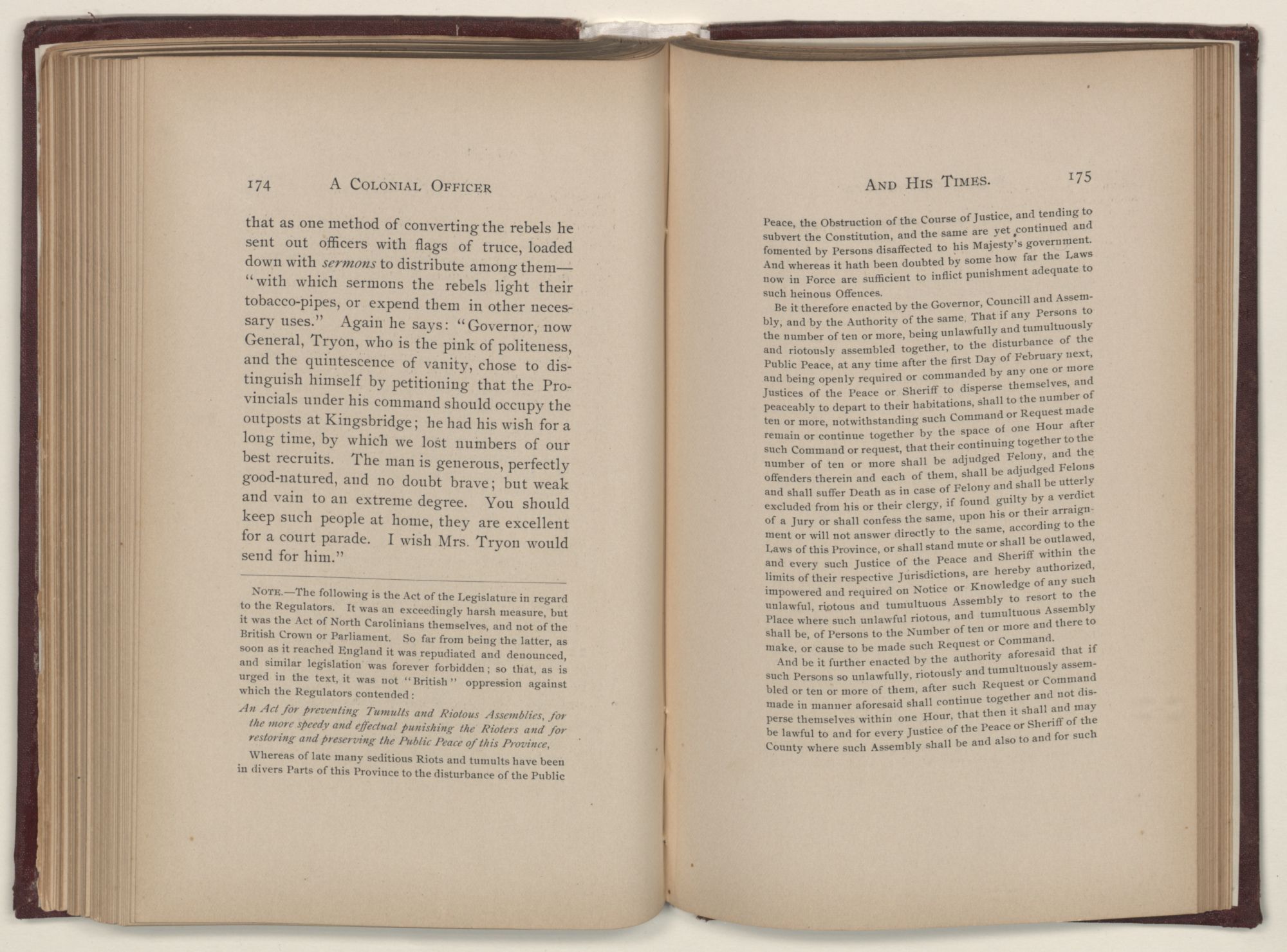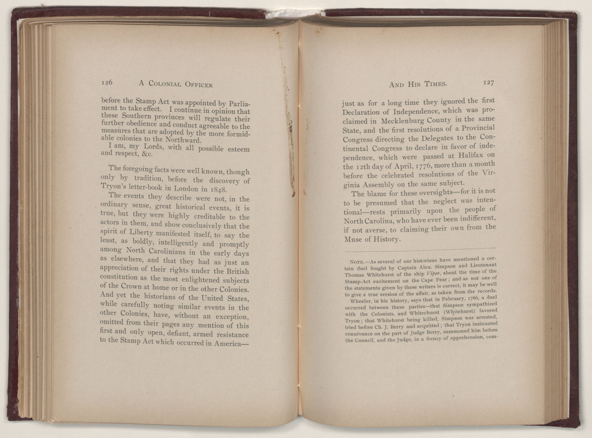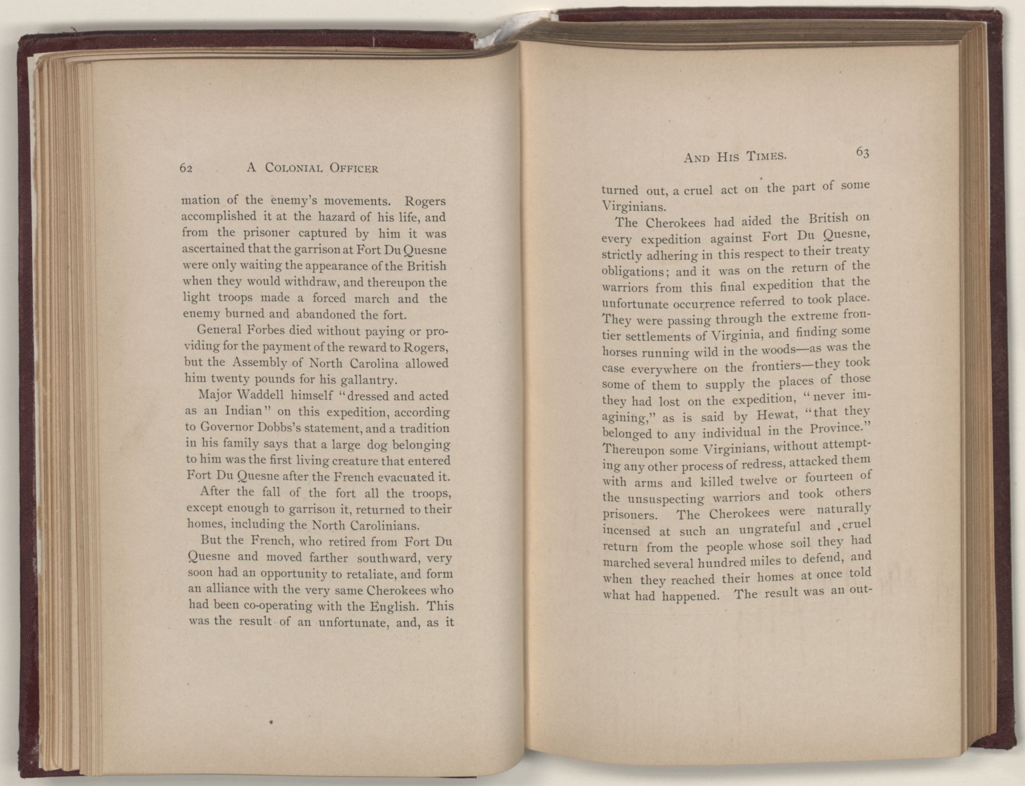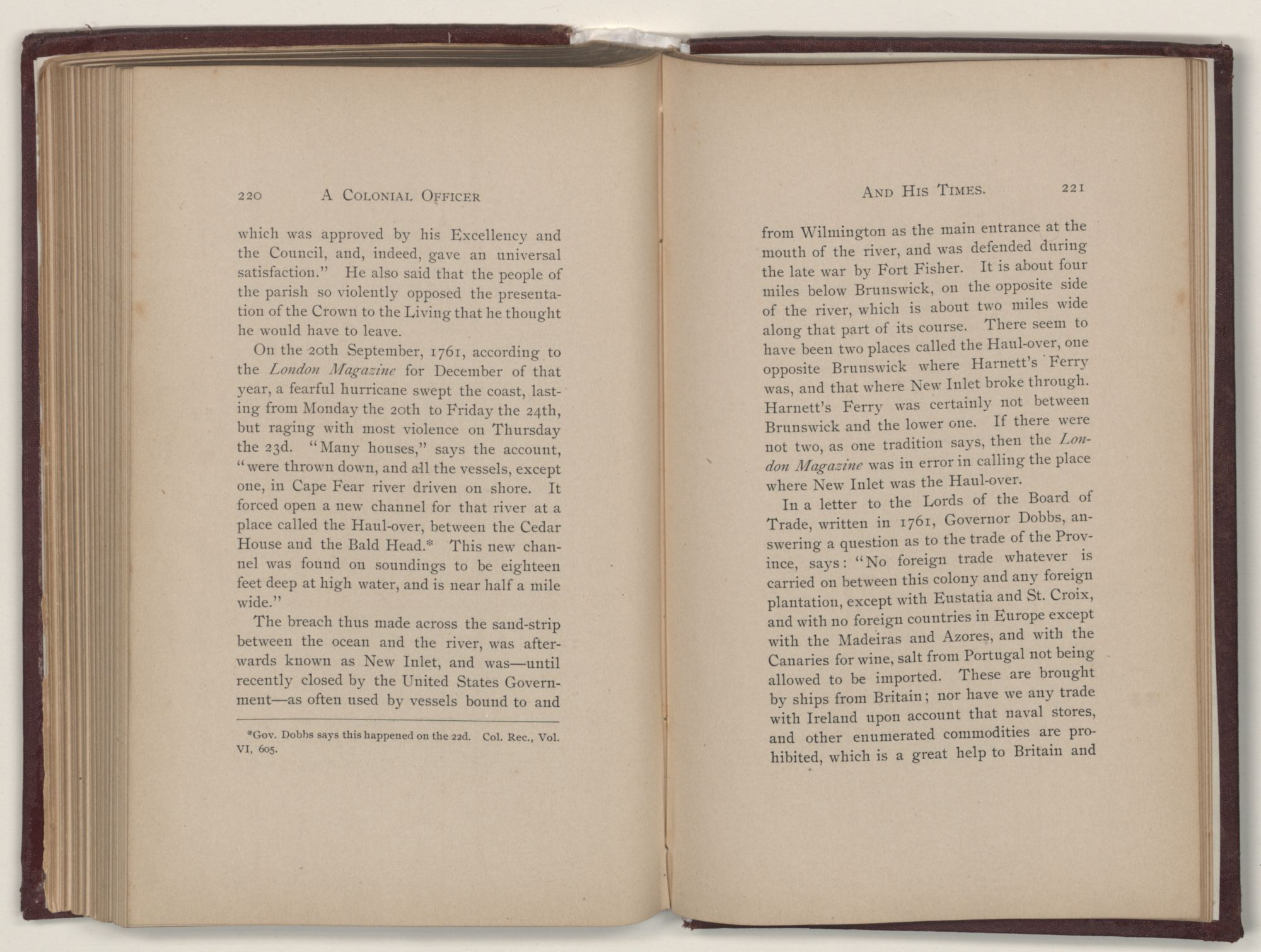 A COLONIAL OFFICER AND HIS TIMES. 1754-1773.A BIOGRAPHICAL SKETCH OF GEN. HUGH WADDELL, OF NORTH CAROLINA.WITH NOTICES OF THE FRENCH AND INDIAN WAR IN THE SOUTHERN COLONIES; THE RESISTANCE TO THE STAMP ACT IN NORTH CAROLINA (WITH COPIES OF ORIGINAL DOCUMENTS NEVER BEFORE PUBLISHED); THE REGULATORS’ WAR; AND AN HISTORICAL SKETCH OF THE FORMER TOWN OF BRUNSWICK, ON THE CAPE FEAR RIVER.BY ALFRED MOORE WADDELL.RALEIGH, N. C.:EDWARDS & BROUGHTON, Publishers.1890.