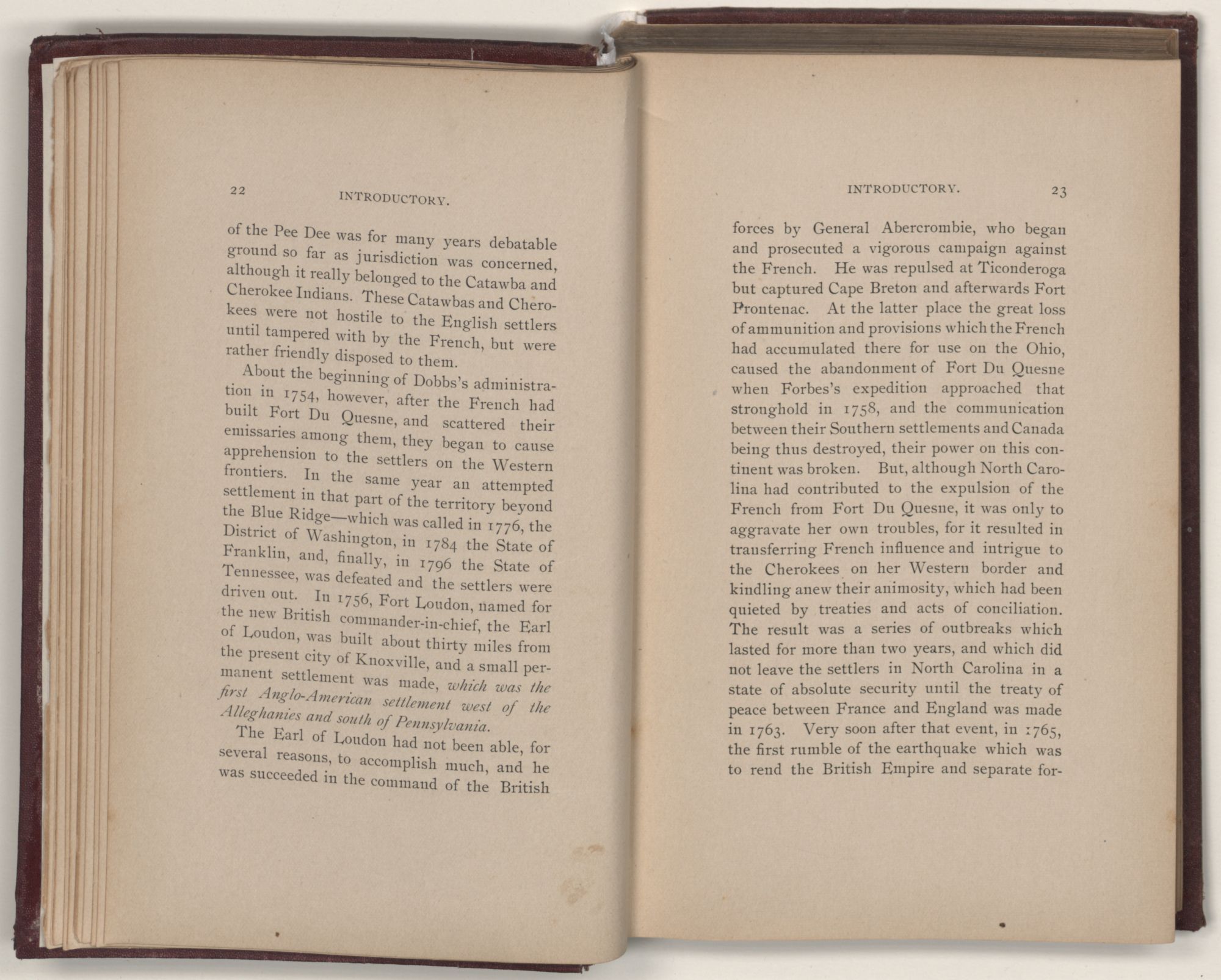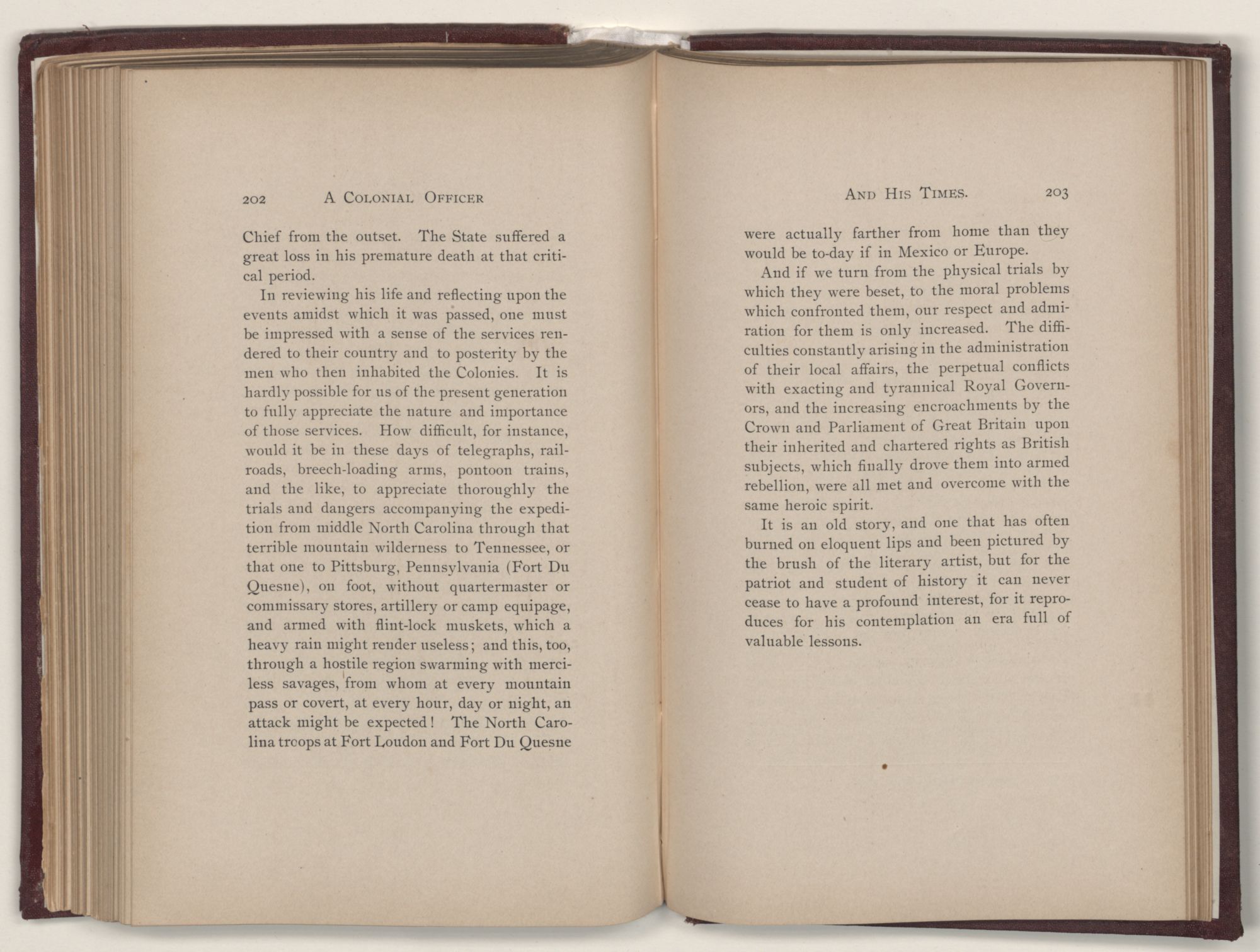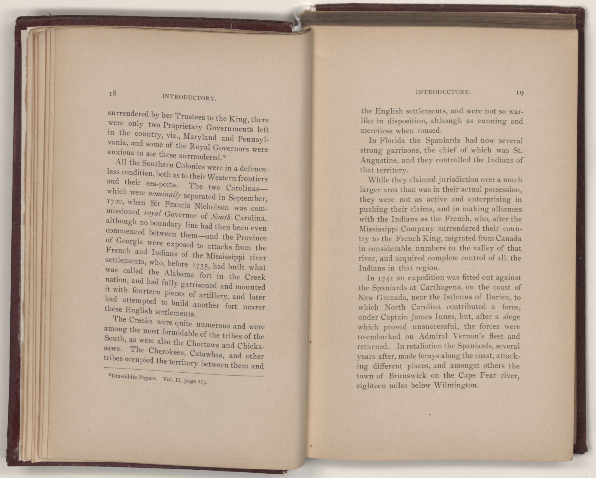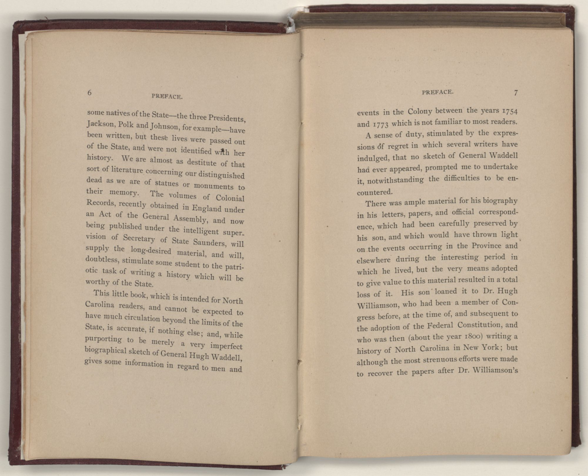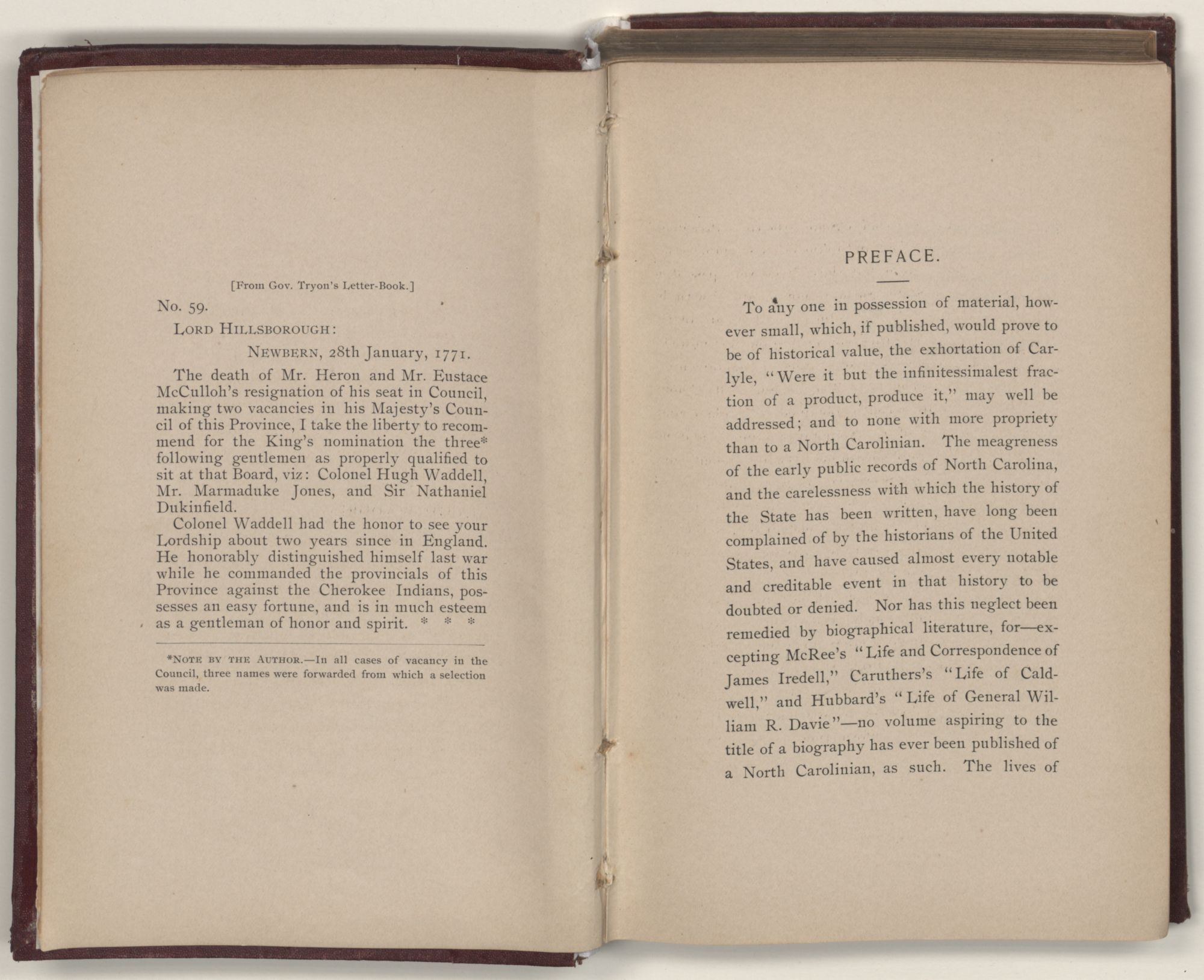 To any one in possession of material, however small, which, if published, would prove to be of historical value, the exhortation of Carlyle, “Were it but the infinitessimalest fraction of a product, produce it,” may well be addressed; and to none with more propriety than to a North Carolinian. The meagreness of the early public records of North Carolina, and the carelessness with which the history of the State has been written, have long been complained of by the historians of the United States, and have caused almost every notable and creditable event in that history to be doubted or denied. Nor has this neglect been remedied by biographical literature, for—excepting McRee's “Life and Correspondence of James Iredell,” Caruthers's “Life of Caldwell,” and Hubbard's “Life of General William R. Davie”—no volume aspiring to the title of a biography has ever been published of a North Carolinian, as such. The lives of