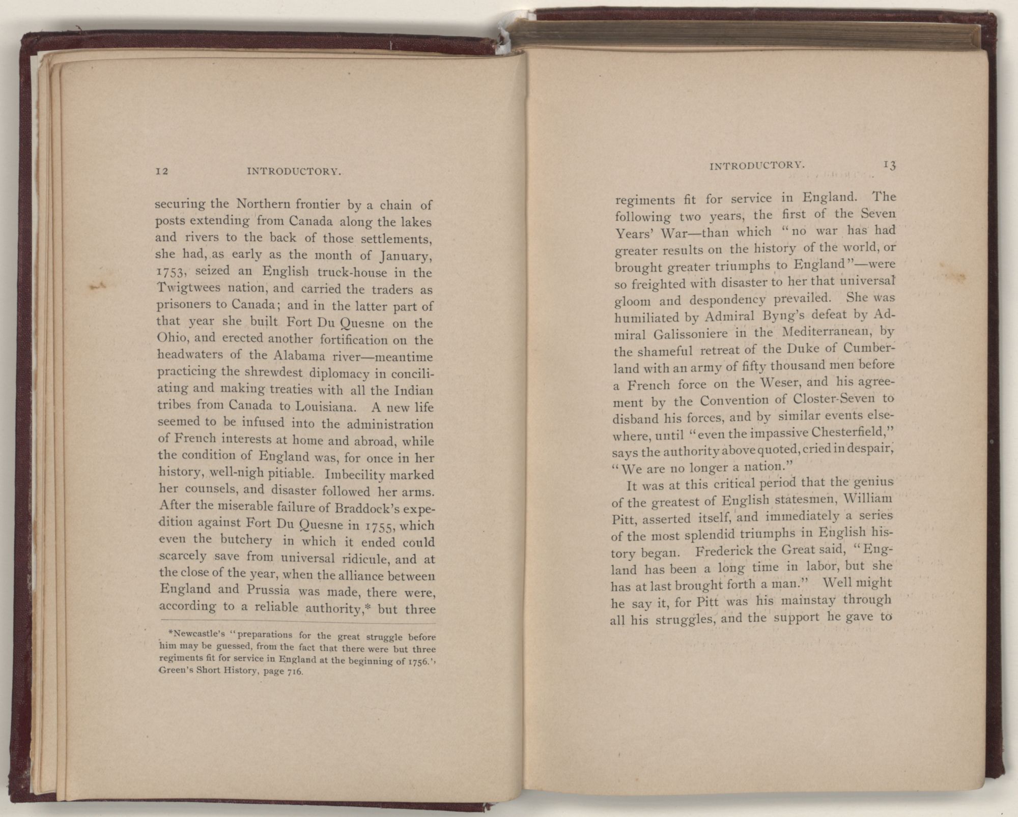 It was at this critical period that the genius of the greatest of English statesmen, William Pitt, asserted itself, and immediately a series of the most splendid triumphs in English history began. Frederick the Great said, “England has been a long time in labor, but she has at last brought forth a man.” Well might he say it, for Pitt was his mainstay through all his struggles, and the support he gave to