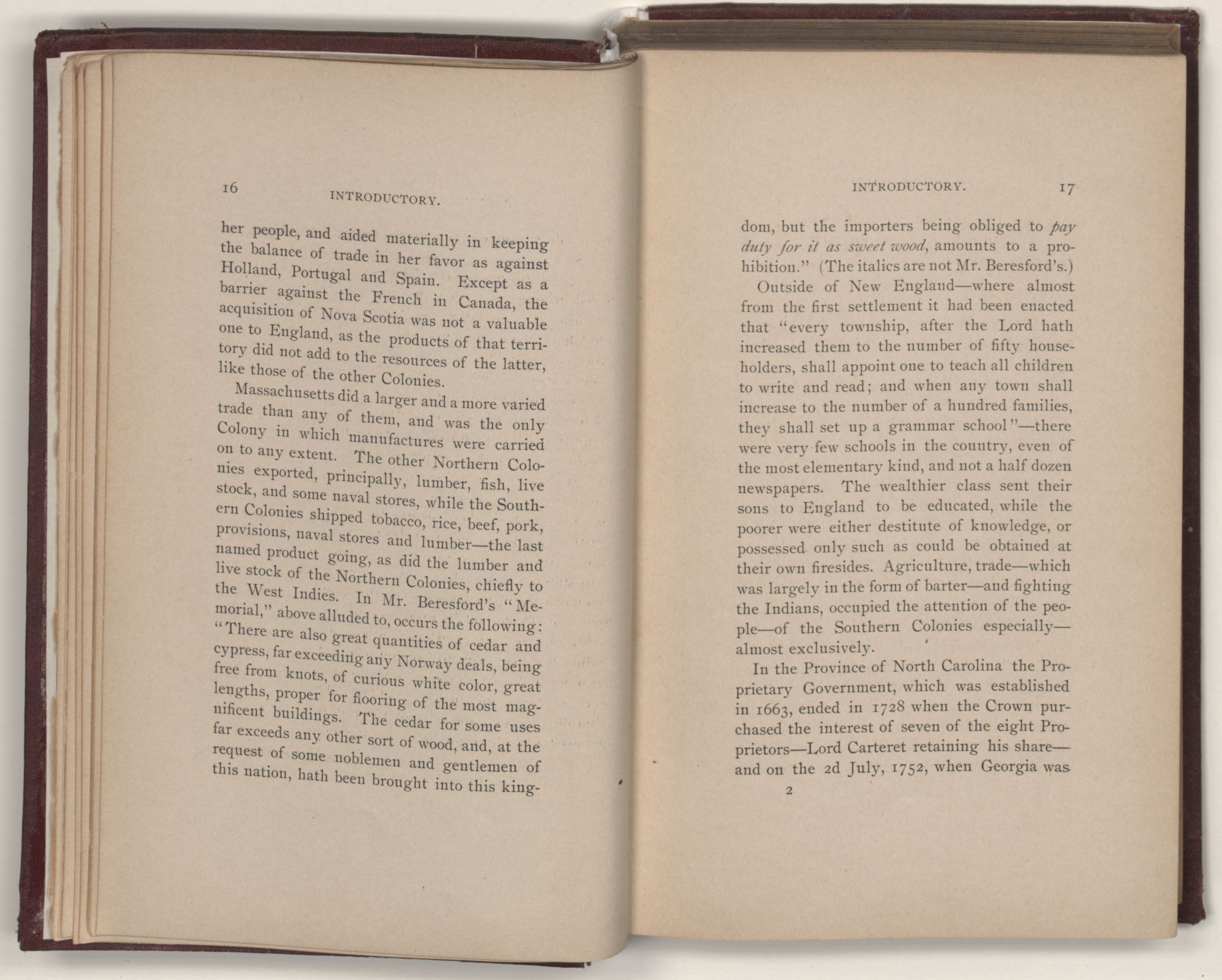 Massachusetts did a larger and a more varied trade than any of them, and was the only Colony in which manufactures were carried on to any extent. The other Northern Colonies exported, principally, lumber, fish, live stock, and some naval stores, while the Southern Colonies shipped tobacco, rice, beef, pork, provisions, naval stores and lumber—the last named product going, as did the lumber and live stock of the Northern Colonies, chiefly to the West Indies. In Mr. Beresford's “Memorial,” above alluded to, occurs the following: “There are also great quantities of cedar and cypress, far exceeding any Norway deals, being free from knots, of curious white color, great lengths, proper for flooring of the most magnificent buildings. The cedar for some uses far exceeds any other sort of wood, and, at the request of some noblemen and gentlemen of this nation, hath been brought into this kingdom,