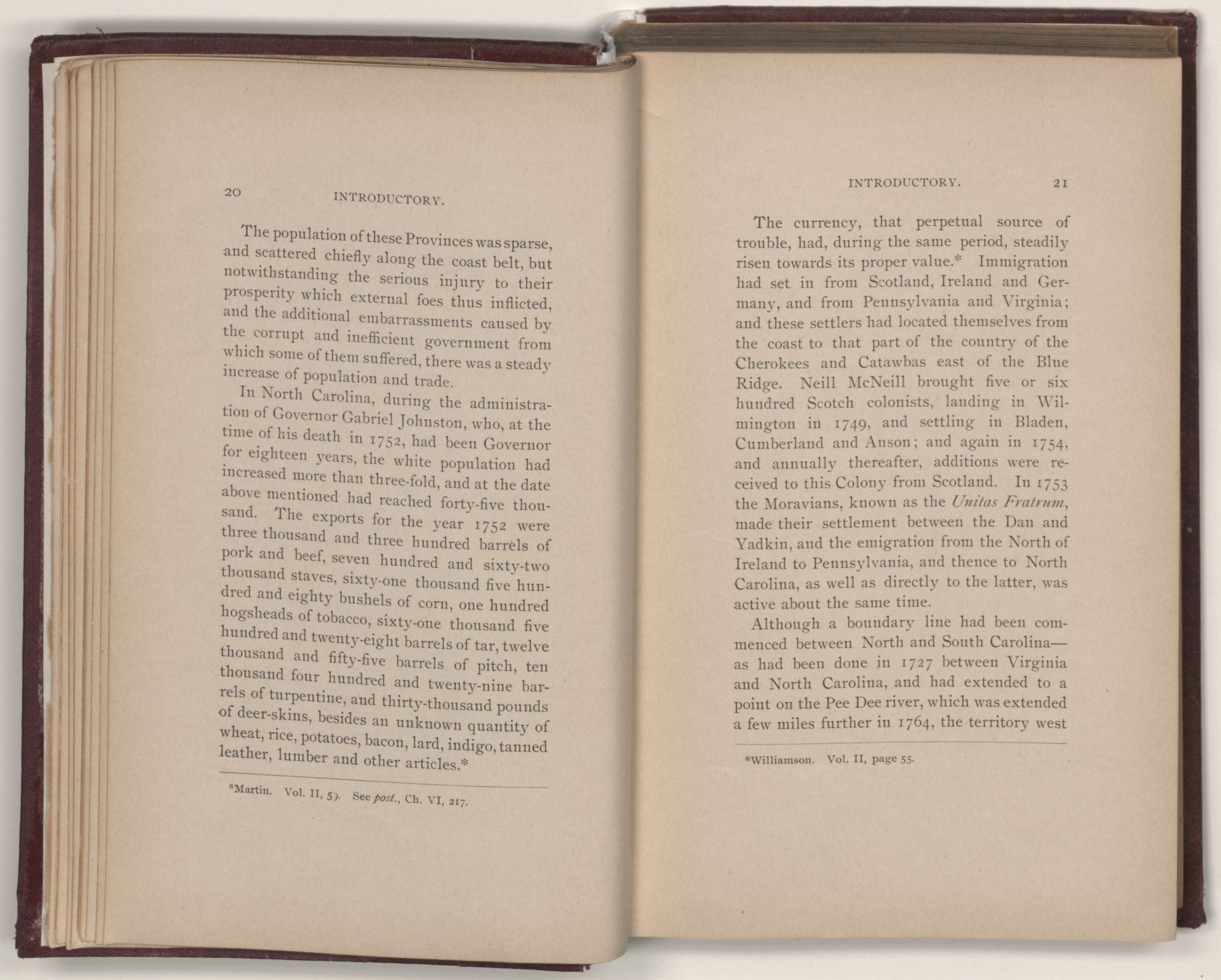 The currency, that perpetual source of trouble, had, during the same period, steadily risen towards its proper value.* Immigration had set in from Scotland, Ireland and Germany, and from Pennsylvania and Virginia; and these settlers had located themselves from the coast to that part of the country of the Cherokees and Catawbas east of the Blue Ridge. Neill McNeill brought five or six hundred Scotch colonists, landing in Wilmington in 1749, and settling in Bladen, Cumberland and Anson; and again in 1754, and annually thereafter, additions were received to this Colony from Scotland. In 1753 the Moravians, known as the Unitas Fratrum, made their settlement between the Dan and Yadkin, and the emigration from the North of Ireland to Pennsylvania, and thence to North Carolina, as well as directly to the latter, was active about the same time.