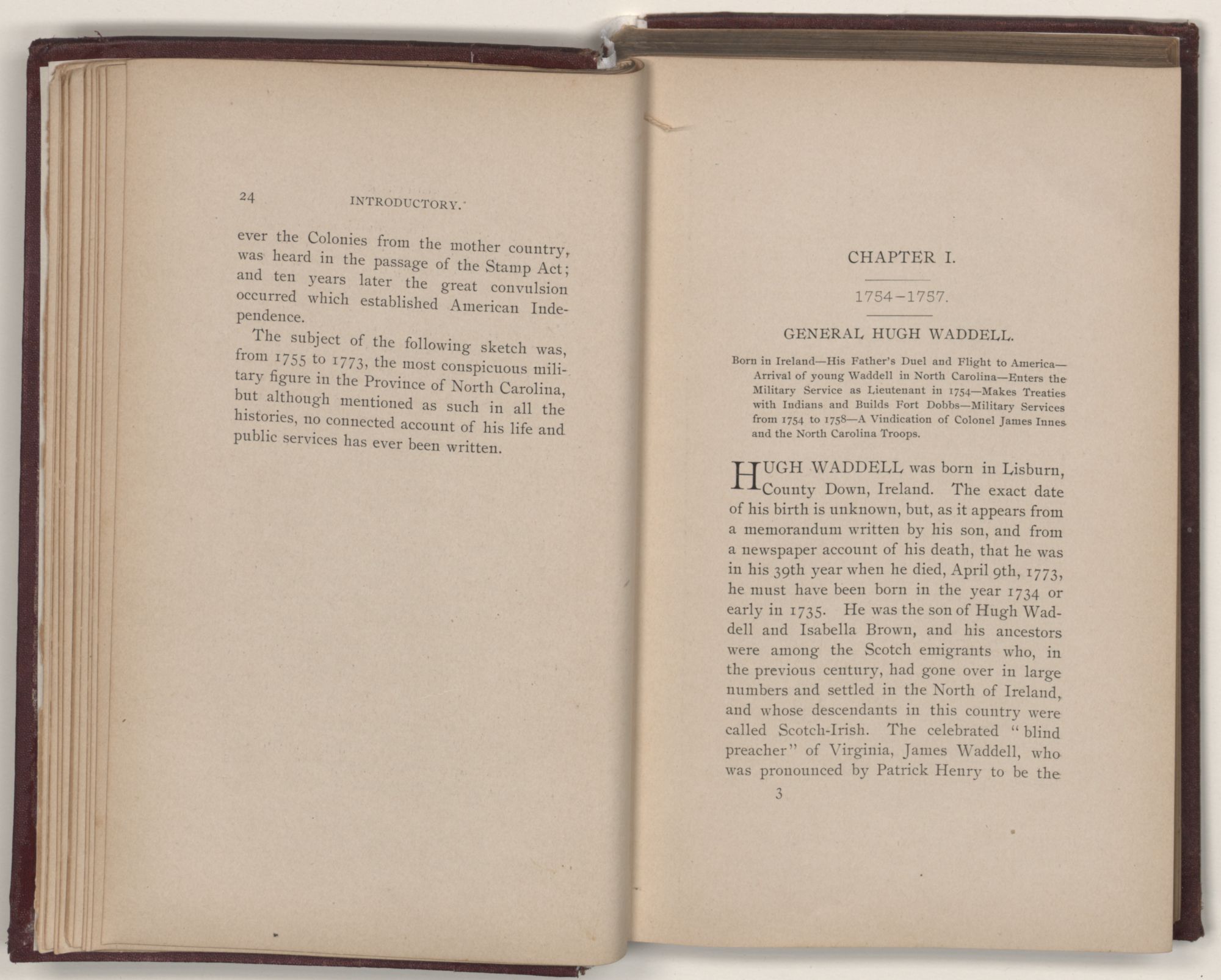 Born in Ireland—His Father's Duel and Flight to America—Arrival of young Waddell in North Carolina—Enters the Military Service as Lieutenant in 1754—Makes Treaties with Indians and Builds Fort Dobbs—Military Services from 1754 to 1758—A Vindication of Colonel James Innes and the North Carolina Troops.